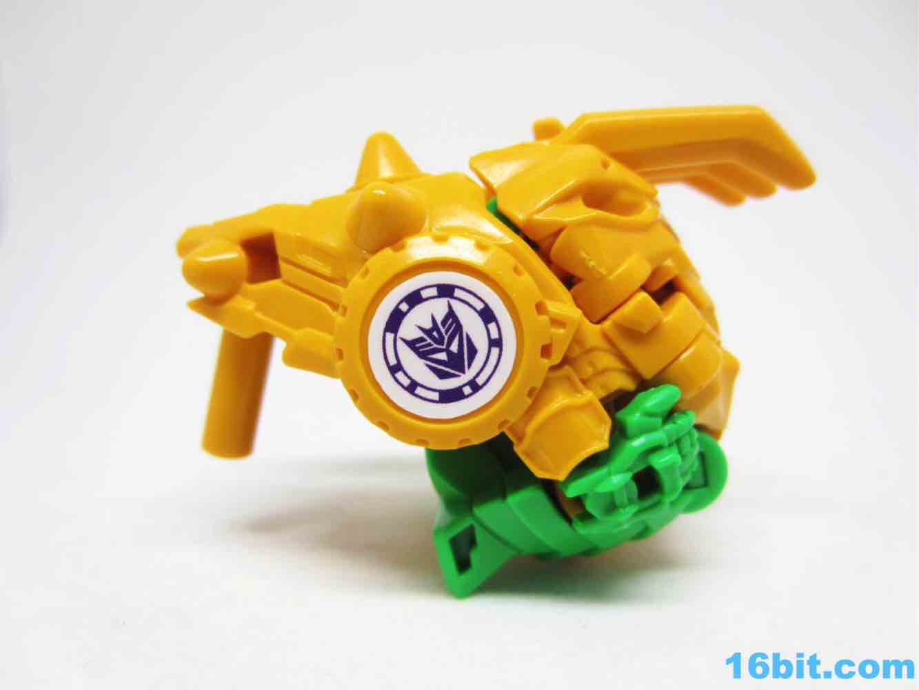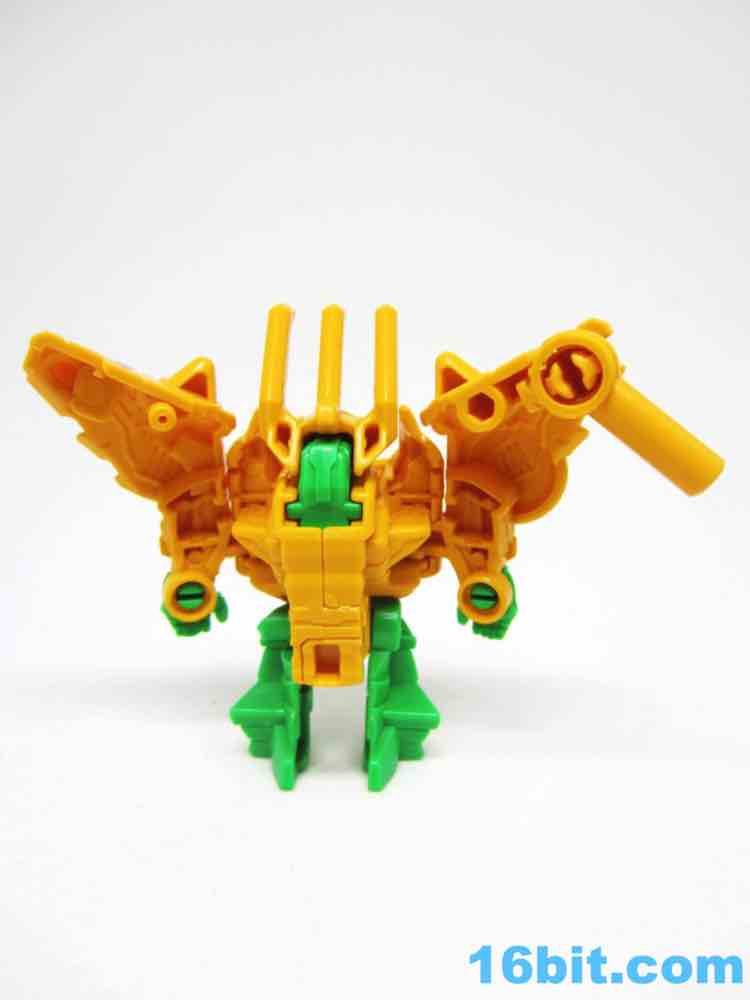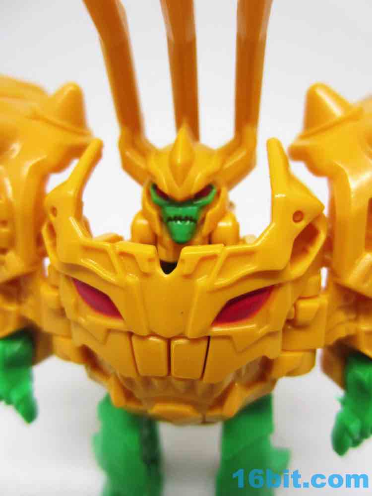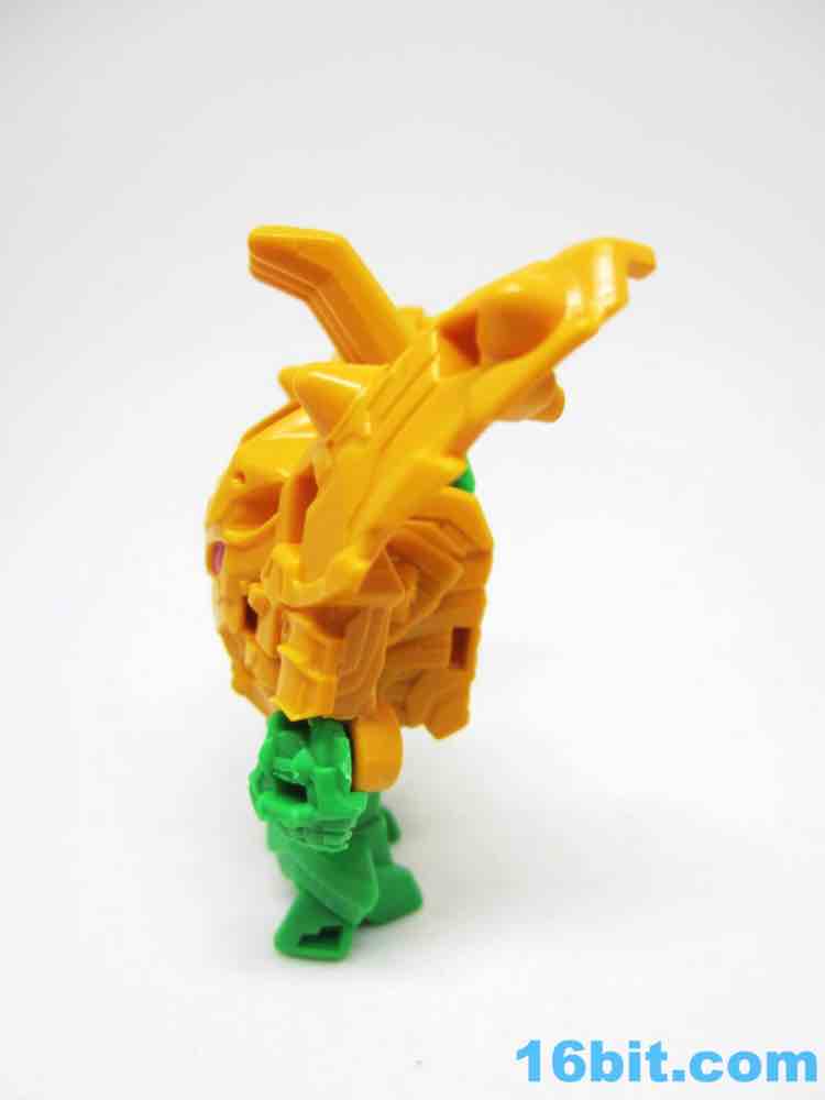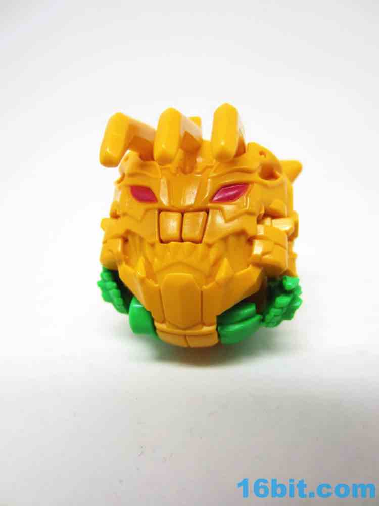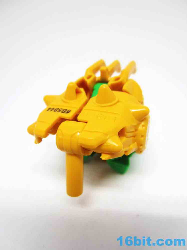 Last and familiarly least, Lord Doomitron has the most pompous name given its small stature. The same transformation was used on Bludgeon (from the Mini-Con + Optimus pack) and the purple and black recolor of this very toy, coming soon. It's basically a big ball with a claw on it, which works nicely as a fist-based melee weapon. The weapon mode has a big face and looks pretty evil, despite being the same green and gold colors of my elementary school. The pointy thorny details are nice, as is a big yellow Vega claw on the back. He's got little red eyes, a jagged mouth, and some decent detail which shows up nicely in yellow plastic. It's also a toy named "Lord Doomitron" that's colored like a Crayola box. Be careful with his tiny hands - they pop out in my sample without too much provocation. These toys have clever transformations, but seemingly no metal pins. That's unusual.