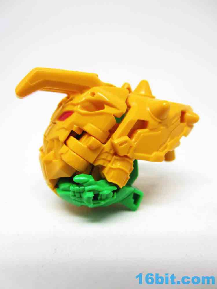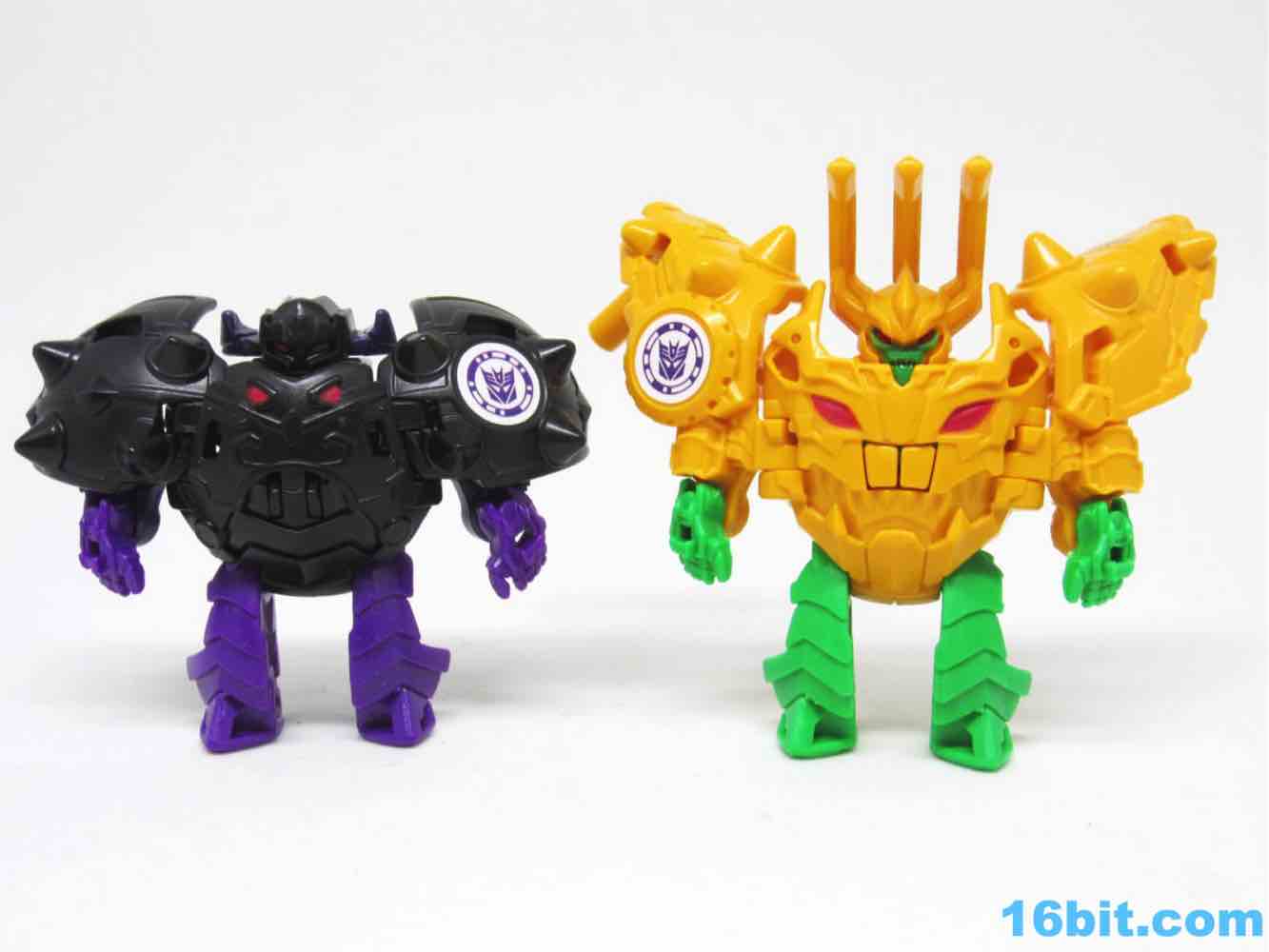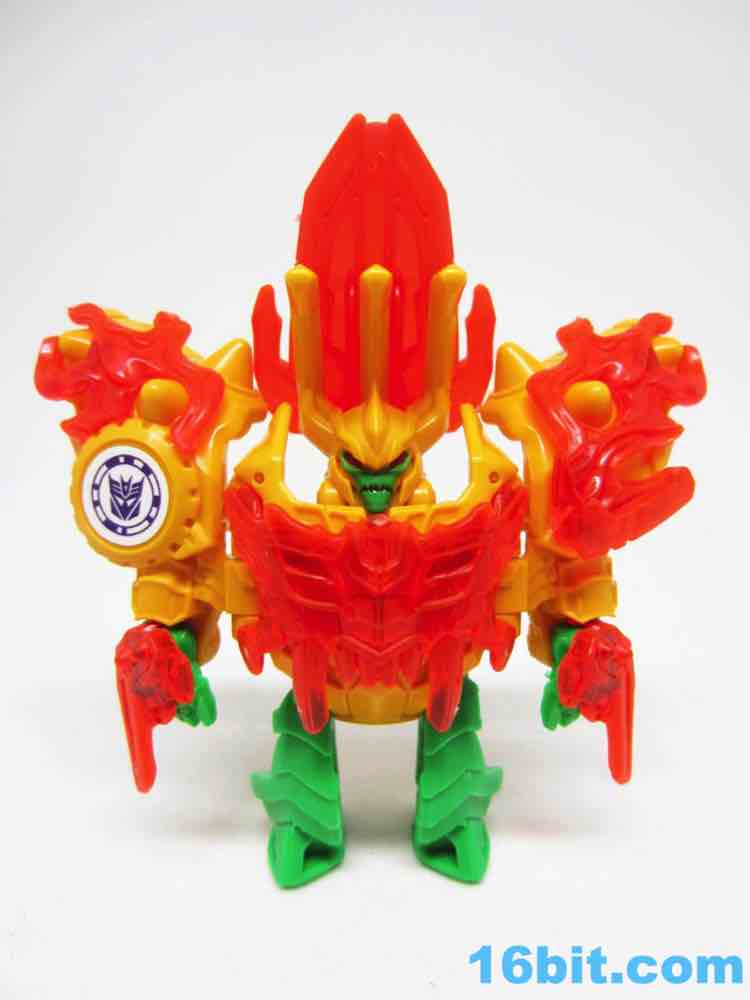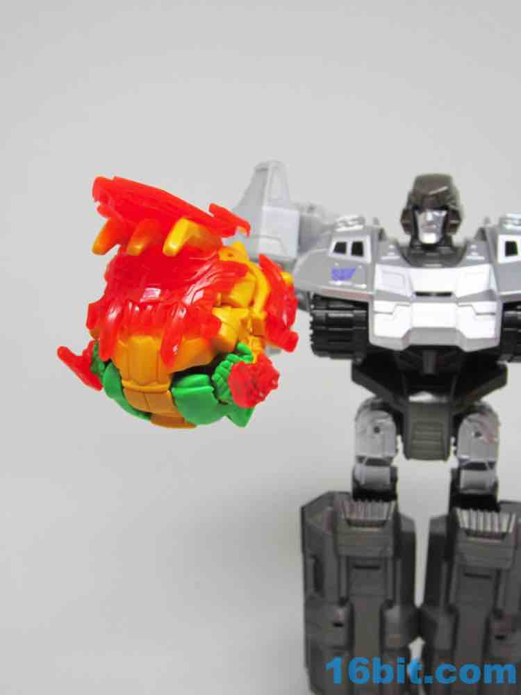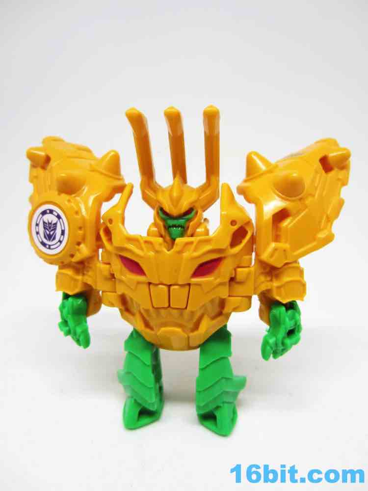 Last and familiarly least, Lord Doomitron has the most pompous name given its small stature. The same transformation was used on Bludgeon (from the Mini-Con + Optimus pack) and the purple and black recolor of this very toy, coming soon. It's basically a big ball with a claw on it, which works nicely as a fist-based melee weapon. The weapon mode has a big face and looks pretty evil, despite being the same green and gold colors of my elementary school. The pointy thorny details are nice, as is a big yellow Vega claw on the back. He's got little red eyes, a jagged mouth, and some decent detail which shows up nicely in yellow plastic. It's also a toy named "Lord Doomitron" that's colored like a Crayola box. Be careful with his tiny hands - they pop out in my sample without too much provocation. These toys have clever transformations, but seemingly no metal pins. That's unusual.