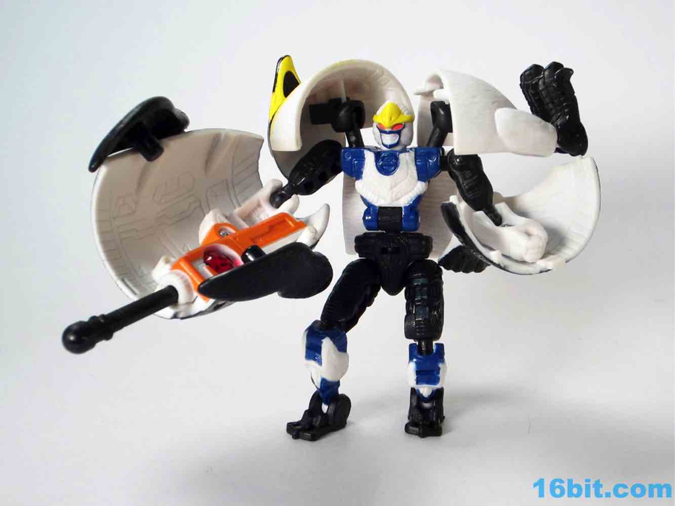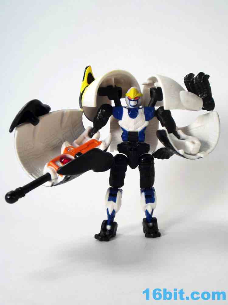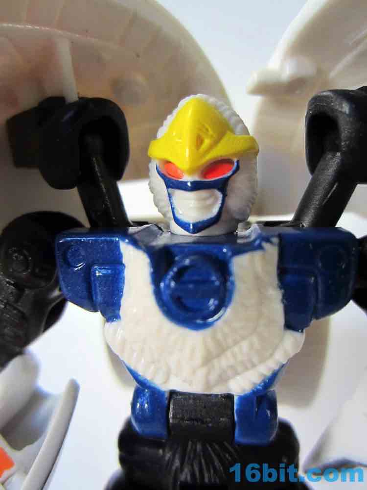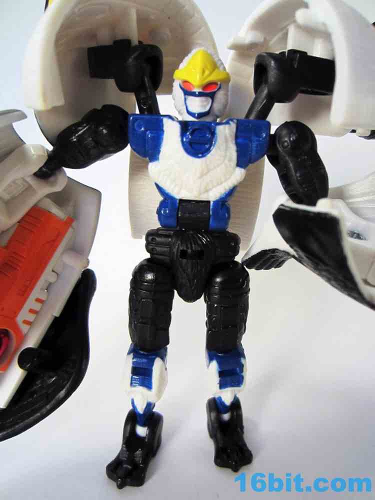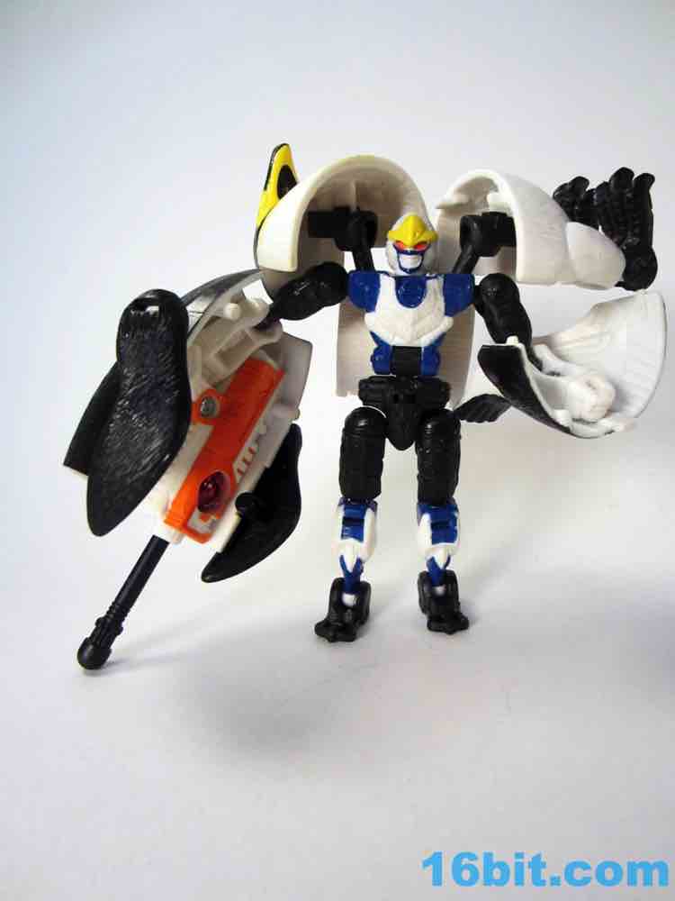The robot is similar in size to basic toys of the day, and has a range of movement very similar to Terragator - 12 points of articulation plus a bonus moving part for the non-removable right arm cannon make for a decent Cybertronian. If the shell bits could be removed, this toy would've made a great Pretender since you see none of the robot parts in beast mode. Getting him to stand isn't too tricky, and I like how the cold bird motif carries over to the robot with a "beak" on his head and an icy blue and white chest. The spark crystal on the arm cannon is cool and the bright orange looks great. If you can get past the "shellformer".shtmlect of the toy, it's actually pretty cute. I don't think I'd have liked it as a child, but as someone old enough to know better I quite enjoy it..