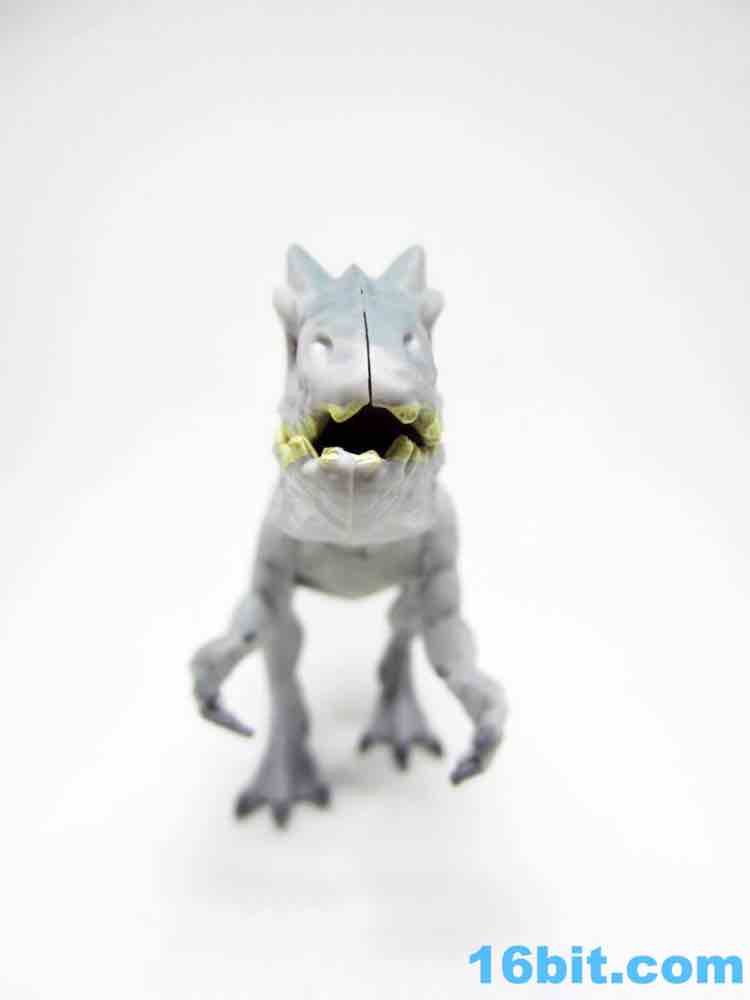 The figure is light on paint, but not devoid of it - note her light grey claws with matching skin coloring on her back. There are some spots colored on the skull as well, which really highlights how the design tried to look sort of like an actual bony skull. You can see where the holes are. Her white teeth act as a fence to the pink interior of her mouth, and she has creepy red eyes with black outlines to help them pop just a bit. It's not a perfect replica of the movie, but it's a pretty good little toy in its own right. It also stands without putting up a fight, which I really appreciate in my dino toys.