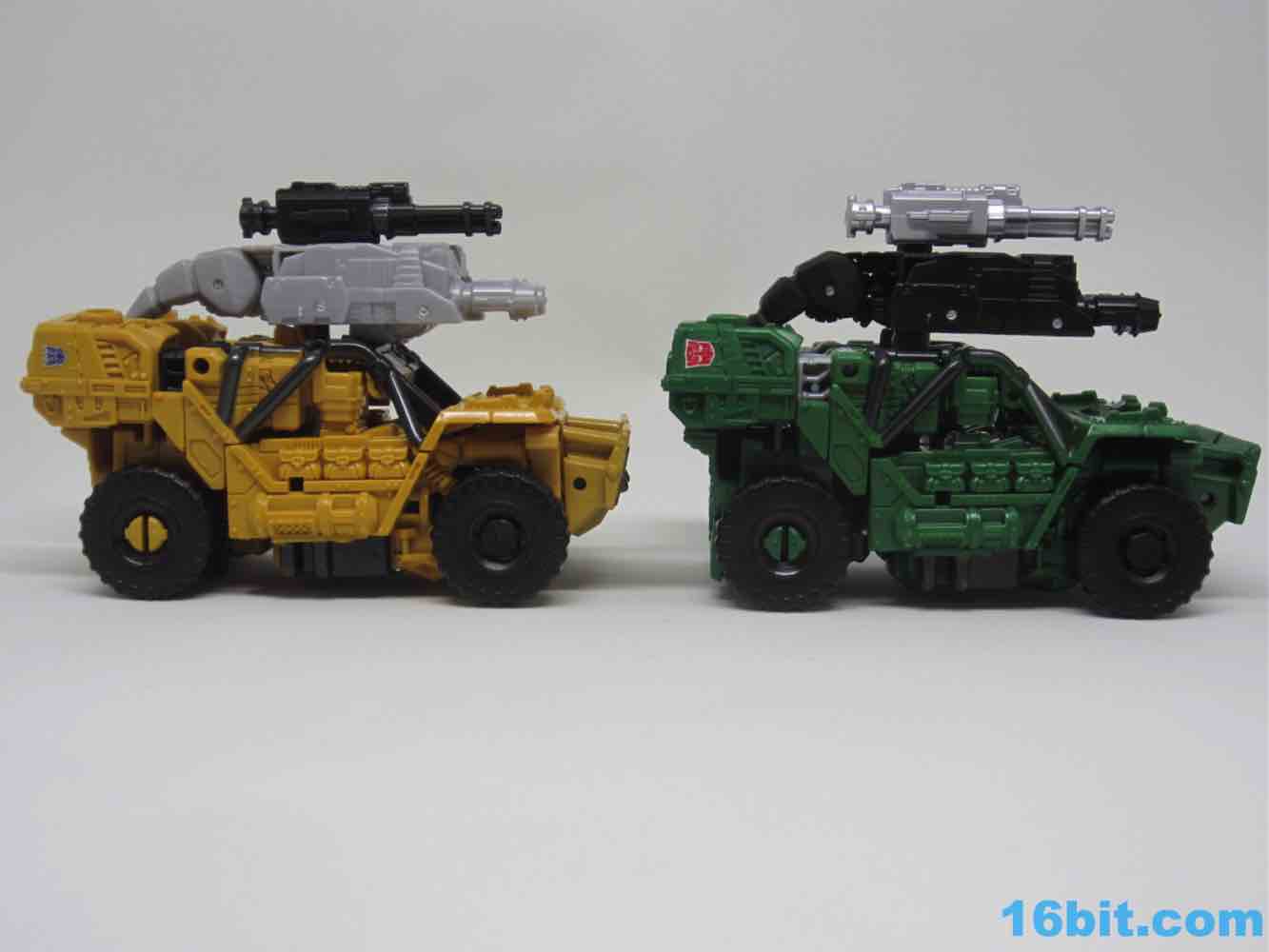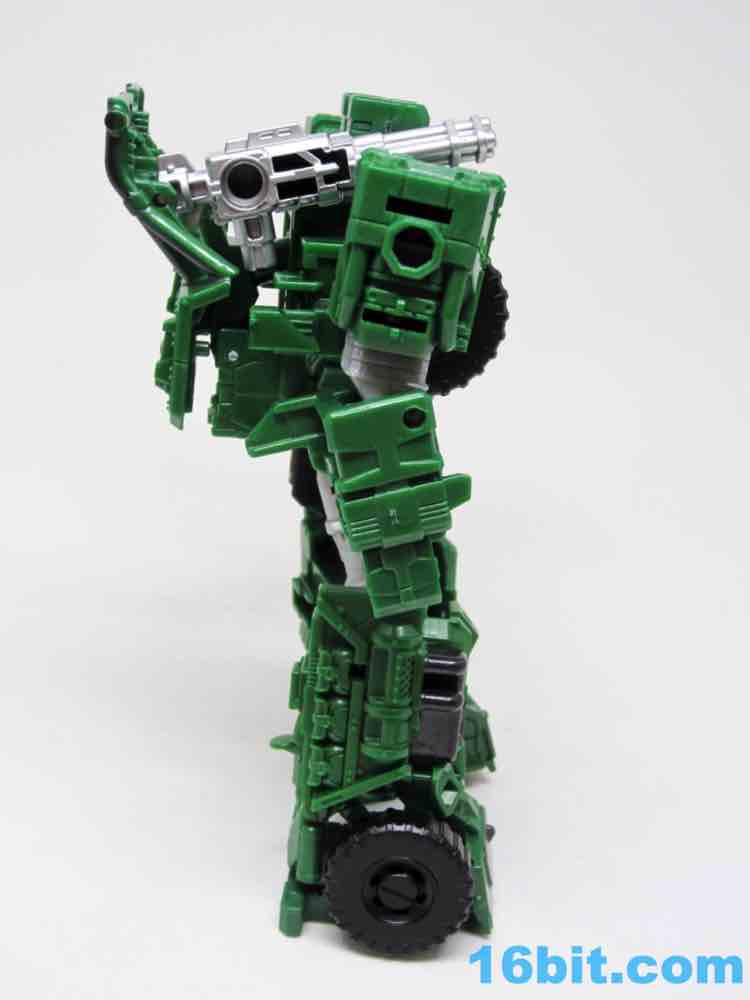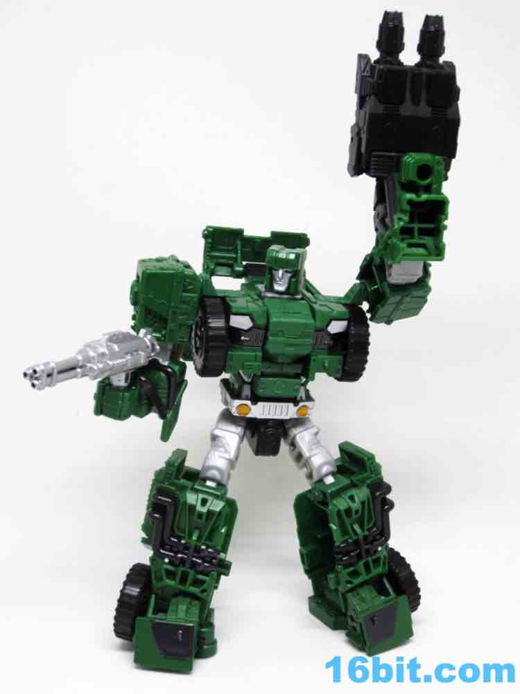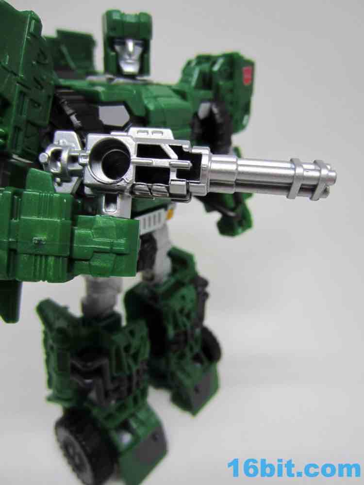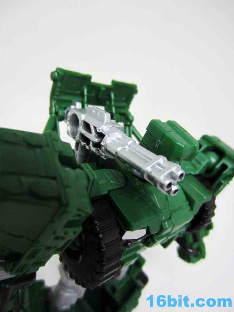 There are some notable difference in deco between robot modes, notably Hound adds a fake Jeep grille and headlights as a belt instead of chest deco, and a heavy slathering of silver paint made his gun look pretty. Little "lights" are painted near his shoulders, but on the whole he's just very green. Very green. I don't know if the head is a real improvement, but as a combined toy you won't see it anyway. Articulation is good, roughly the same as his peers with about 15 points. You can't really mount Hound's gun on his shoulder, but it was retooled slightly so that it can be mounted on the car kibble on his back. It's pretty neat. Swindle was similarly retooled during his run, but my sample - and a lot of the early ones - don't have the tabs for mounting.