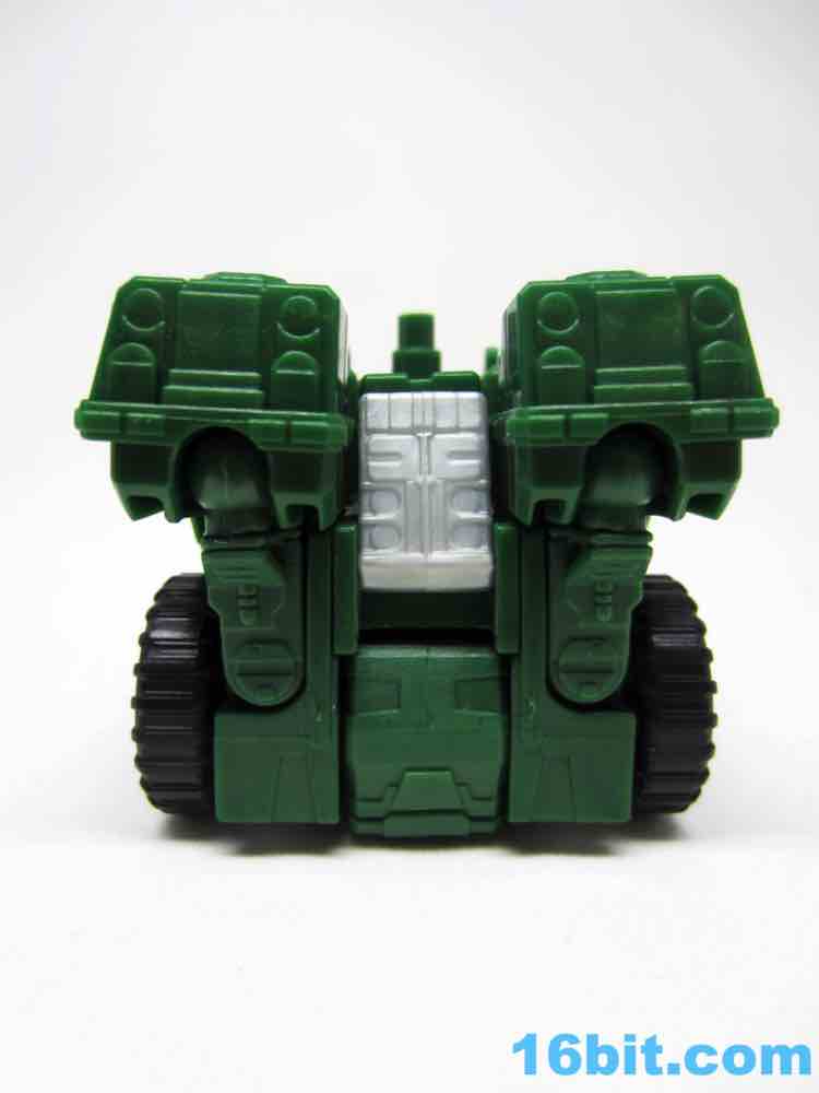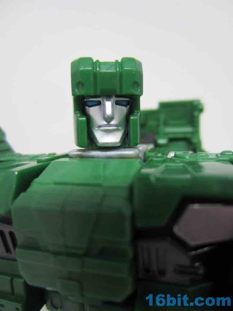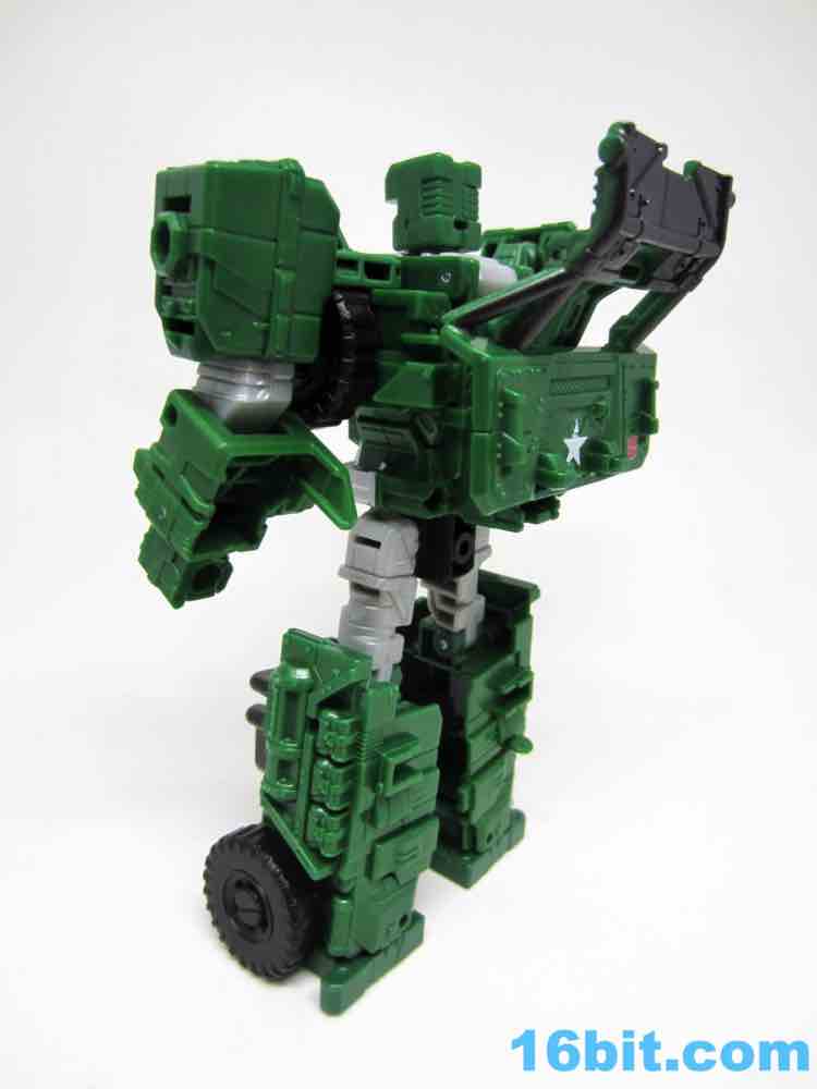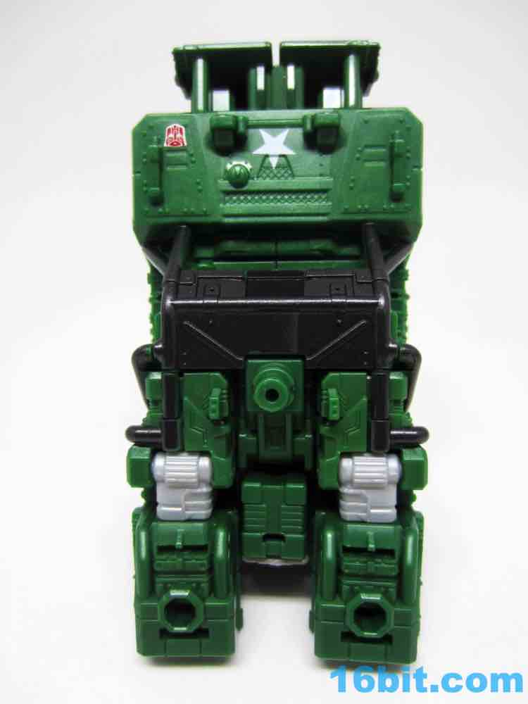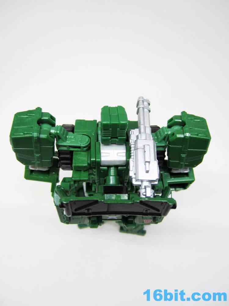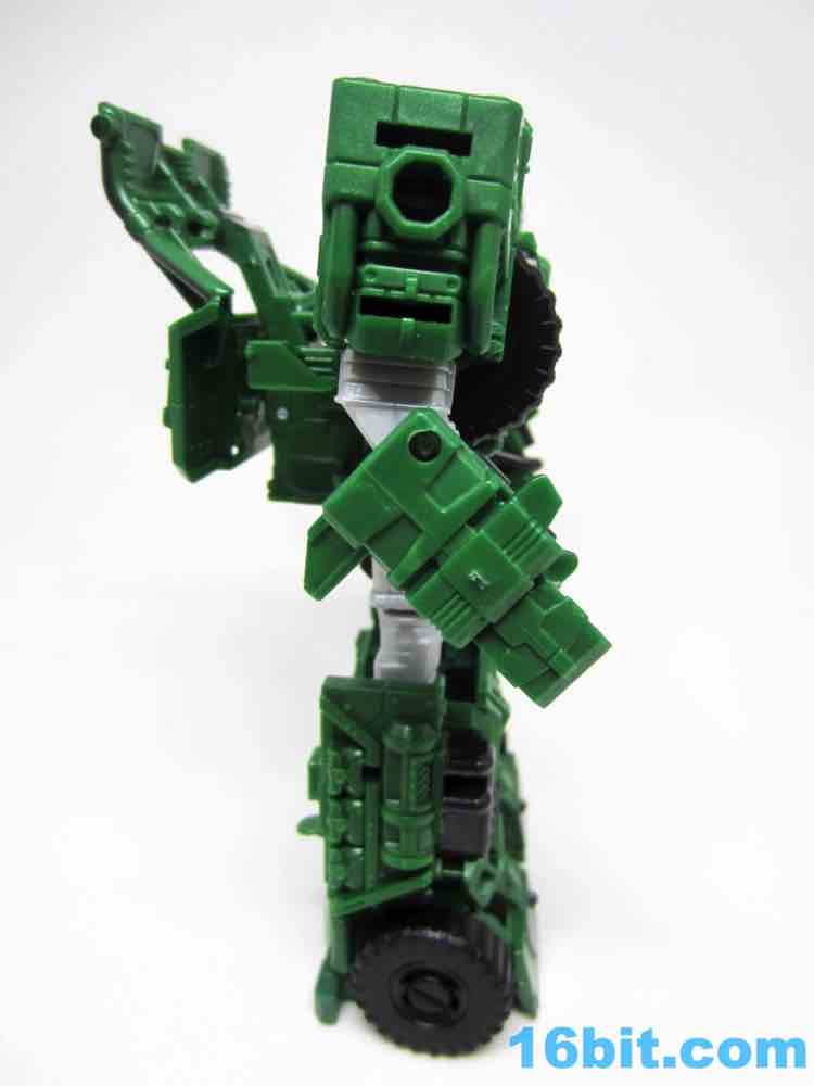 There are some notable difference in deco between robot modes, notably Hound adds a fake Jeep grille and headlights as a belt instead of chest deco, and a heavy slathering of silver paint made his gun look pretty. Little "lights" are painted near his shoulders, but on the whole he's just very green. Very green. I don't know if the head is a real improvement, but as a combined toy you won't see it anyway. Articulation is good, roughly the same as his peers with about 15 points. You can't really mount Hound's gun on his shoulder, but it was retooled slightly so that it can be mounted on the car kibble on his back. It's pretty neat. Swindle was similarly retooled during his run, but my sample - and a lot of the early ones - don't have the tabs for mounting.