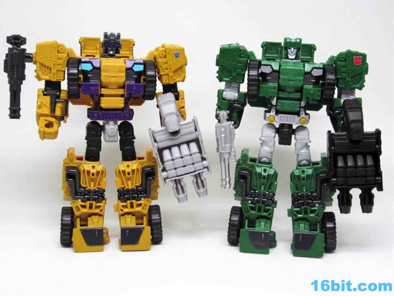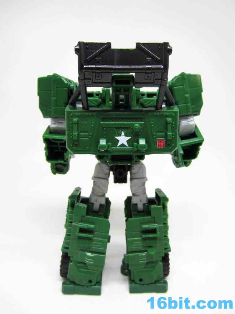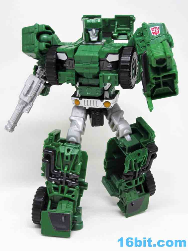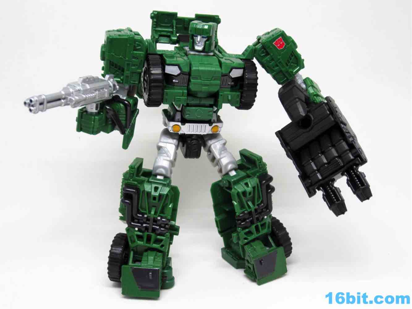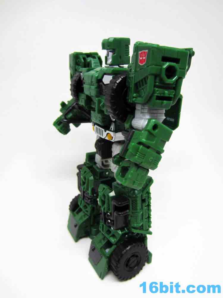 There are some notable difference in deco between robot modes, notably Hound adds a fake Jeep grille and headlights as a belt instead of chest deco, and a heavy slathering of silver paint made his gun look pretty. Little "lights" are painted near his shoulders, but on the whole he's just very green. Very green. I don't know if the head is a real improvement, but as a combined toy you won't see it anyway. Articulation is good, roughly the same as his peers with about 15 points. You can't really mount Hound's gun on his shoulder, but it was retooled slightly so that it can be mounted on the car kibble on his back. It's pretty neat. Swindle was similarly retooled during his run, but my sample - and a lot of the early ones - don't have the tabs for mounting.