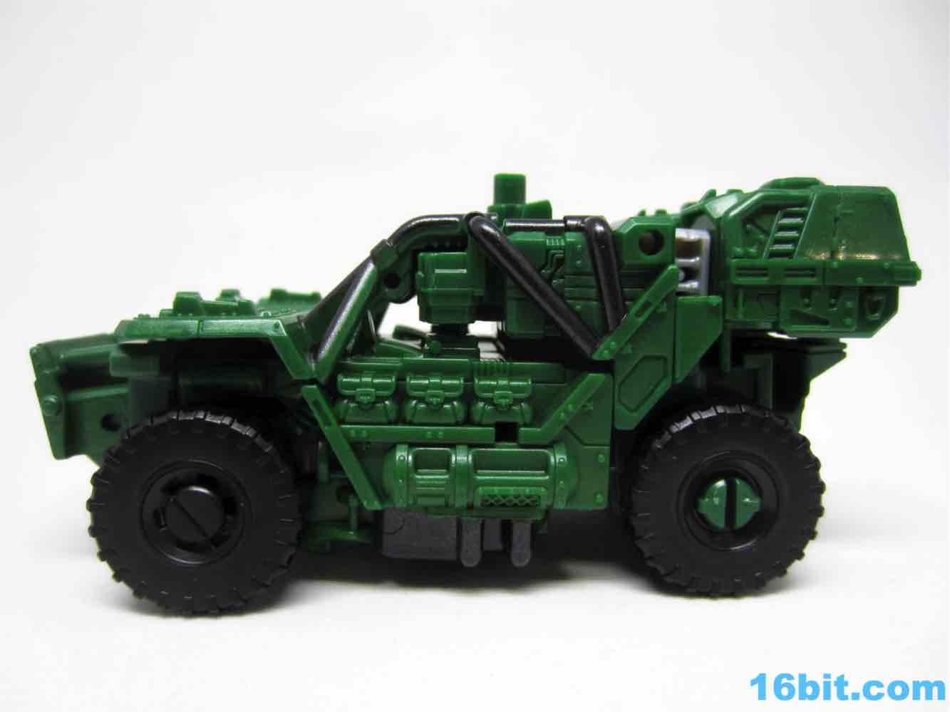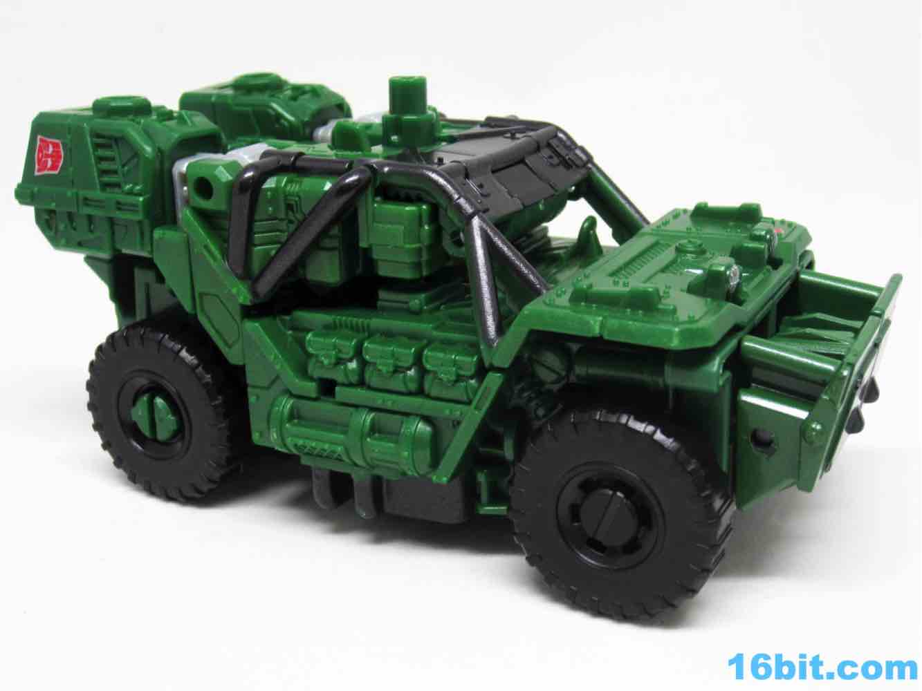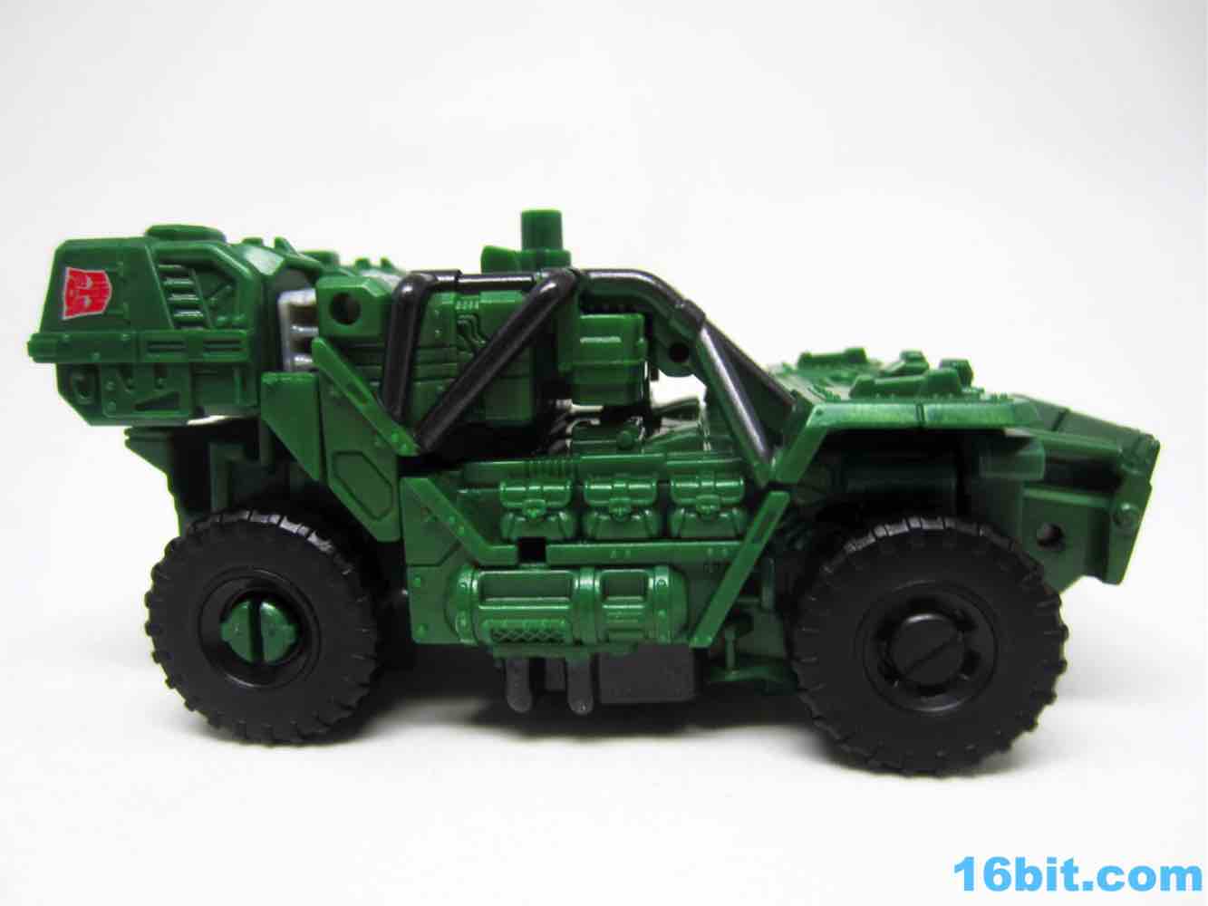 The hand/foot/gun is the same as Swindle's, and it mounts just as nicely. The dune buggy-esque mode is similar to Swindle's as well, but now in a nice rich green color. He has a nice big star on his hood, a tiny little Autobot symbol, and not a lot else.