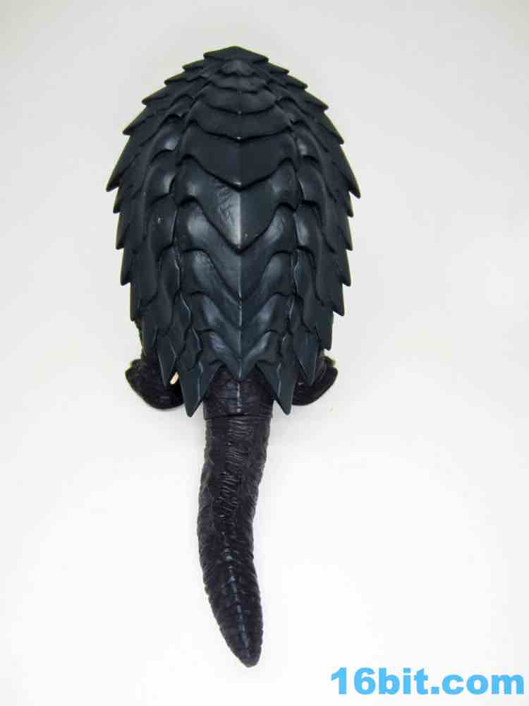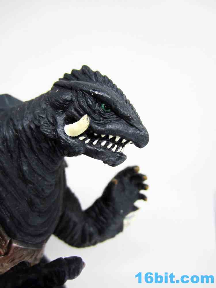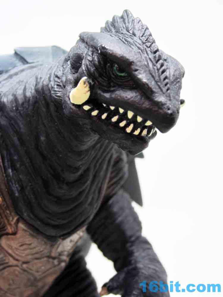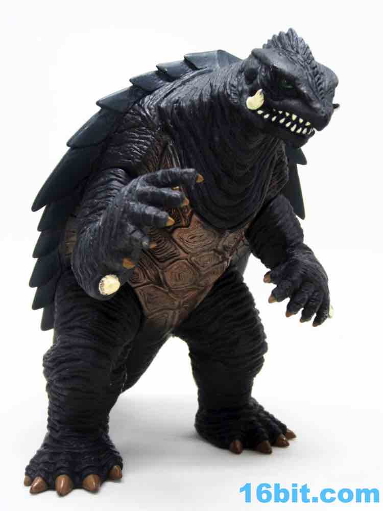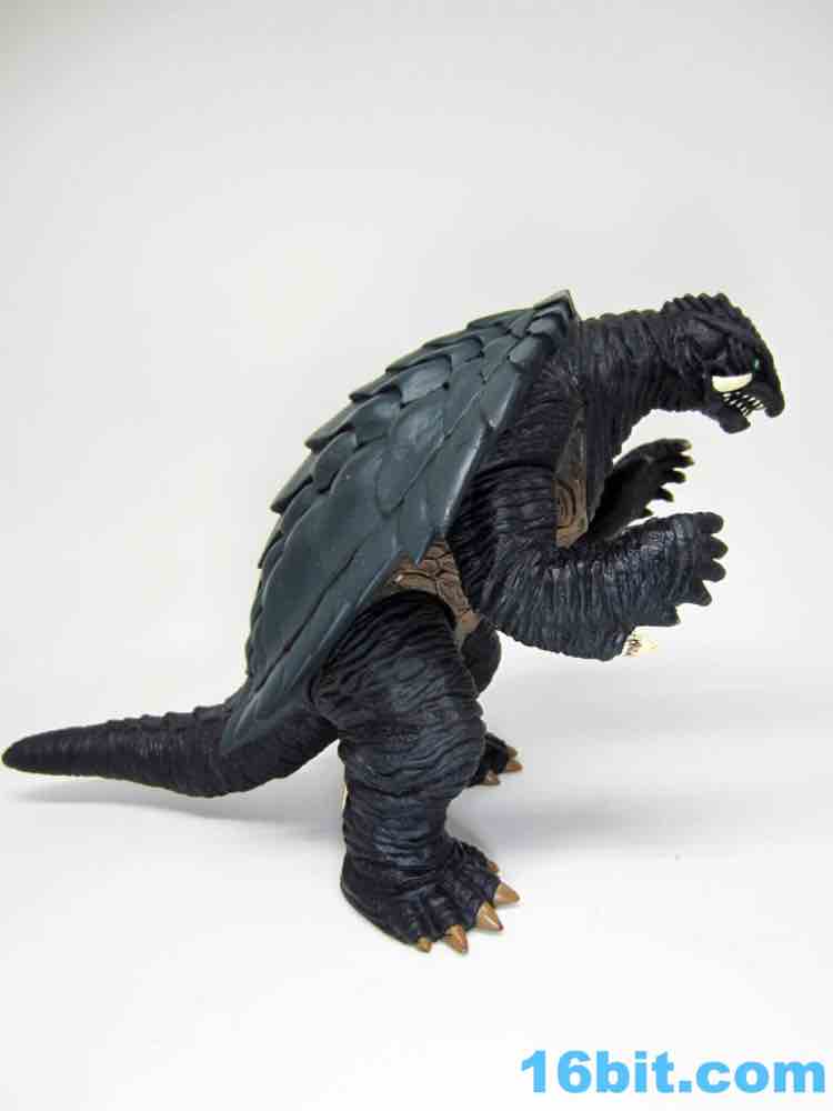 At 5-inches tall, he's a bit shorter than Toho's monster toys. Marked on the feet with some Japanese I can't read as well as 1999 TNHN and BANDAI 2005 MADE IN CHINA 39916, this little guy looks a lot like a mean, mutant turtle and not immediately like a friend to children. His tusks and teeth are a lot more sinister now that his eyes are smaller, and sure enough his hands and feet look a lot like a mutated turtle. They're wide and broad, wrinkly and significantly less fanciful than monsters of the contemporary Godzilla films. His shell is pointy and jagged, and he's got a long tail - I assume because it looks cool.