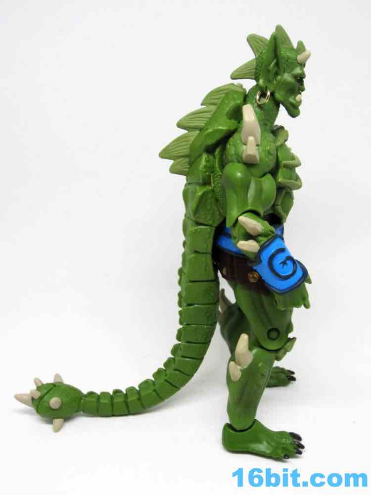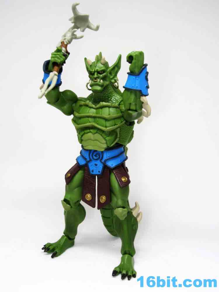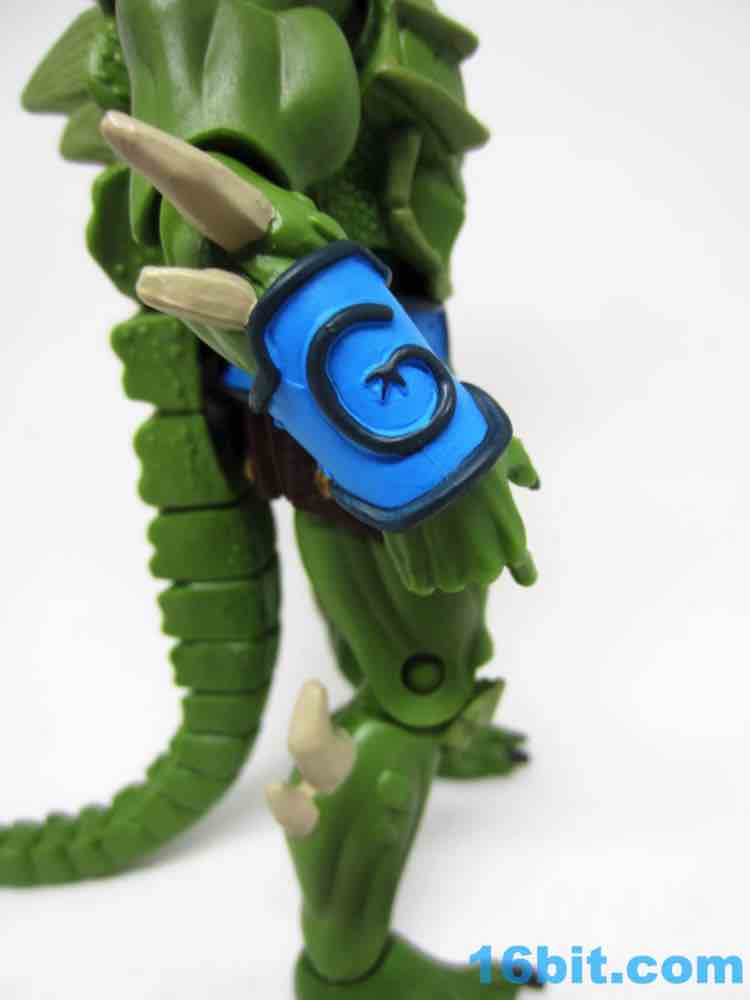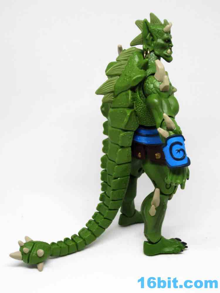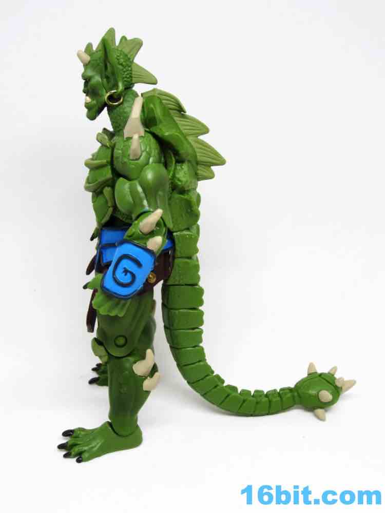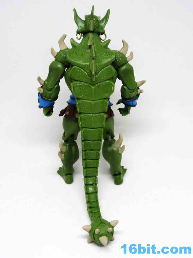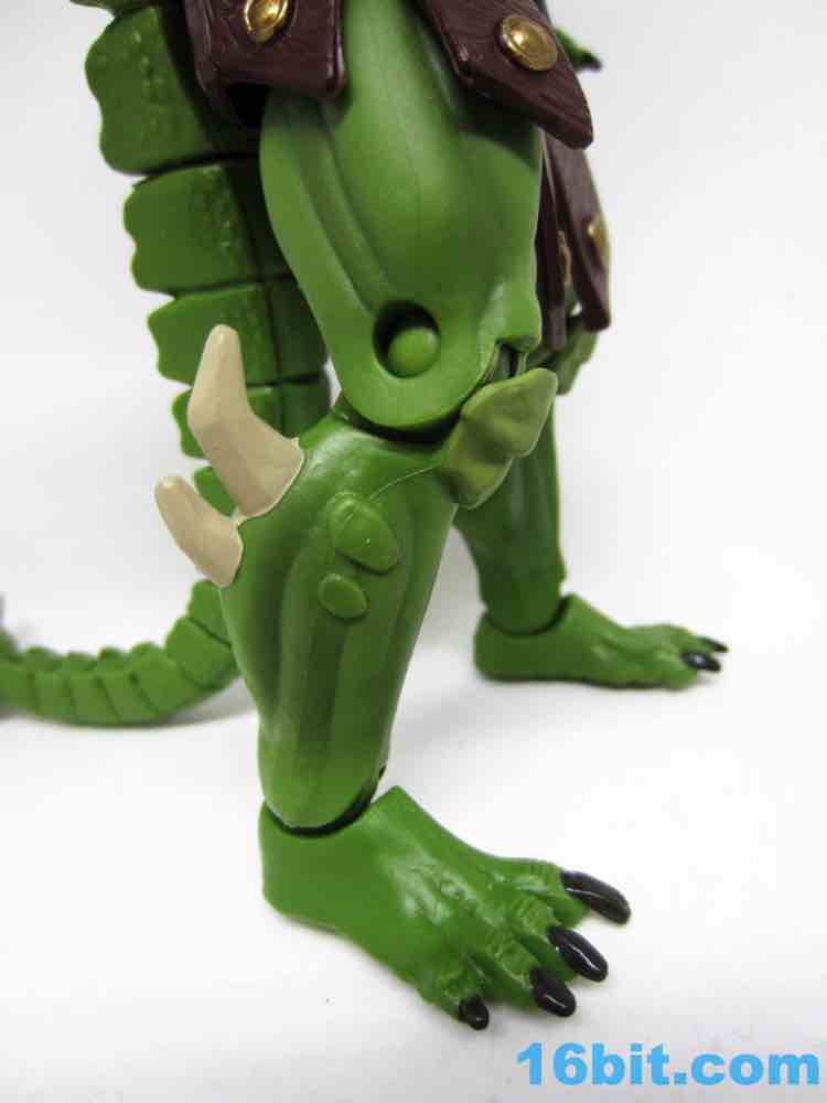 You have to plug the tail in place, and it helps keep him standing. The feet are similar to other figures like Demo Man - clawed, green, and not able to rock. They're good enough for the figure, as, well, let's be honest - you're not going to be doing a ton with this guy. He can stand, and he can stand in other, similar positions. His weapon is some sort of bone-based backscratcher, or at least I think that's what it is. You can tell me if I'm wrong. It's a little loose in his right hand, but it fits - that's what we need. It's also worth noting that a couple of the spikes on the back were bent on my sample, so I should probably dip him in some boiling water and fix those. On the whole, though, he came out pretty much exactly as good as you might want.