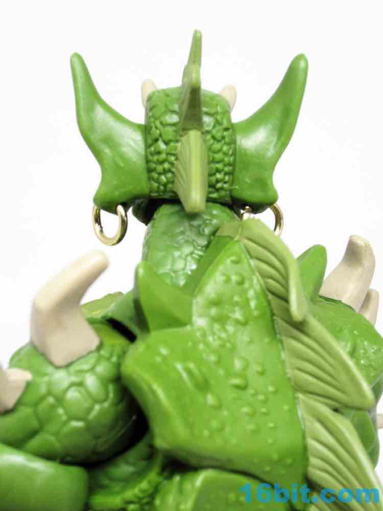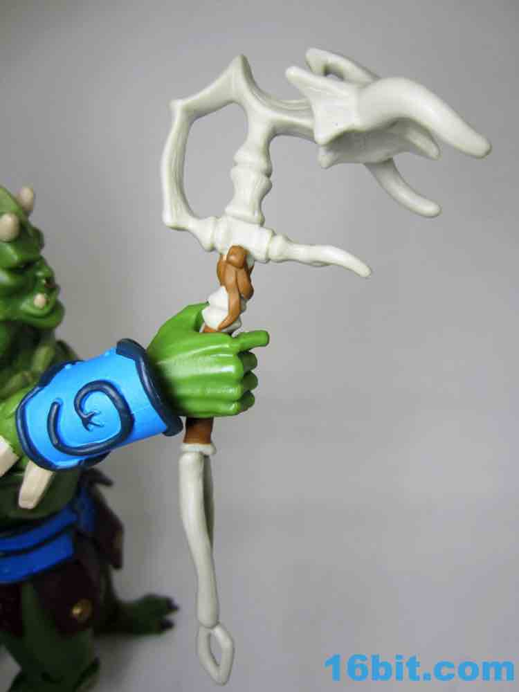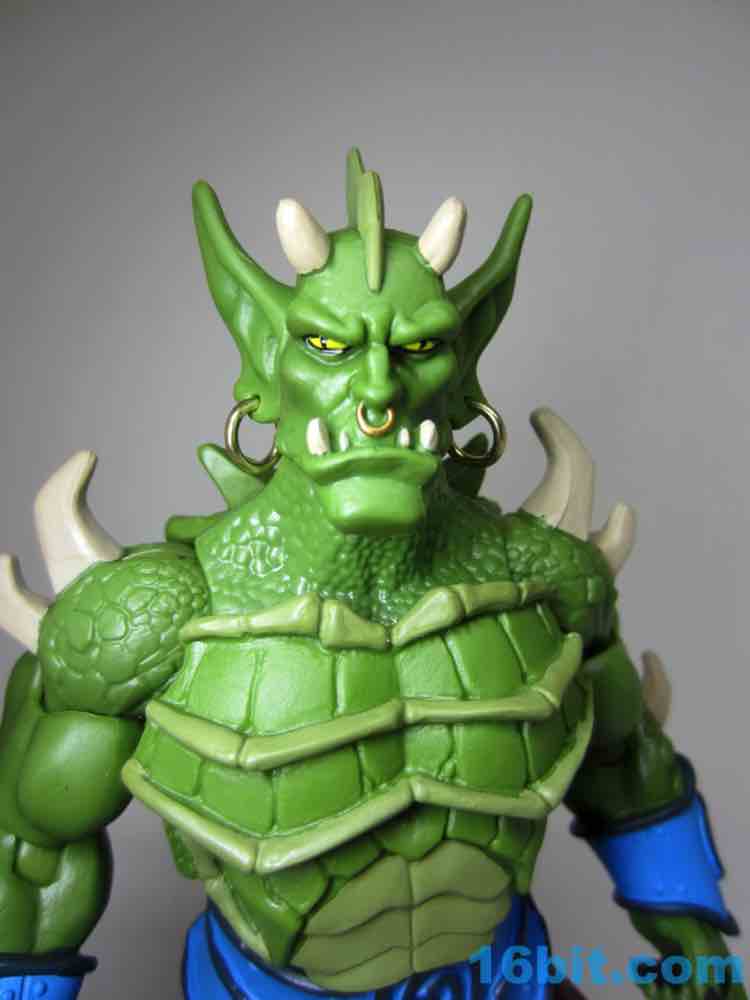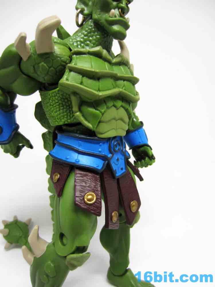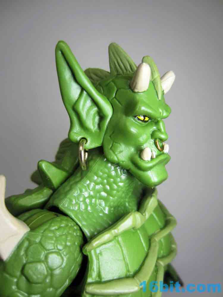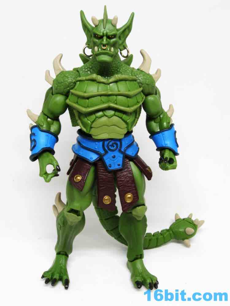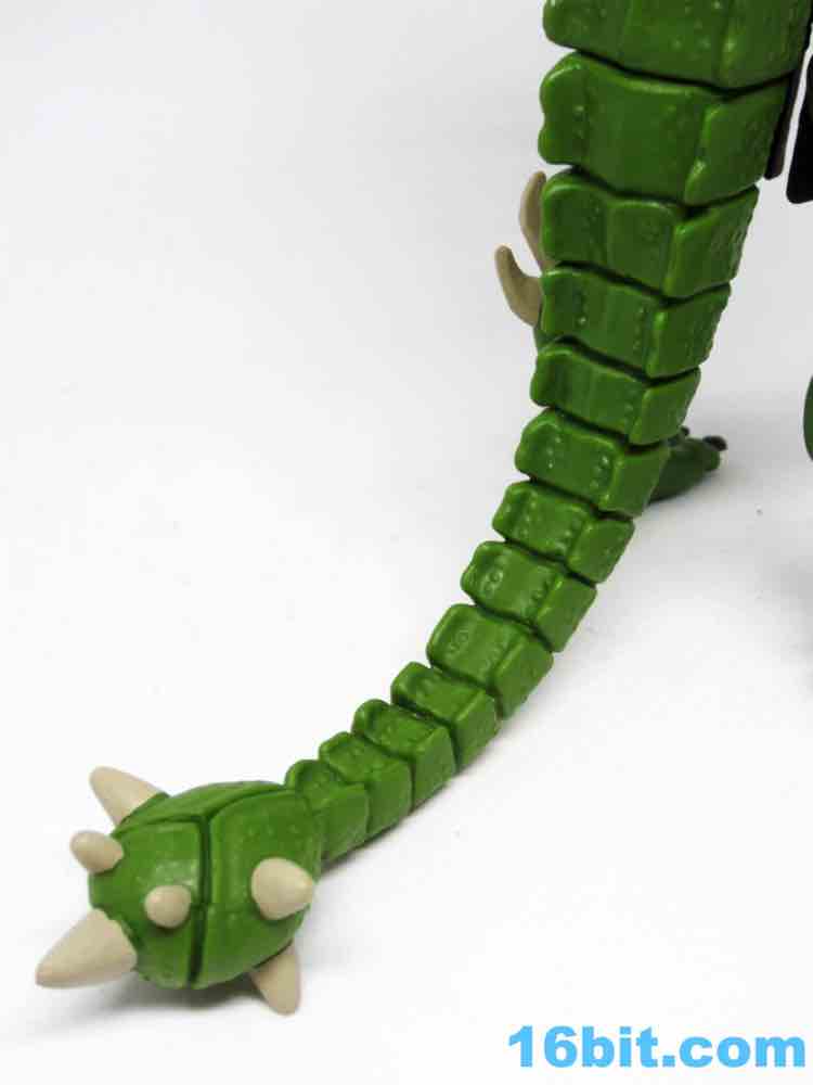 You have to plug the tail in place, and it helps keep him standing. The feet are similar to other figures like Demo Man - clawed, green, and not able to rock. They're good enough for the figure, as, well, let's be honest - you're not going to be doing a ton with this guy. He can stand, and he can stand in other, similar positions. His weapon is some sort of bone-based backscratcher, or at least I think that's what it is. You can tell me if I'm wrong. It's a little loose in his right hand, but it fits - that's what we need. It's also worth noting that a couple of the spikes on the back were bent on my sample, so I should probably dip him in some boiling water and fix those. On the whole, though, he came out pretty much exactly as good as you might want.