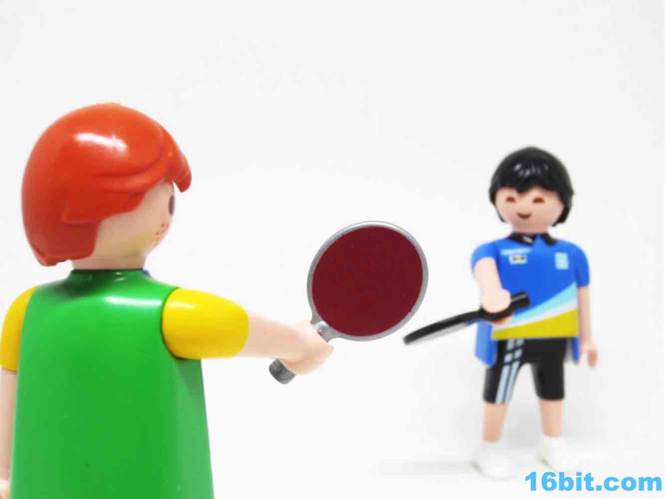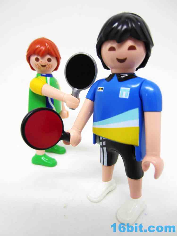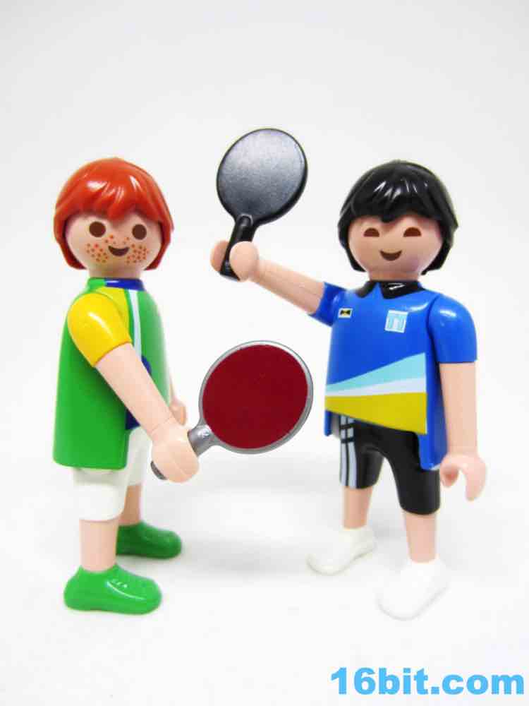 Nifty shirts will probably distract you from the lack of a table on the box - I certainly missed it, as the box is sizable for two figures. The two paddles are sized right, and are tiny accessories that may not satisfy. One is silver, one is black. Each has one red side and one black side. They are not textured. I'd say they look pretty good, but the incomplete nature of the sport gives me the same feeling as if they put out two dudes in suits with a stick as a "Pool Shark" bundle.