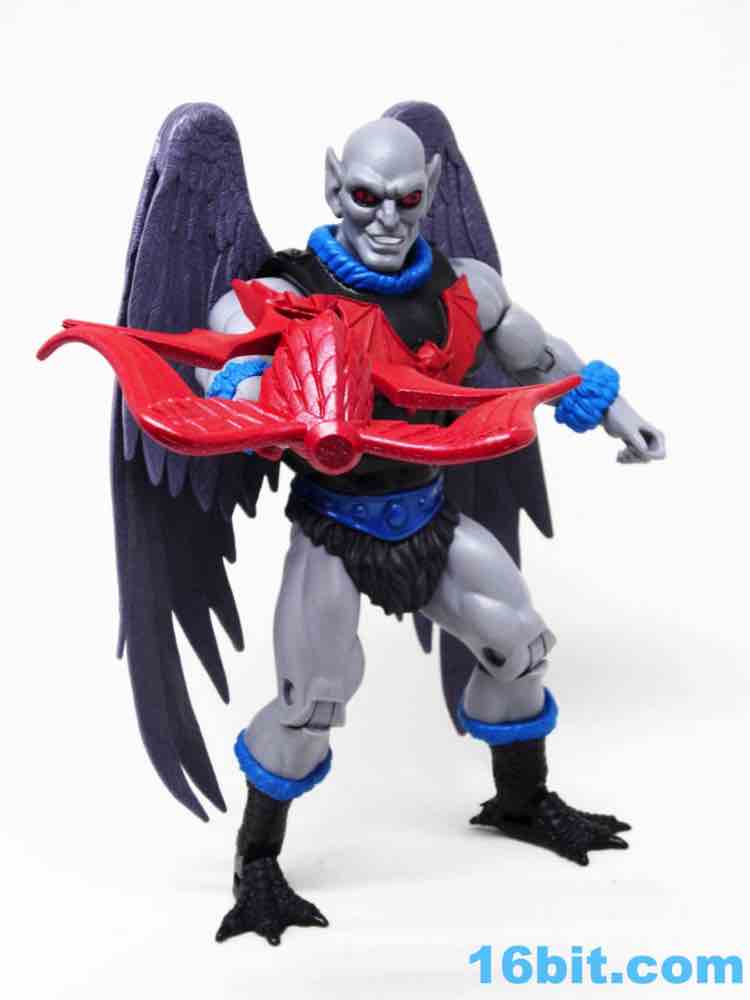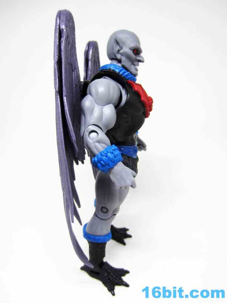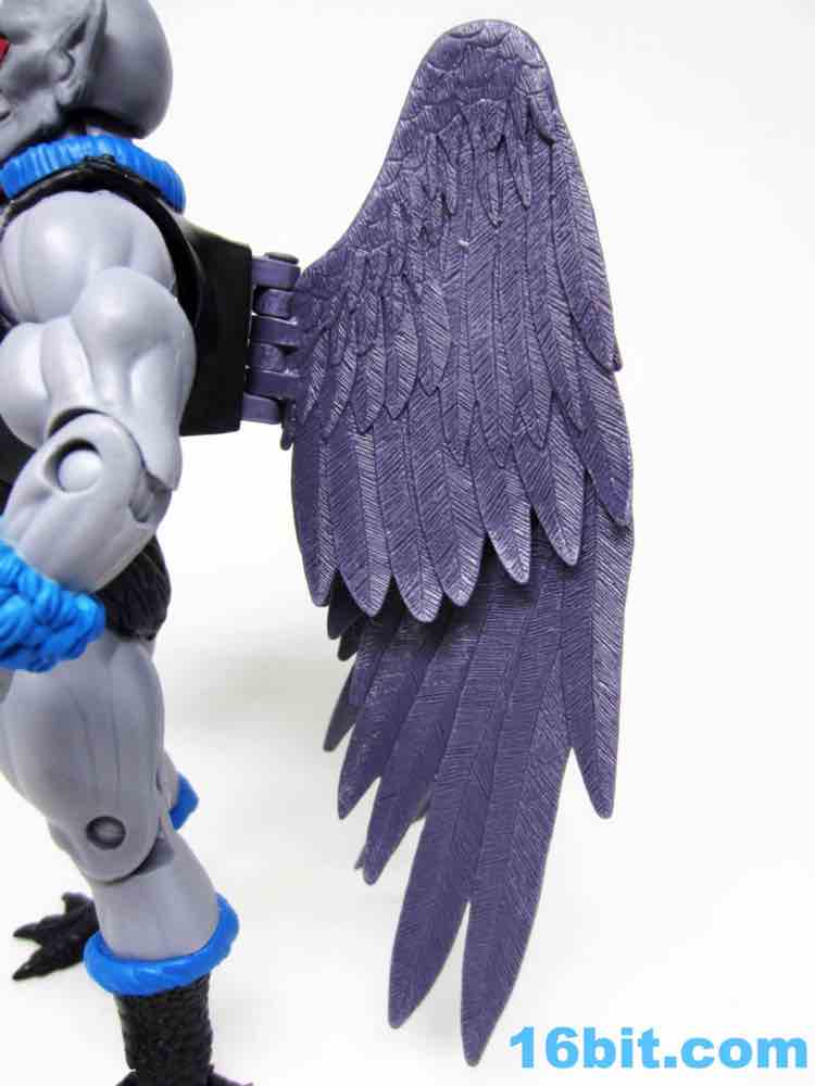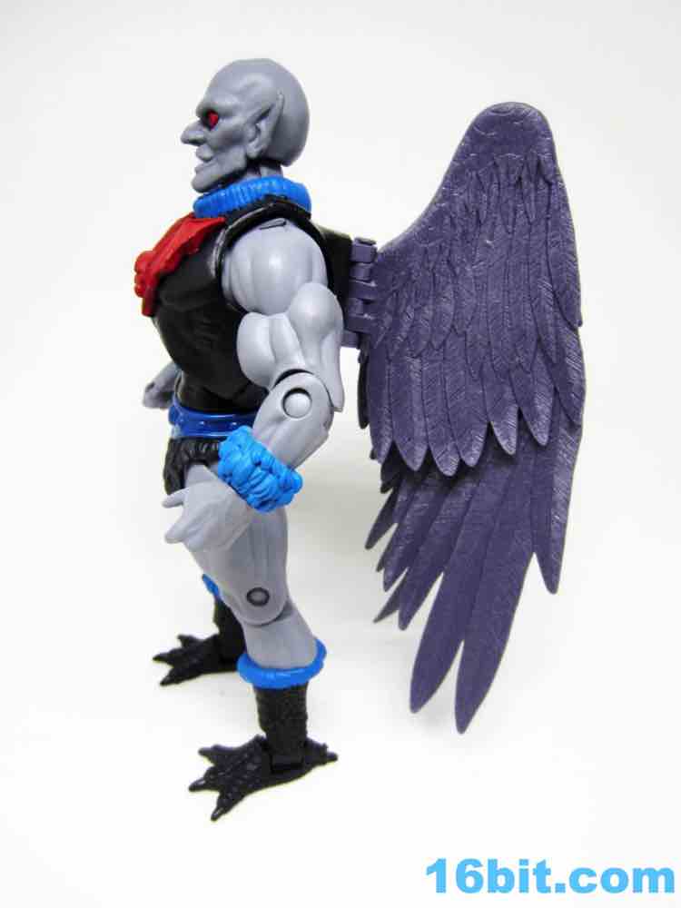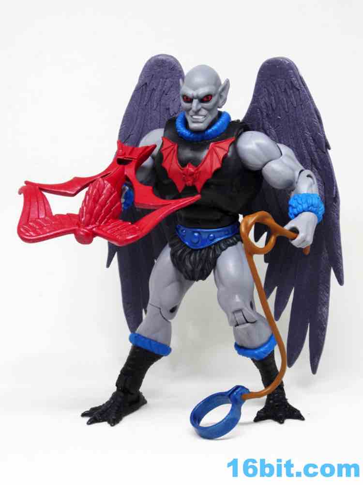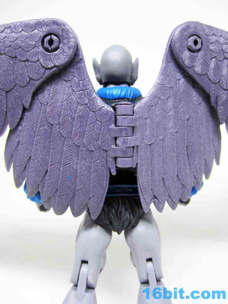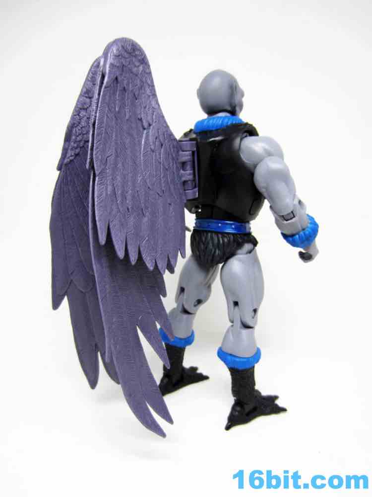 Articulation has nothing you haven't seen, and everything more or less works. The wings are very much like Queen Angella, the feet could make for a great rooster figure some day, and his hands have no problems holding the feathered crossbow or the nifty neck thing. You can totally tie up a dude.