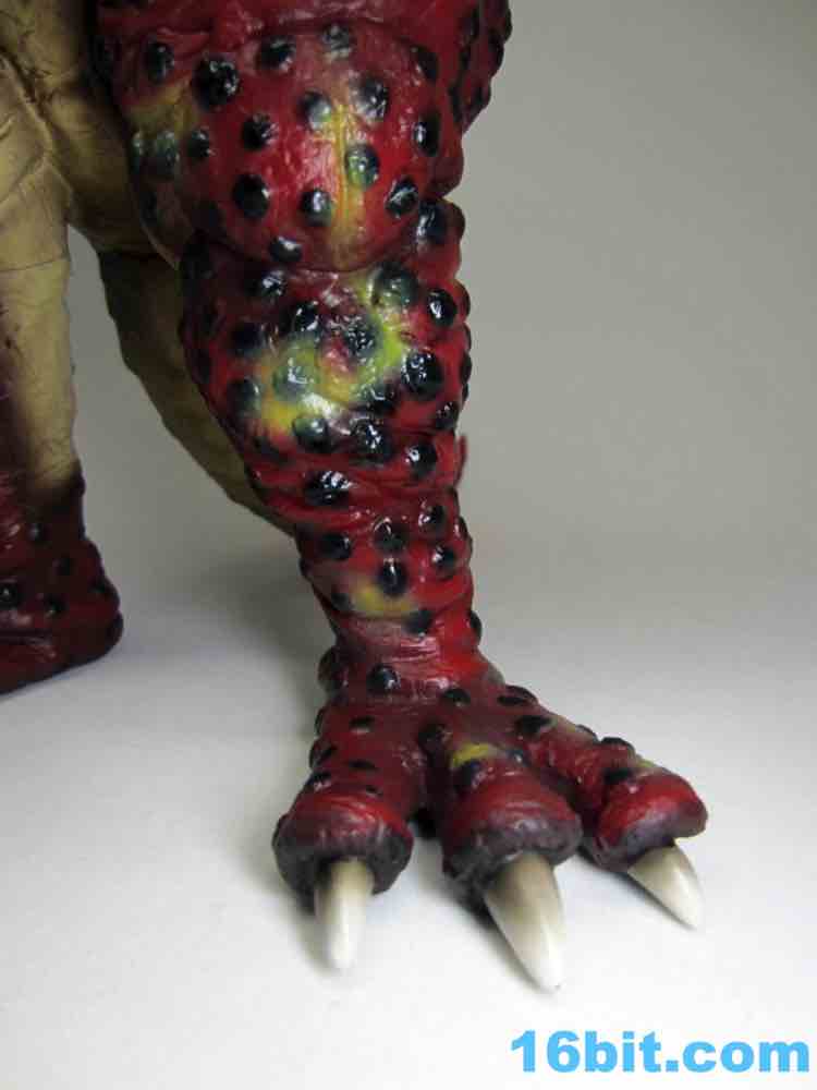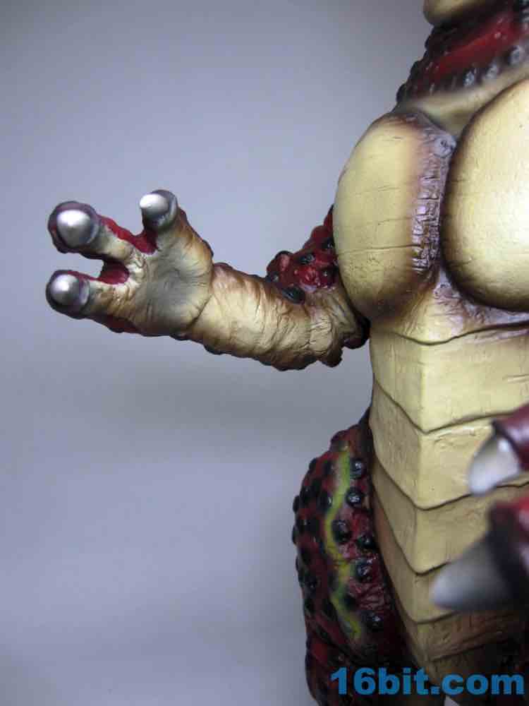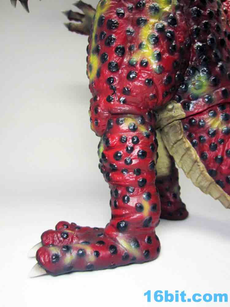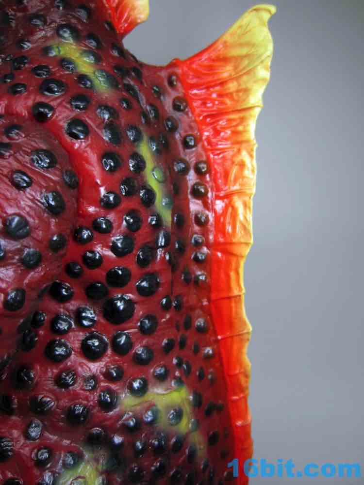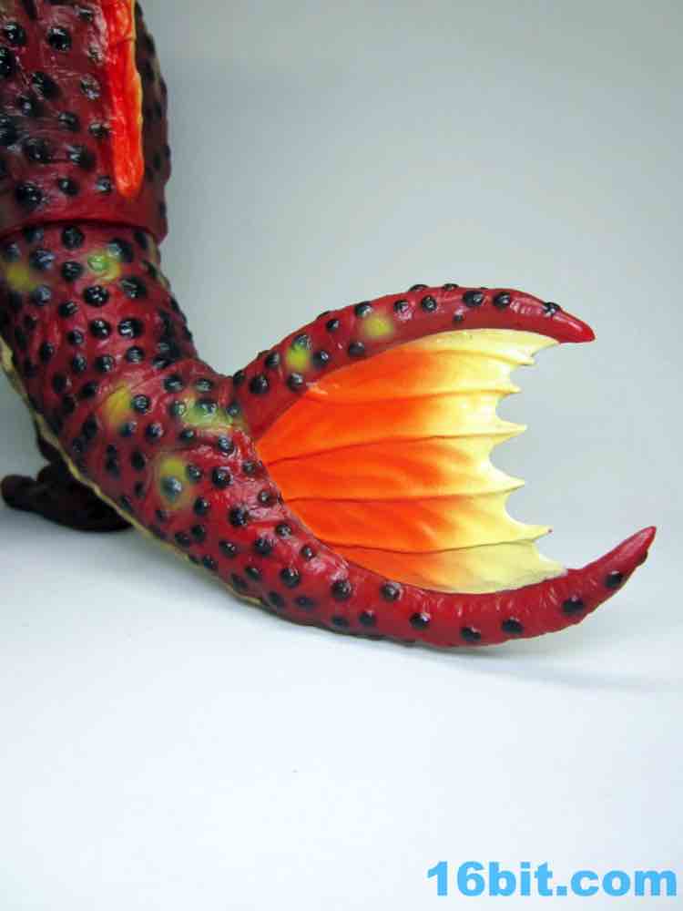 The coloring is amazing - black warts cover the figure, the eyes have a gorgeous metallic sheen to them, there's a neon orange fire-like shade on his fins, and there are all sorts of markings and shading throughout the figure. Even his claws have little black marks to help hide the seams on the actual costume, and if you squint you can see a lot of places on the toy that probably represent where the real-life costume fits together. Someone did their homework here. The coloring on BanDai's older, smaller effort is nothing to sneeze at but this big giant thing is a work of art. It costs a lot, and it feels like it should.
