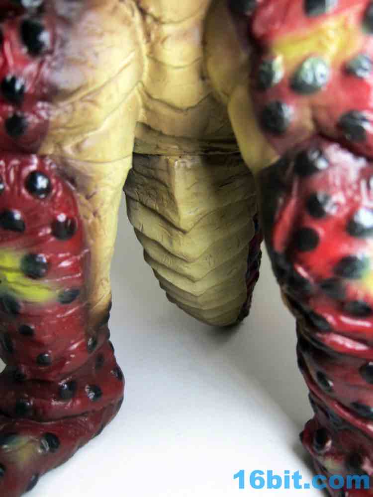 Once you crack open the box - and we'll get to the box in a minute - you pop the toy out of his clear insert and have to install the tail. It's a separate piece, and you can't get it in there without employing the Boiling Water Trick which is actually codified on an instruction sheet in the box. Boiling water is great for re-shaping some plastics, and it's basically required just to get the dumb thing in place here. You could probably also use a hair dryer, but I wouldn't. Thanks to it being a separate piece, the tail swivels and is one of three points of articulation along with the arms. The arms are separate pieces, but don't move a lot - the skin is folded around them in a way that you can nudge them a bit, but it's sort of more like a statue. To call this vinyl figure a toy would probably be a lie, mostly because you wouldn't give it to a child to play with and I suspect the child would not enjoy it beyond being a big, cool, and fun-looking monster creature. He can stomp on cars! He can't, however, be posed.