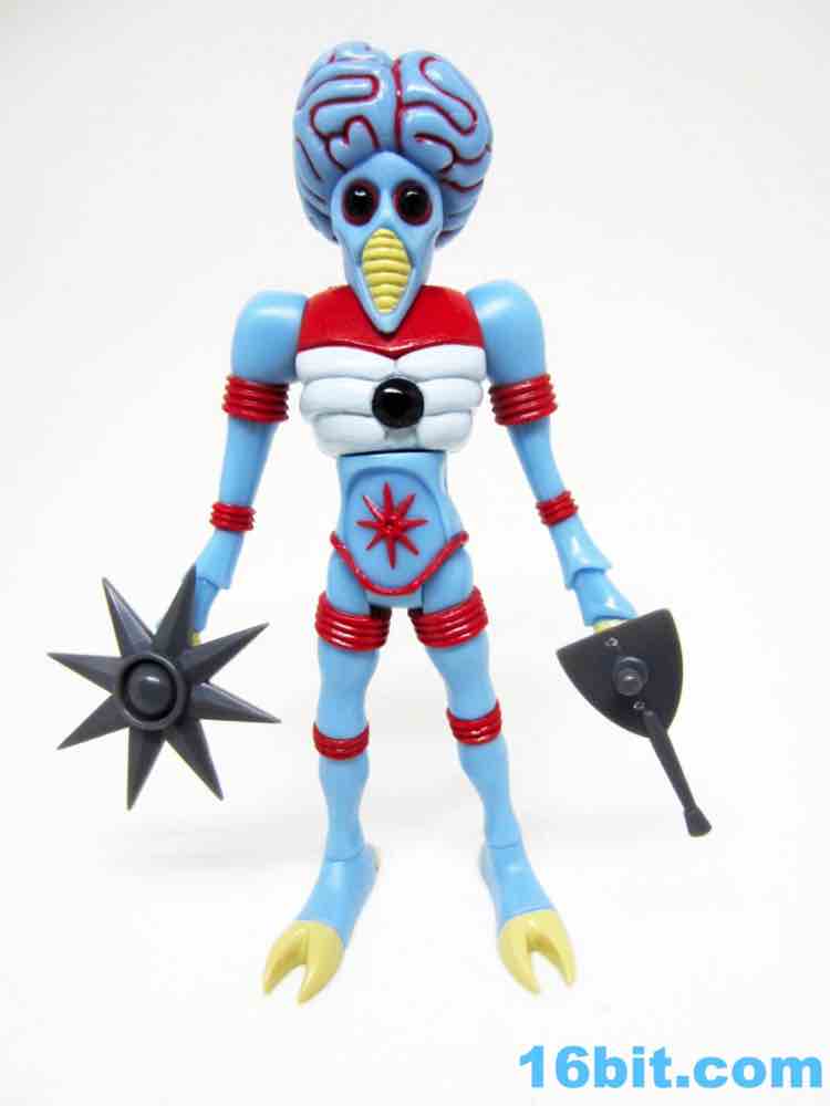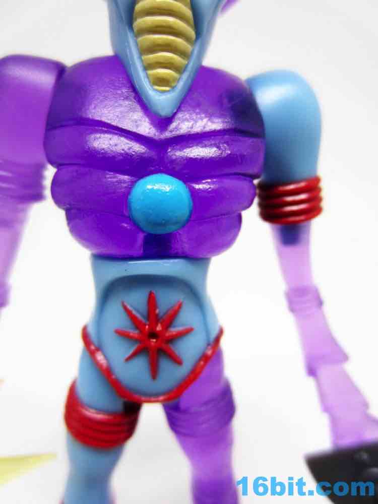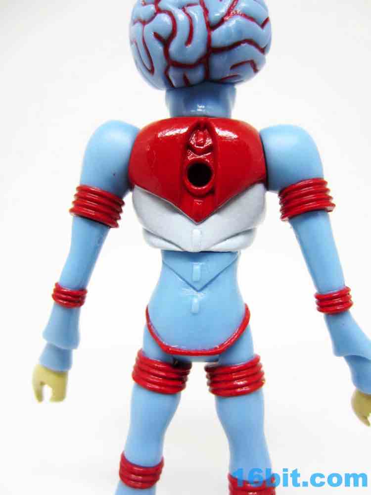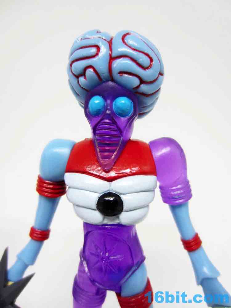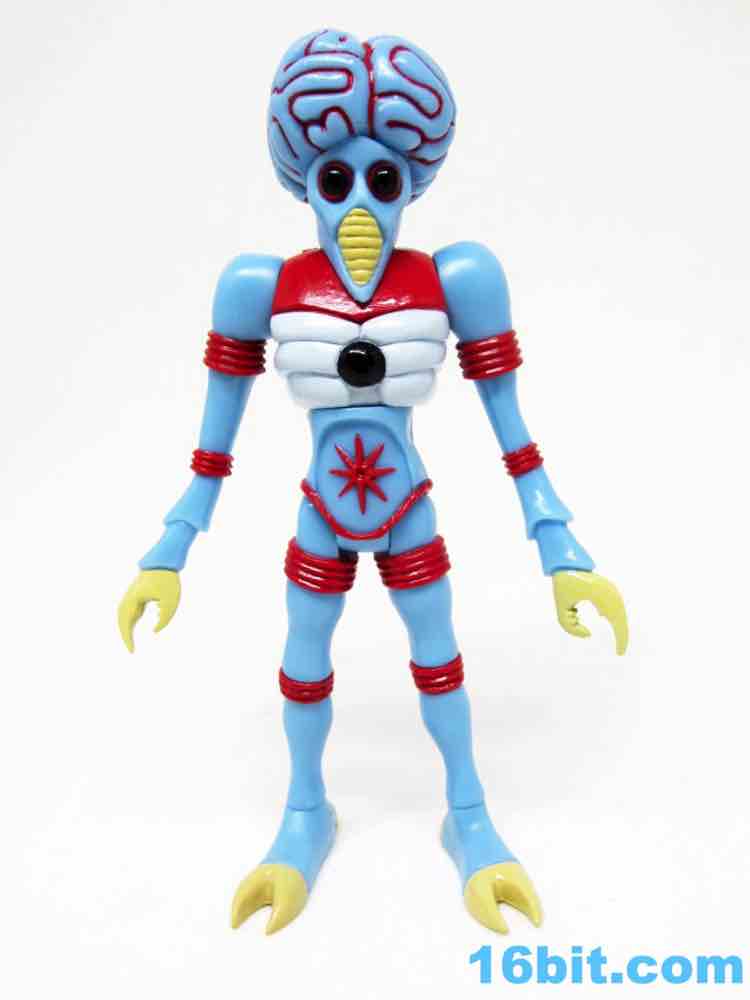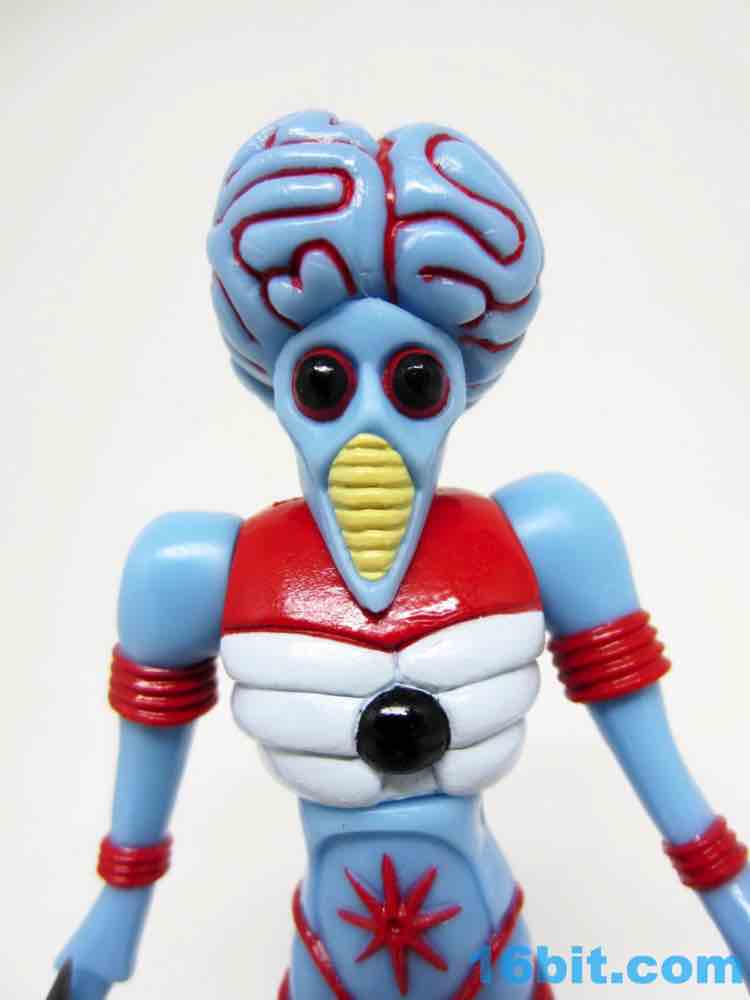 They didn't skimp on details, either. The brain - which is removable from the head - is gifted with blood-red detail lines. The same red is used for his faux accordion joints, upper torso, and the reds around his eyes. Also, you can see it on what appears to be a Speedo and a symbol on his belly which matches his star weapon. Bone accents are used for his mouth and claws. Black adds some contrast to the eyes and a symbol on his chest.