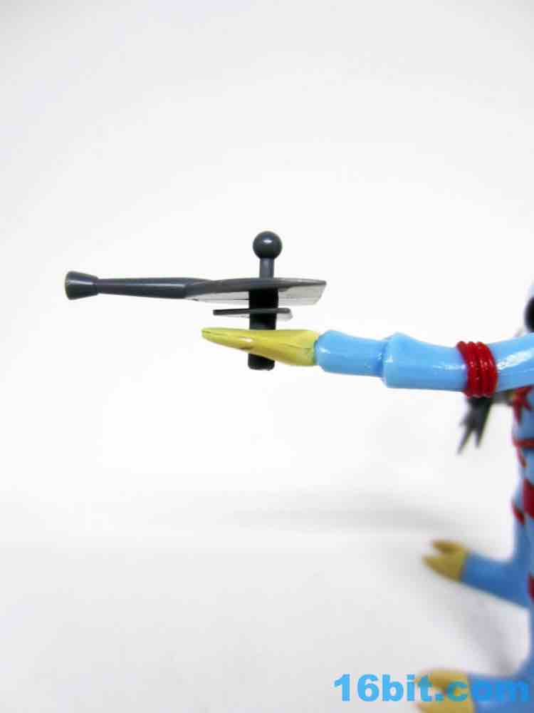 His accessories are the first opaque non-metalized ABS plastic weapons in the entire line! He has a nifty ray gun and a star, both cast in a pretty neutral gray plastic. They're not bad. They're not great. He holds them fairly well, but the clear ones seem to be a little better because they have the added benefit of showing you the figure's hands underneath. The star is very sharp - and I do mean that literally - while the pistol has a nifty antenna on the back. Presumably other weapons were cast on the same sprue, as Gemini's staff and Cyclops' twin pistols were included with the Protoclone Marezioc Guard (a built-up Noboto) from the same series. I assume this means there are opaque Gemini blasters out there somewhere, and so far I can't get anyone to comment on this.