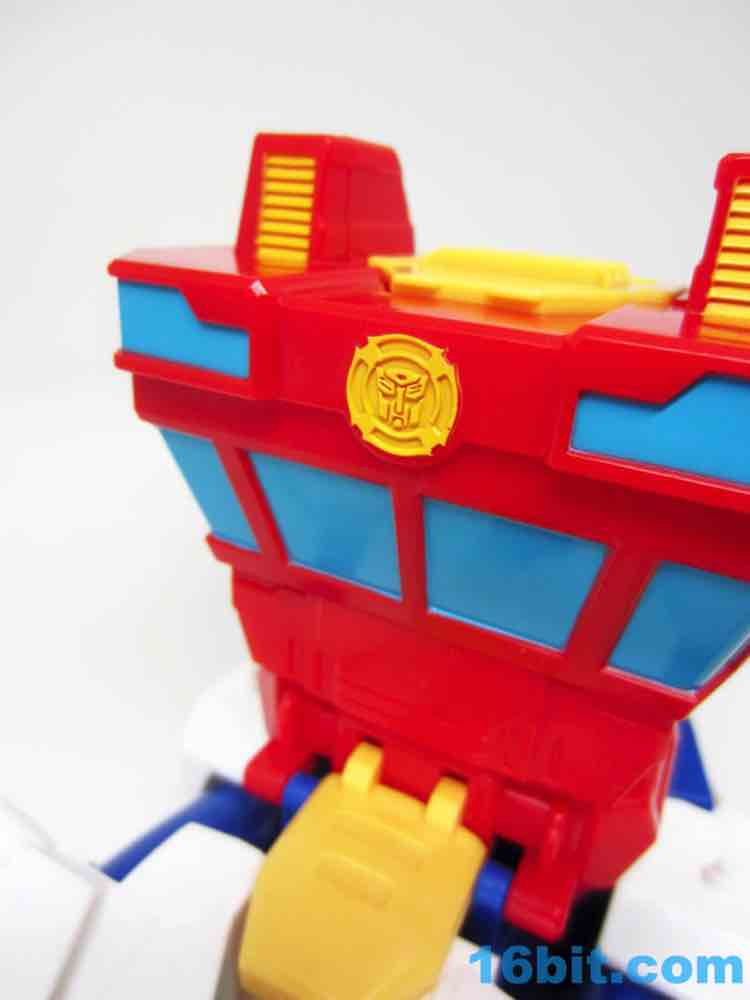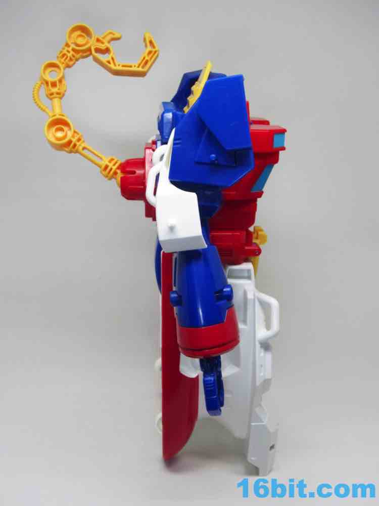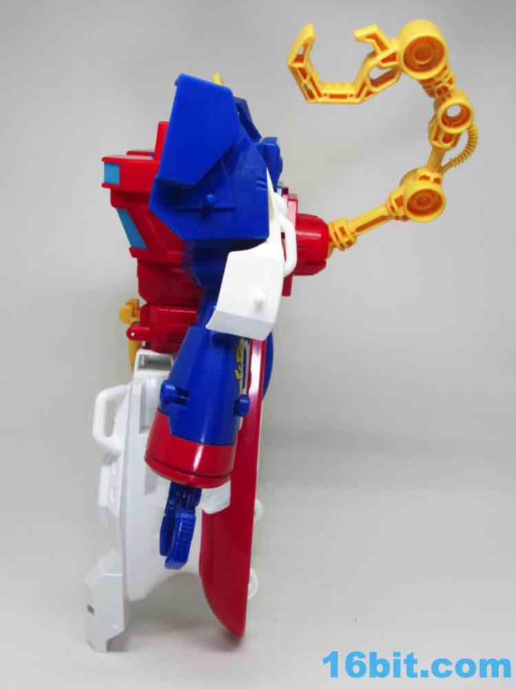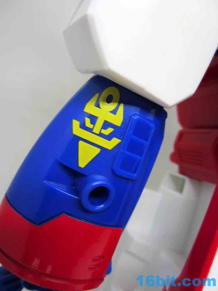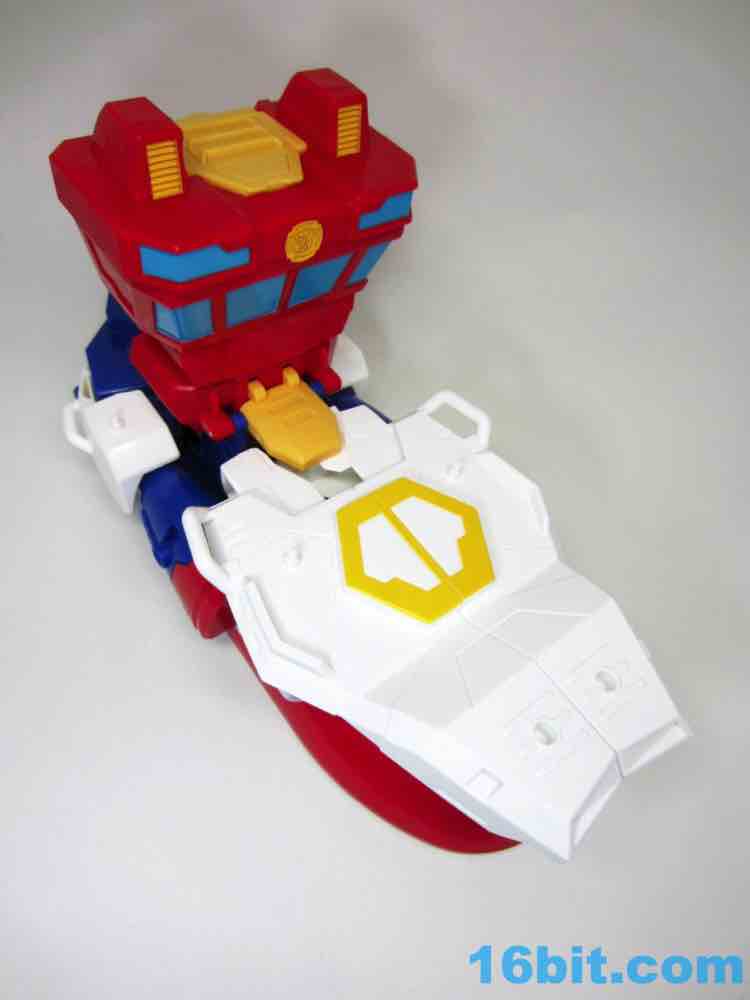 The 10-inch boat bot looks like a seaworthy Omega Supreme. With claw hands and a nifty hook backpack, the figure has no real articulation to speak of - it's just a big plastic robot you can play with. If you're an older fan, you'll no doubt recall that the original toys of the 1980s were often pretty simple too - any and all moving parts were dedicated to the transformation. Things like wrist joints just plain didn't exist, so what you have here is a robot with white feet from the deck, a red chest from the tower, and a blue head on top of the whole thing. He's even got a Rescue Bots anchor tattoo on his arm - how naval! There are little pegs all over him for boat mode, these allow you to connect various 5mm accessories to his arms or body. The downside is what you see is what you get - his neck doesn't turn and his arms only move inward in the auto-transformation to boat mode.