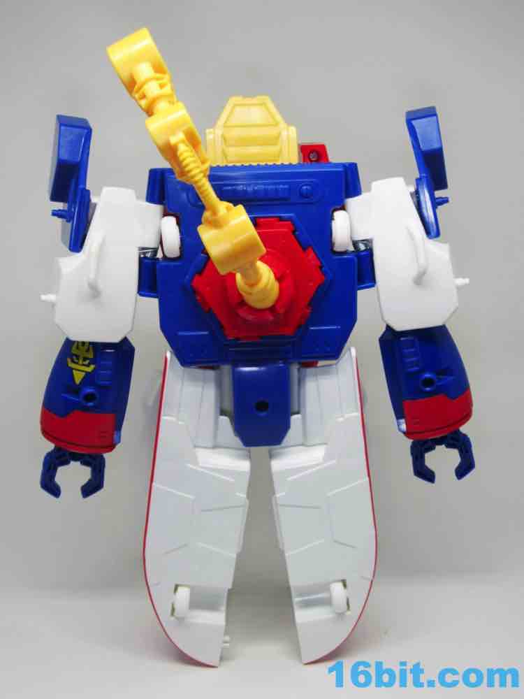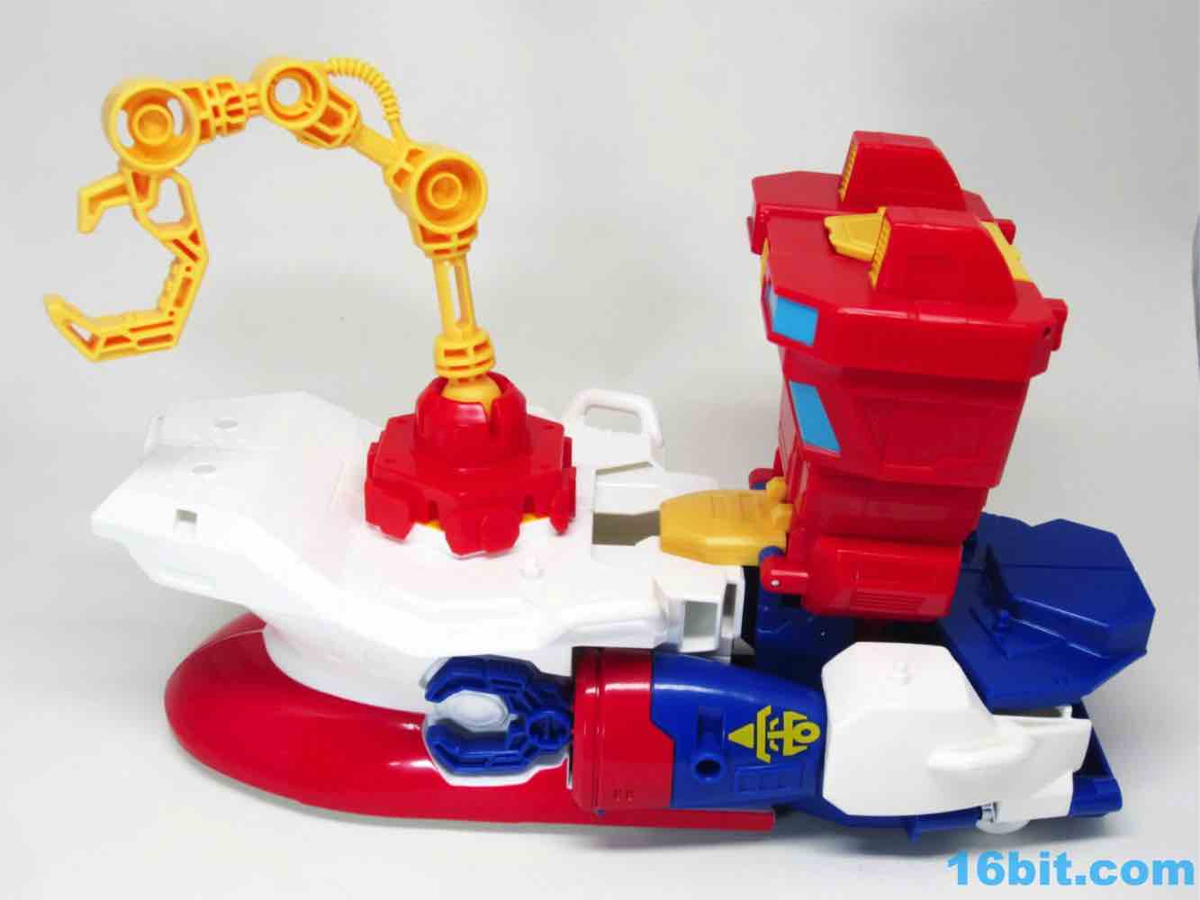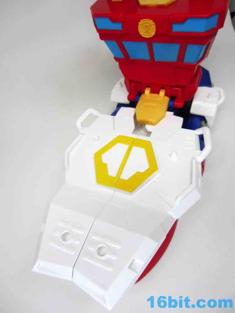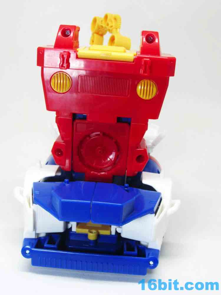 The 10-inch boat bot looks like a seaworthy Omega Supreme. With claw hands and a nifty hook backpack, the figure has no real articulation to speak of - it's just a big plastic robot you can play with. If you're an older fan, you'll no doubt recall that the original toys of the 1980s were often pretty simple too - any and all moving parts were dedicated to the transformation. Things like wrist joints just plain didn't exist, so what you have here is a robot with white feet from the deck, a red chest from the tower, and a blue head on top of the whole thing. He's even got a Rescue Bots anchor tattoo on his arm - how naval! There are little pegs all over him for boat mode, these allow you to connect various 5mm accessories to his arms or body. The downside is what you see is what you get - his neck doesn't turn and his arms only move inward in the auto-transformation to boat mode.