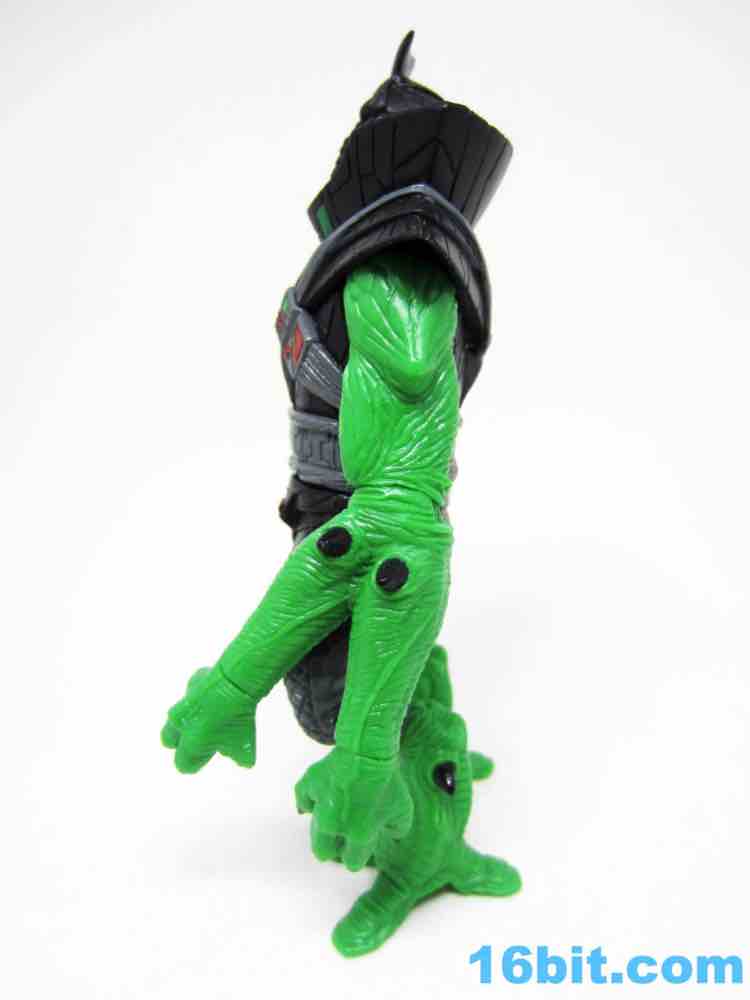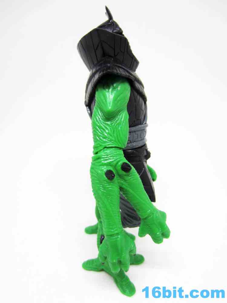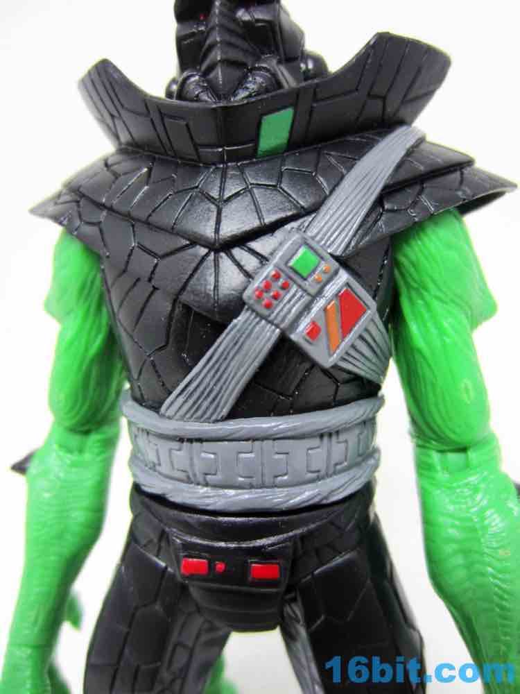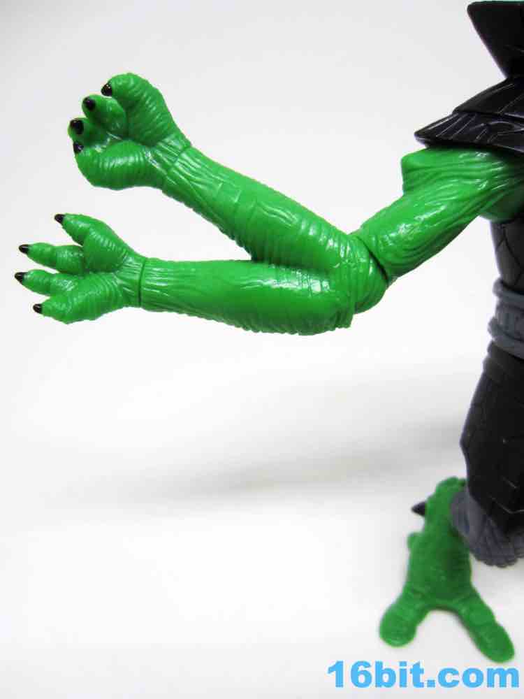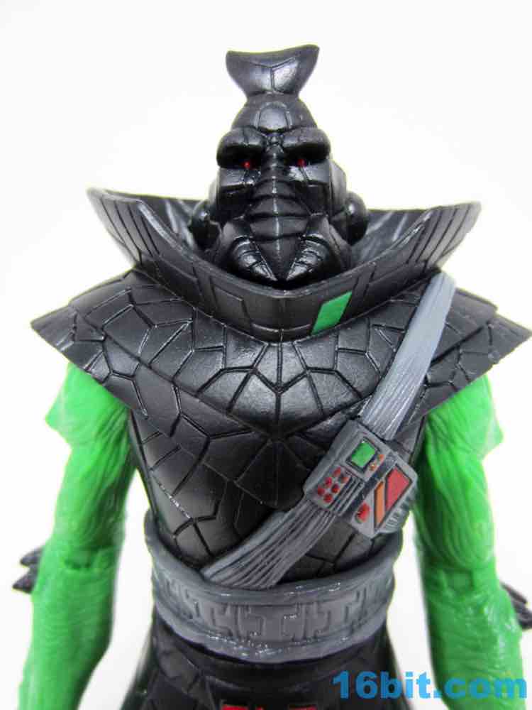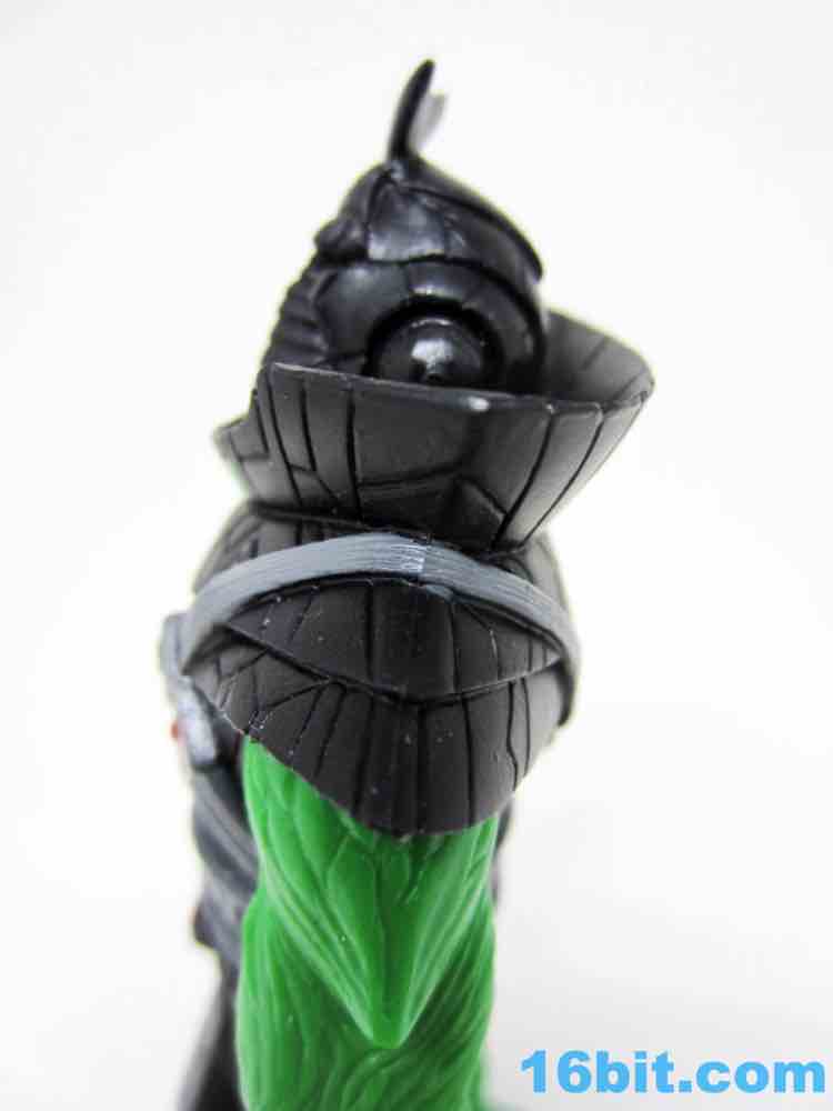 Minus the fallout, it's a decent figure. The green plastic does wonders to bring out the texture on his four arms and two feet, complete with giant, horribly ugly toes. The leathery body armor is cast in black, with limited painted details - a strap here, a screen or a button there. By swapping colors with a companion figure, the Four Horsemen did a great job of adding color to a largely unpainted figure with minimal waste - plus you got a unique helmeted head here. The head is also cast in black with red eyes, and you can see nifty details covering the face and round ear coverings that are incredibly detailed.