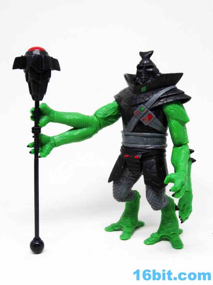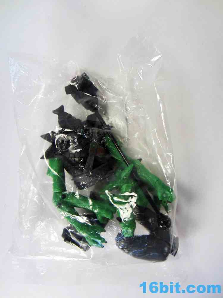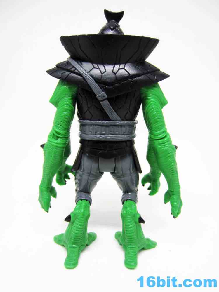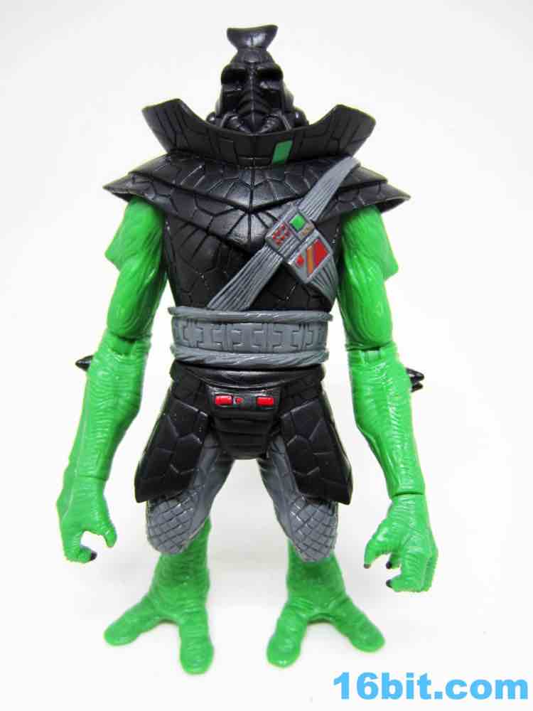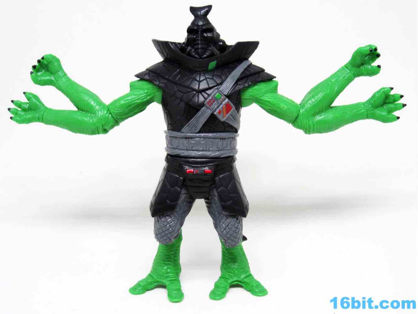 Minus the fallout, it's a decent figure. The green plastic does wonders to bring out the texture on his four arms and two feet, complete with giant, horribly ugly toes. The leathery body armor is cast in black, with limited painted details - a strap here, a screen or a button there. By swapping colors with a companion figure, the Four Horsemen did a great job of adding color to a largely unpainted figure with minimal waste - plus you got a unique helmeted head here. The head is also cast in black with red eyes, and you can see nifty details covering the face and round ear coverings that are incredibly detailed.