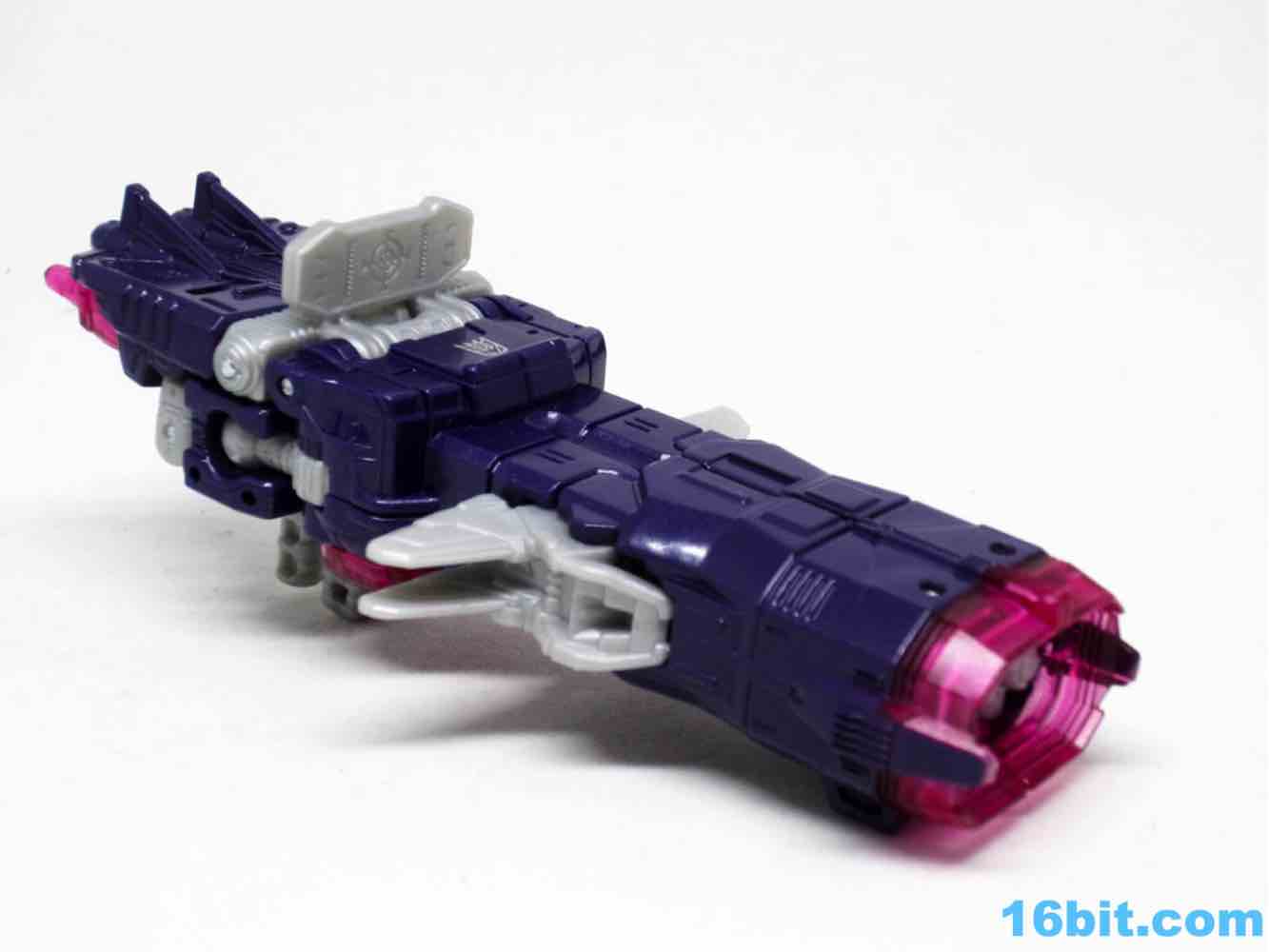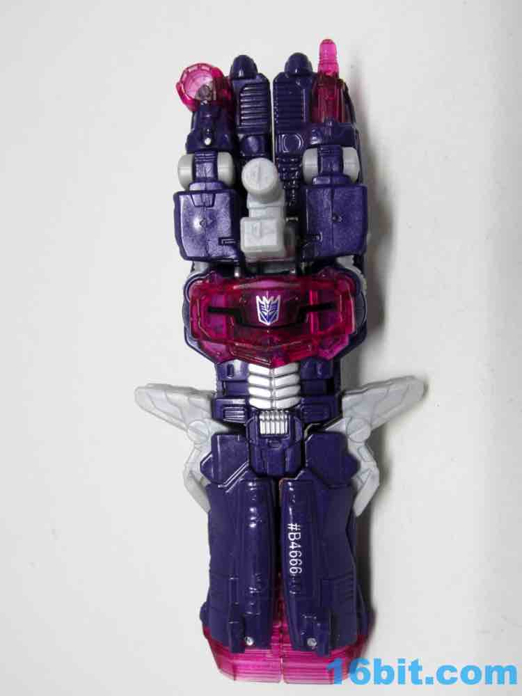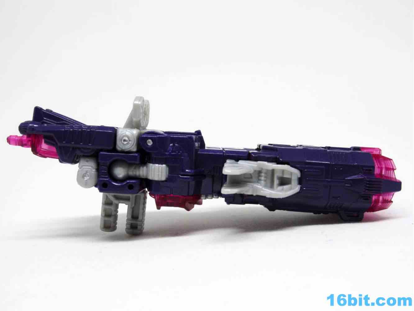 The weapon mode is a cross between his original gun mode and some sort of space satellite thing. It's neat unto itself, but it's not a proper update for the original toy largely because of it not being large. It has a unique grip which can fold up for "ship mode," and a special design created specifically to fit in the Combiner Wars hands. The vehicle/weapon mode itself is acceptable, but unremarkable. It has an opaque targeting sight on top, which I like, and they made clever use of his knees as the barrel of the cannon - or vice-versa. Either way. I quite like the clear pink bits, but the feet hanging off the sides of the ship just look goofy. Compared to Powerglide [FOTD #1,153] it's a more convincing weapon.