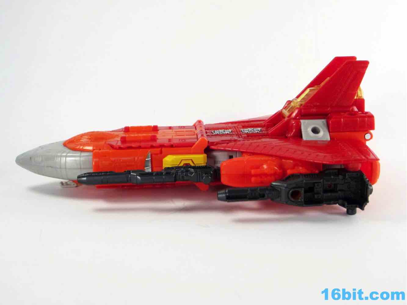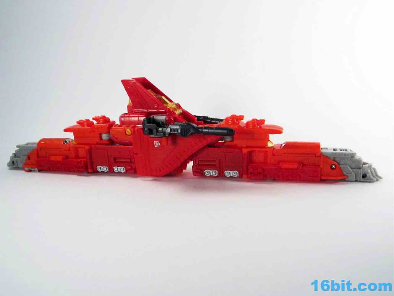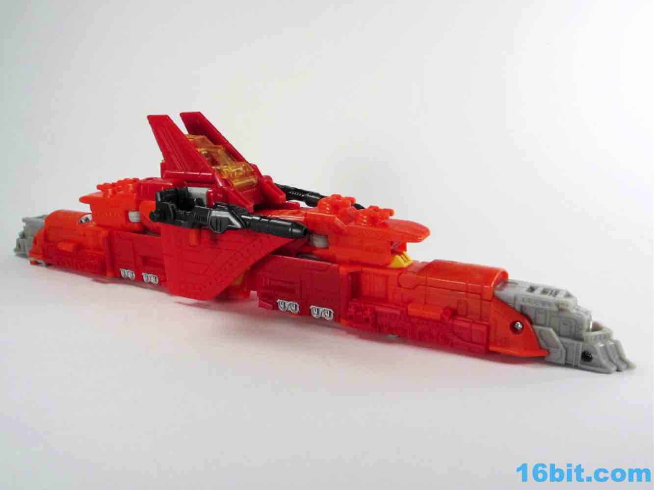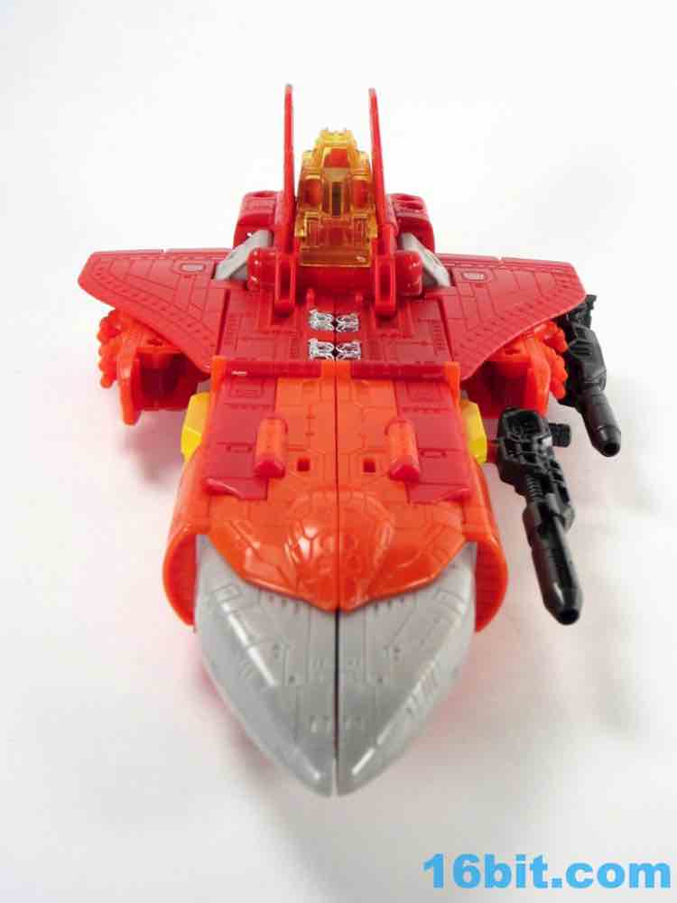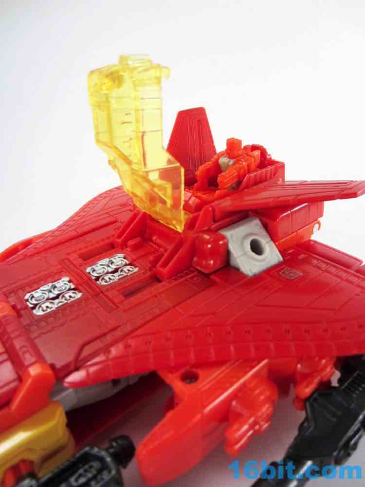 The shuttle mode fares better, looking more than a bit like a space ship - almost like the Ark or even Vector Prime's vehicle mode in some respects. The bright orange with clear yellow pilot's seat reminds me of a 1980s toy, and you'll see a ridiculous amount of detailing on the vehicle if you get in close. Nothing is flat or underdecorated, although it might be hard to notice all of the work put into the toy thanks to the bright colors. They're quite striking. Unlike some of the other toys, there are no little pegs on which for figures to stand - you've got a pilot, or nothing. There are several places to mount 5mm guns though, and one of the included weapons does have a seat for a Titan Master figure if you so choose. Little landing skids can fold down in vehicle mode, but aside from that the only real interactivity of the vehicle mode (beyond transformation) is putting the pilot inside. I like it.