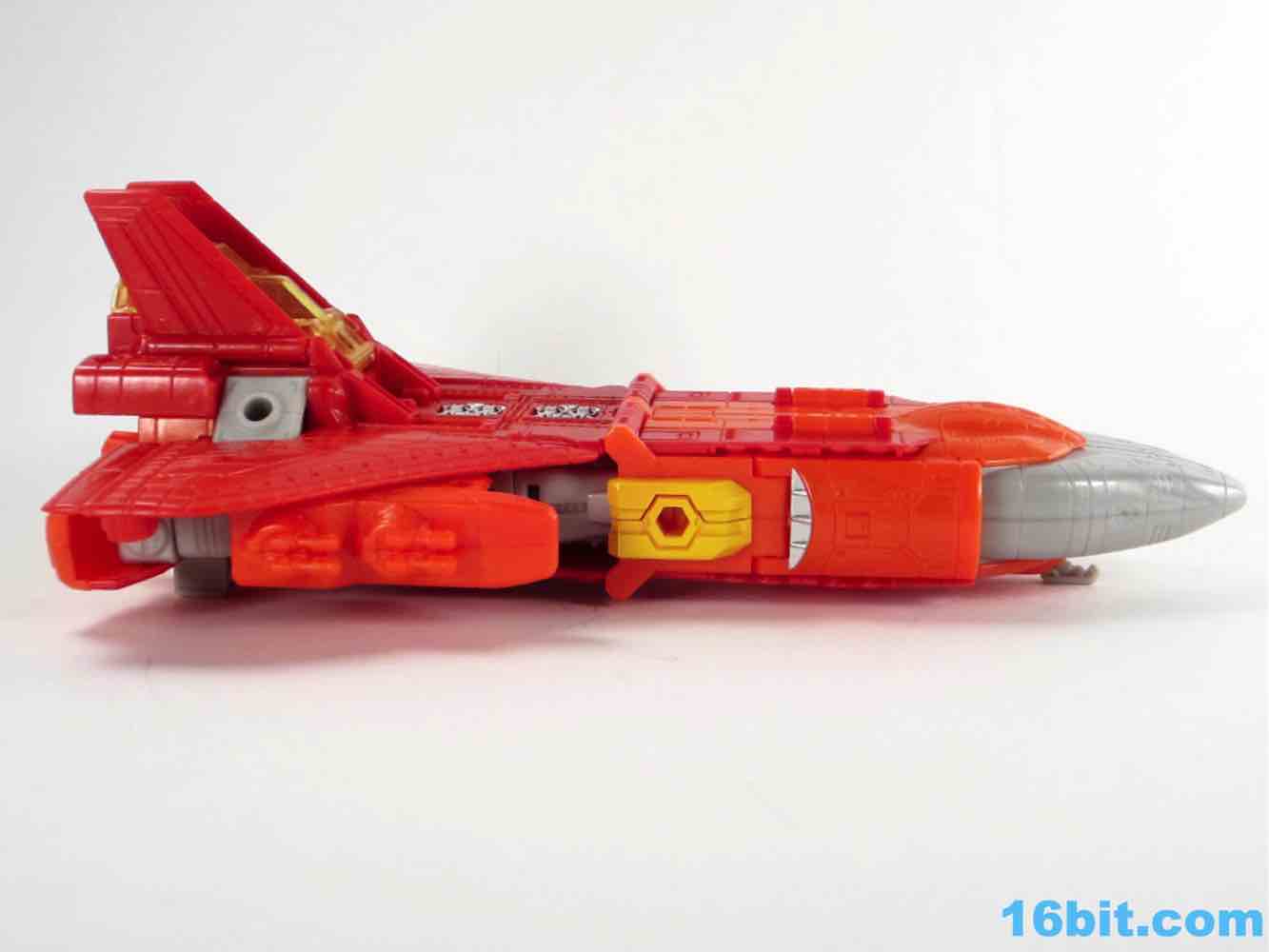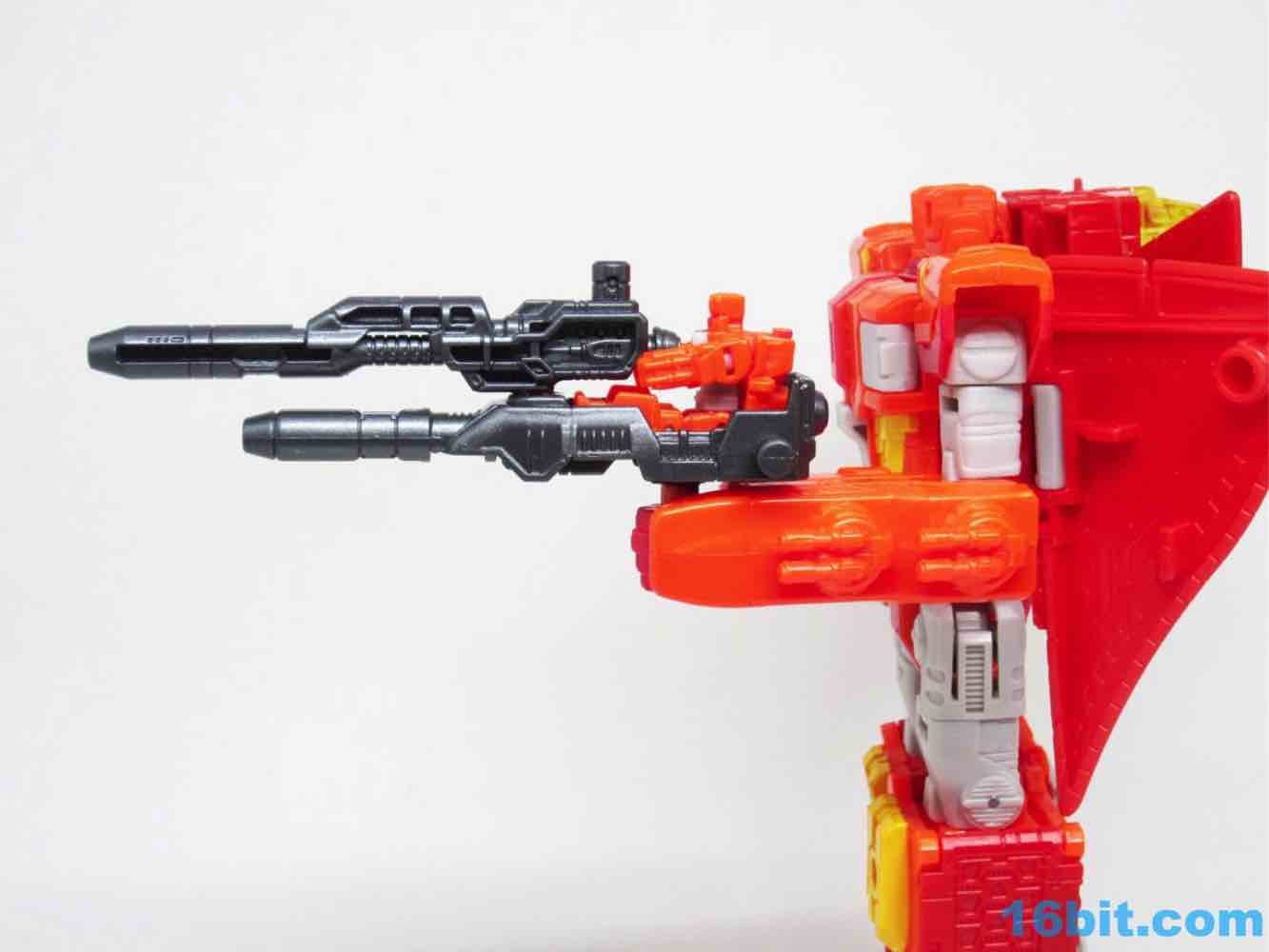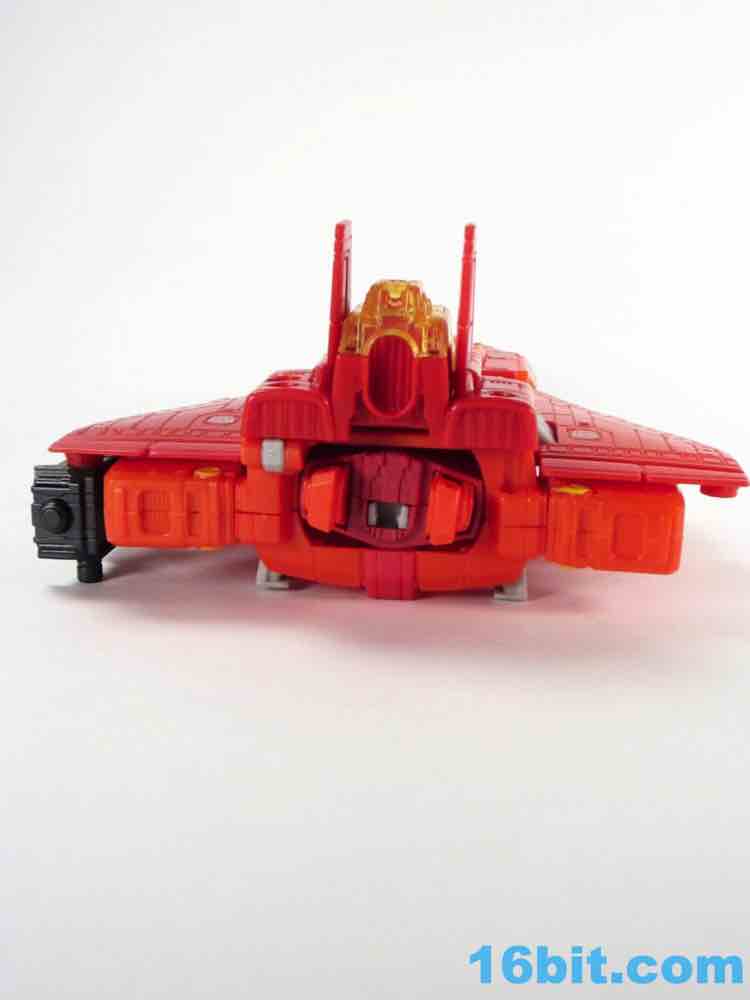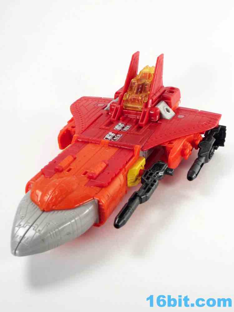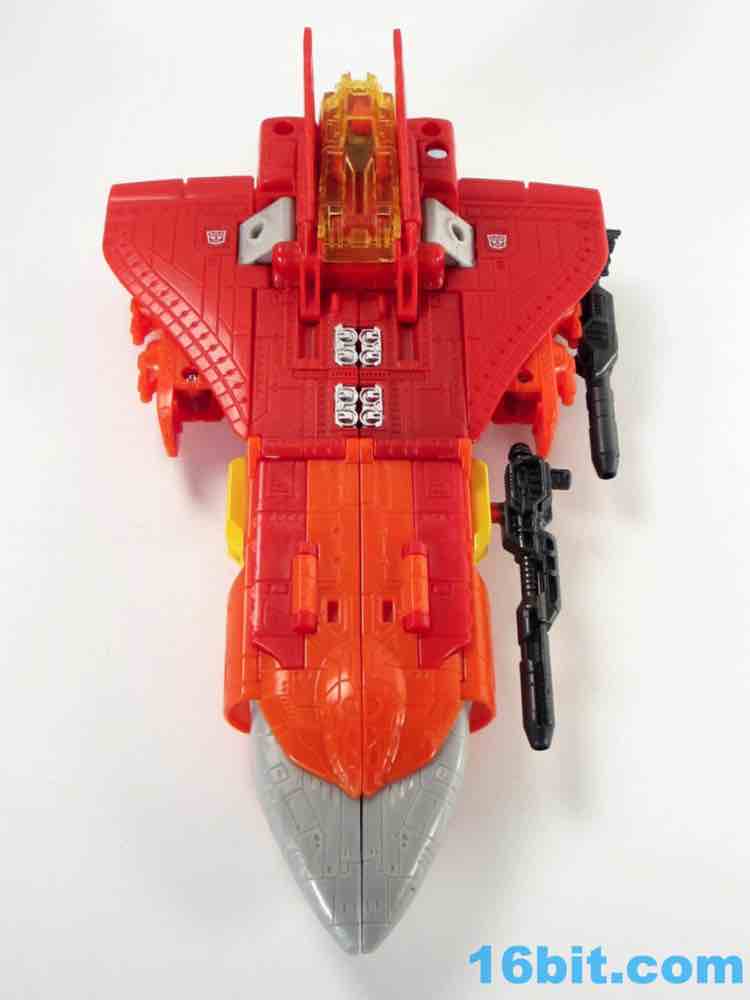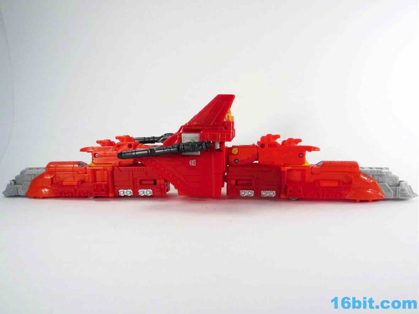 The shuttle mode fares better, looking more than a bit like a space ship - almost like the Ark or even Vector Prime's vehicle mode in some respects. The bright orange with clear yellow pilot's seat reminds me of a 1980s toy, and you'll see a ridiculous amount of detailing on the vehicle if you get in close. Nothing is flat or underdecorated, although it might be hard to notice all of the work put into the toy thanks to the bright colors. They're quite striking. Unlike some of the other toys, there are no little pegs on which for figures to stand - you've got a pilot, or nothing. There are several places to mount 5mm guns though, and one of the included weapons does have a seat for a Titan Master figure if you so choose. Little landing skids can fold down in vehicle mode, but aside from that the only real interactivity of the vehicle mode (beyond transformation) is putting the pilot inside. I like it.