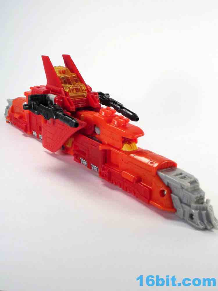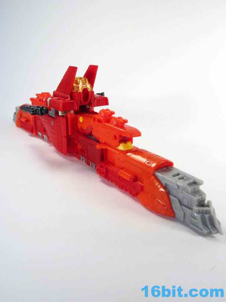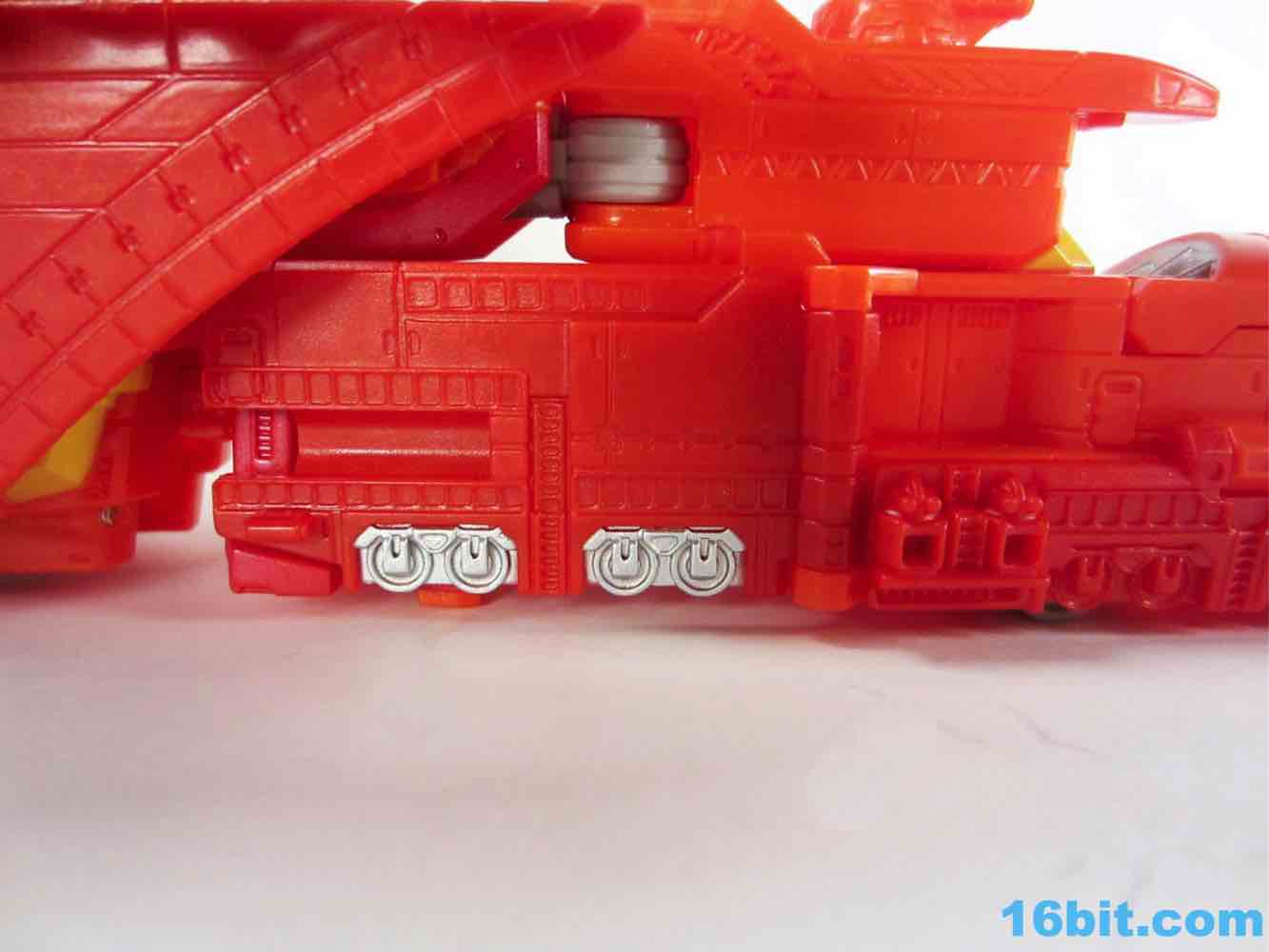 The train mode is a lot like Energon Omega Supreme, in that it's long and has a ton of guns on it. Transformation is a snap - it really is easy - and you can plug the figure in the driver's seat and the guns on the sides. One of the side 5mm holes is a little loose, so you'll need to be careful with how you position the handguns in there. The wheels roll fairly well, but there's a wheel right smack dab in the middle that doesn't quite touch the ground. The detailing on the vehicle is pretty spectacular - you'll see tiny wheels, little doors, rivets, and windows depending on where you look. It's not really like any conventional train, but hey, it's a nice vehicle. Getting three modes out of a toy is tricky, so the effort is absolutely appreciated and it turned out fairly well.