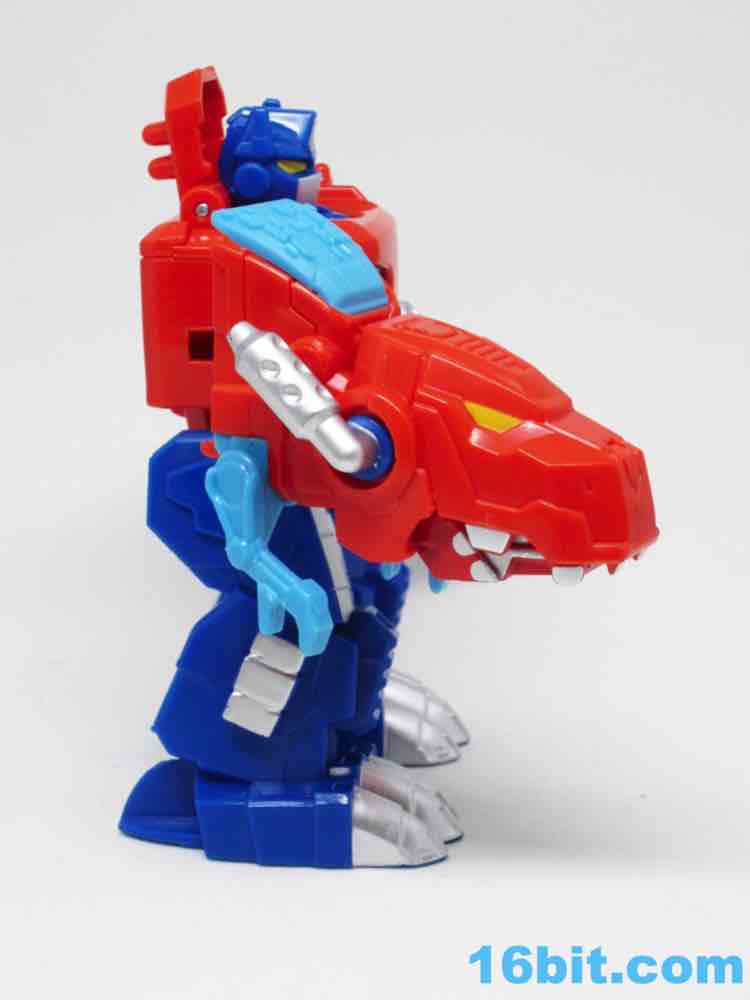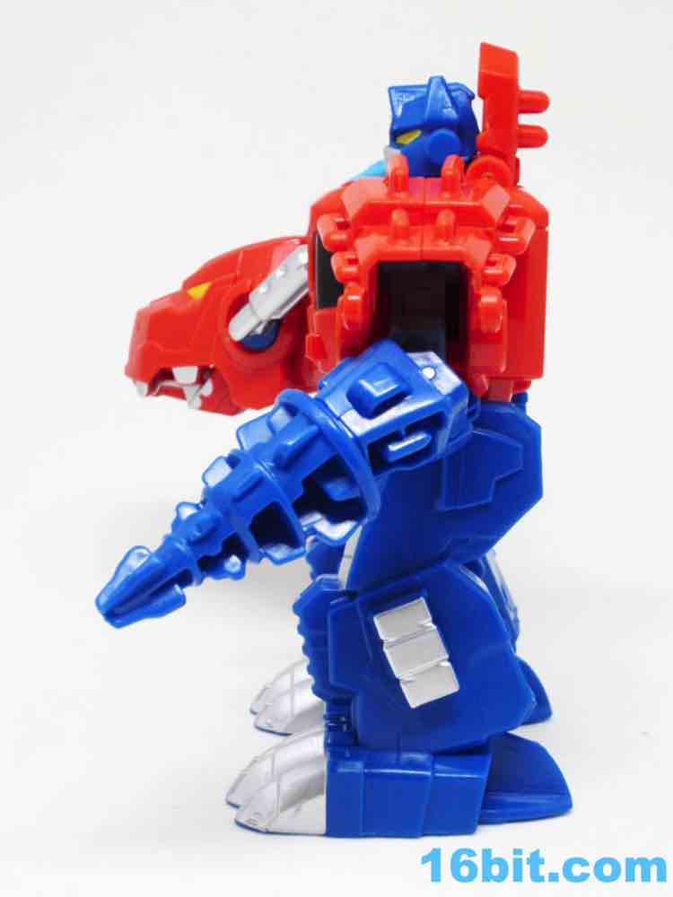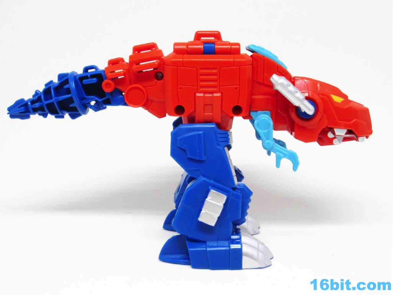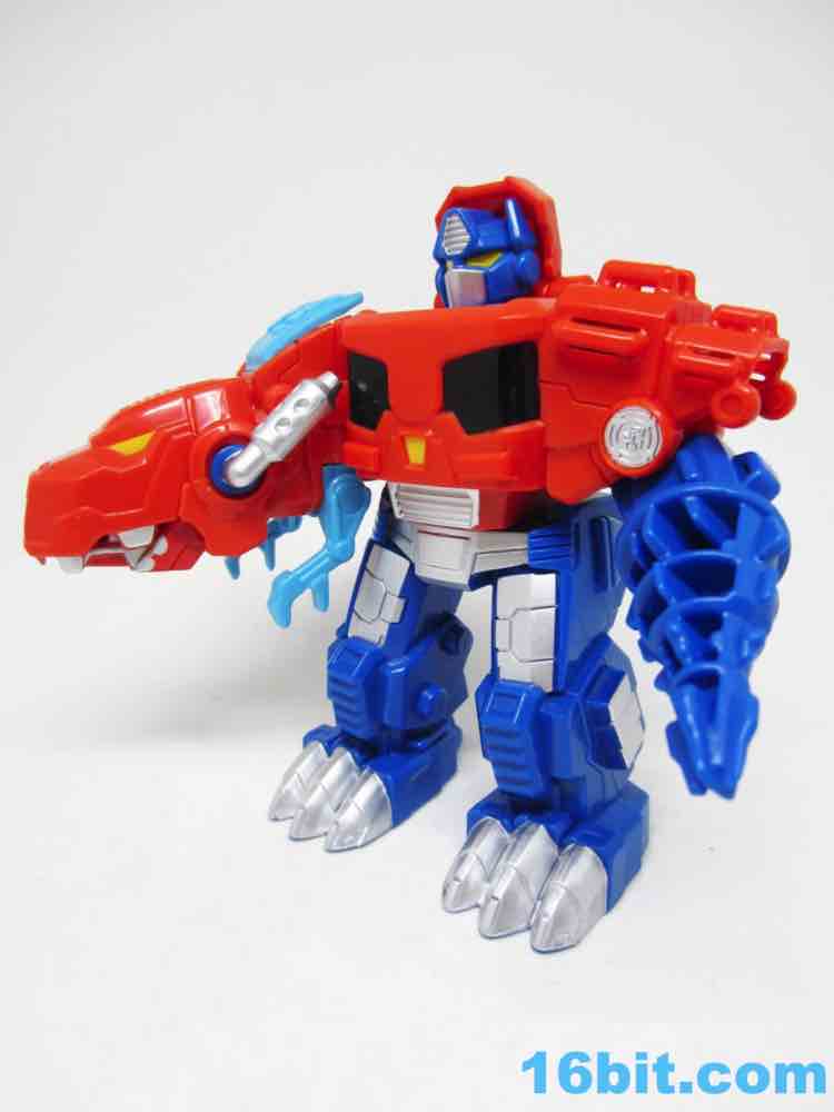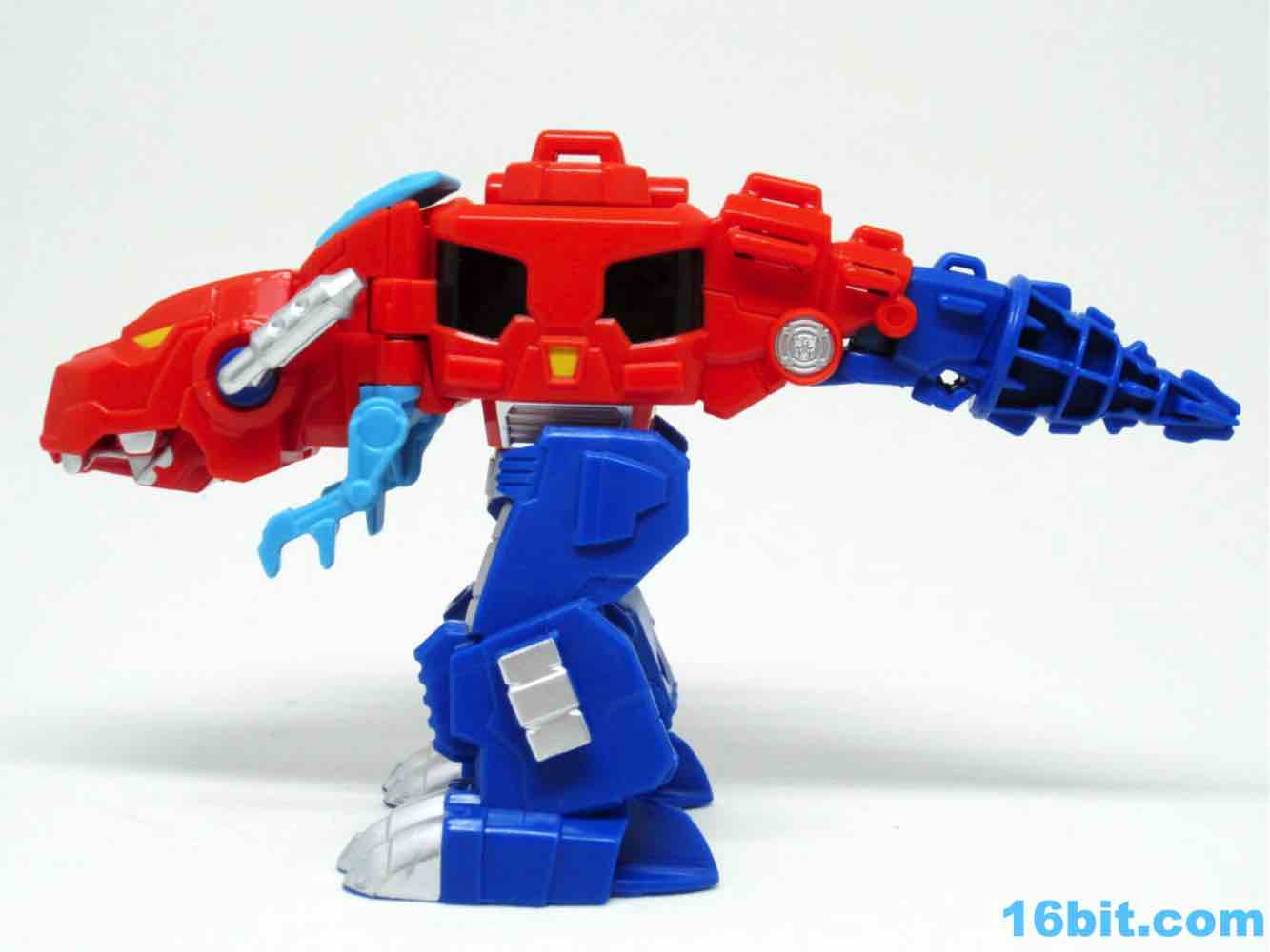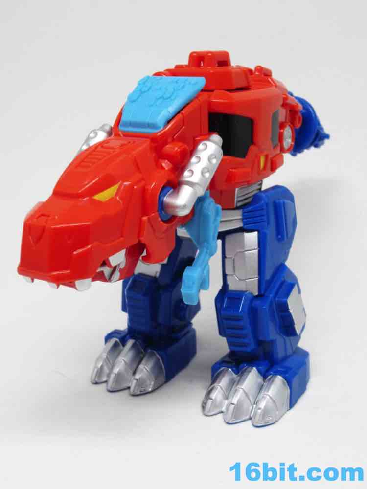 The 4 1/2-inch robot is, for all intents and purposes, a one-step toy. If you twist his legs, the robot arms fall in place and you get a dinosaur. The blue switch on the head moves the jaw to open and close... and that's all the robot does. Sculpting is good, with some decent silver deco and nifty true-to-G1's original Optimus Prime yellow eyes. Sadly the arms really don't move, the fist doesn't hold anything, and the legs are a statue. But it's fun. It really is.
