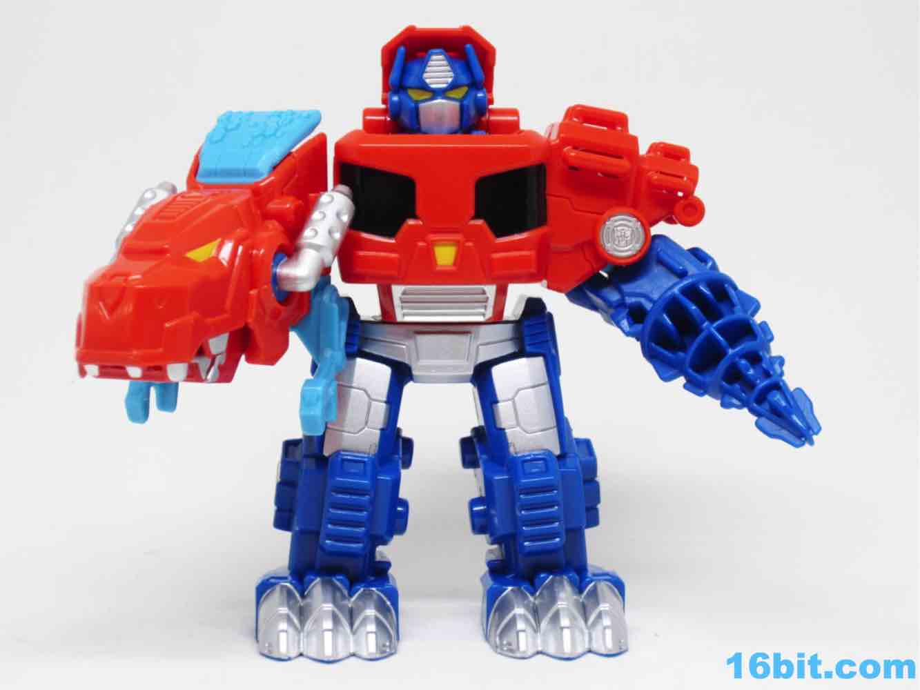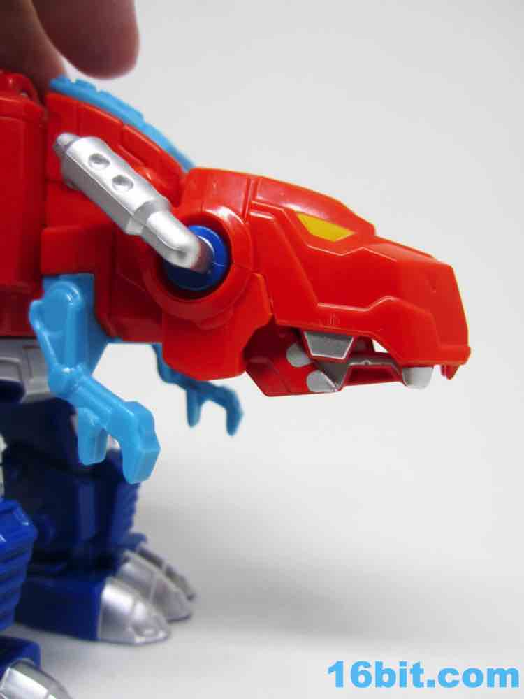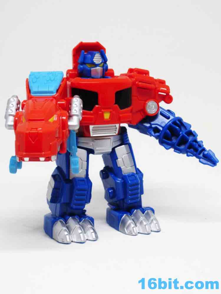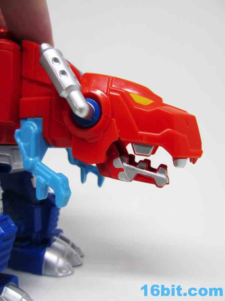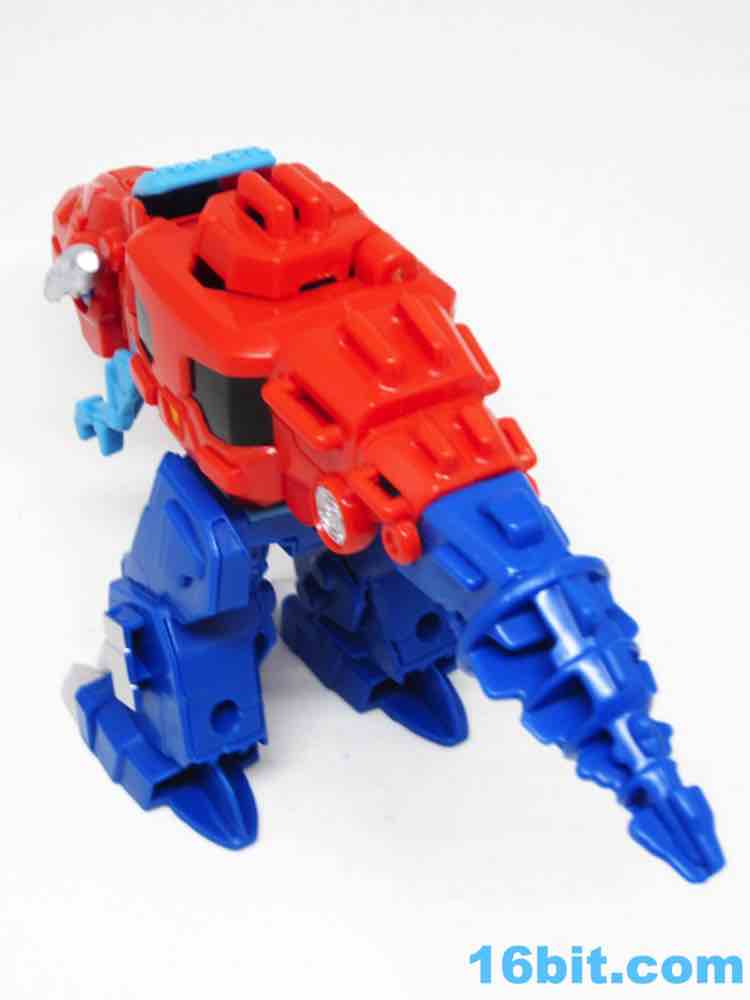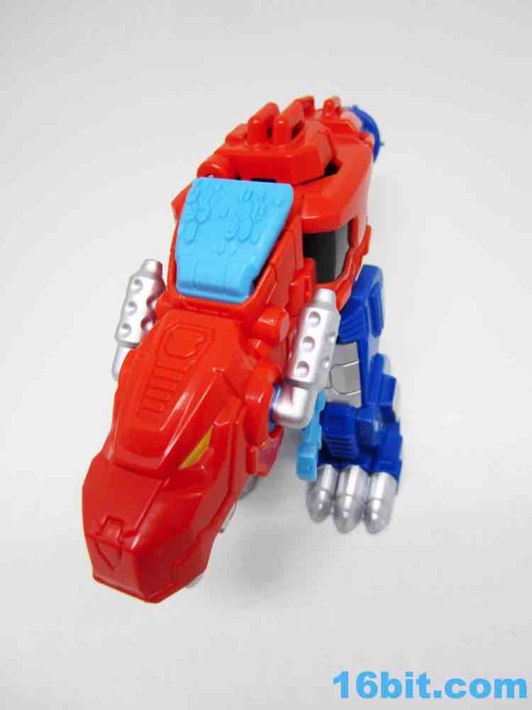 The 4 1/2-inch robot is, for all intents and purposes, a one-step toy. If you twist his legs, the robot arms fall in place and you get a dinosaur. The blue switch on the head moves the jaw to open and close... and that's all the robot does. Sculpting is good, with some decent silver deco and nifty true-to-G1's original Optimus Prime yellow eyes. Sadly the arms really don't move, the fist doesn't hold anything, and the legs are a statue. But it's fun. It really is.