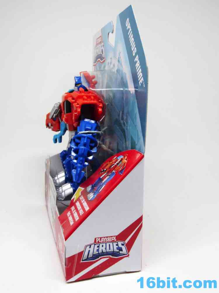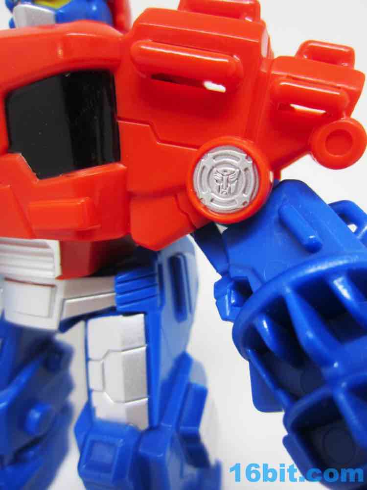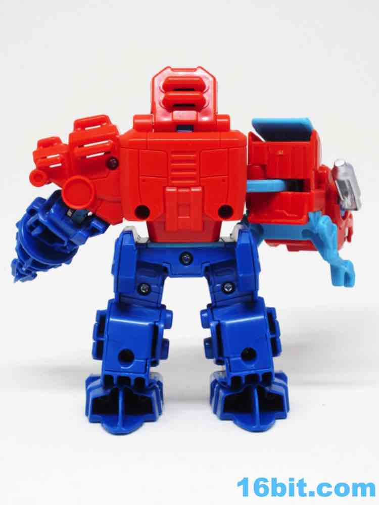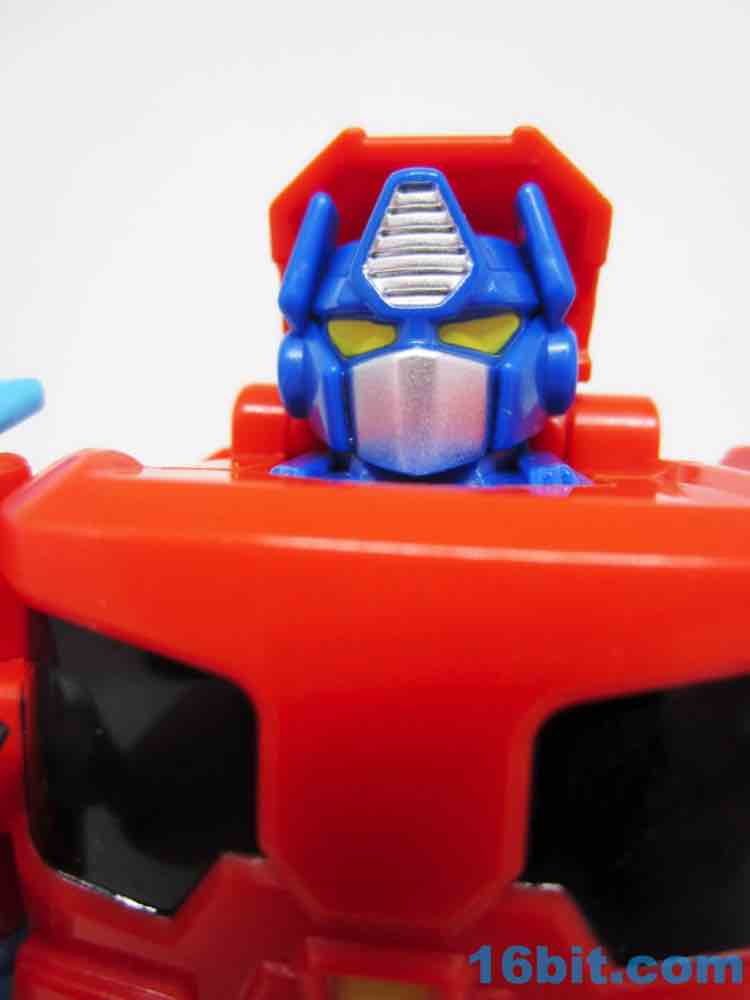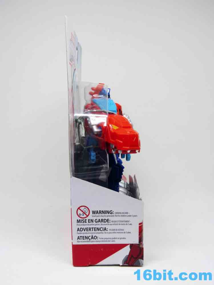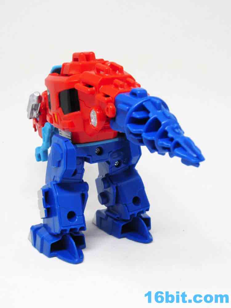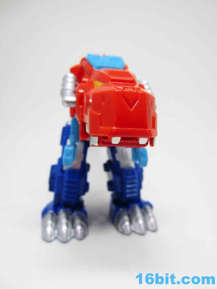 The 4 1/2-inch robot is, for all intents and purposes, a one-step toy. If you twist his legs, the robot arms fall in place and you get a dinosaur. The blue switch on the head moves the jaw to open and close... and that's all the robot does. Sculpting is good, with some decent silver deco and nifty true-to-G1's original Optimus Prime yellow eyes. Sadly the arms really don't move, the fist doesn't hold anything, and the legs are a statue. But it's fun. It really is.