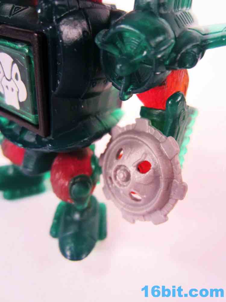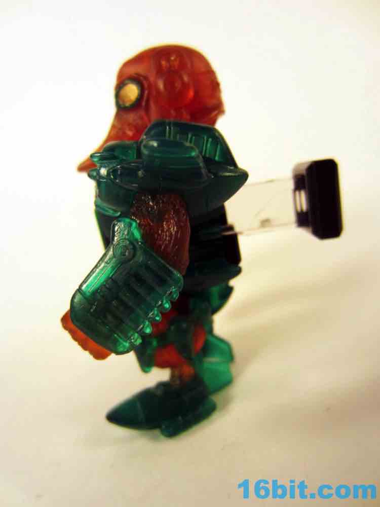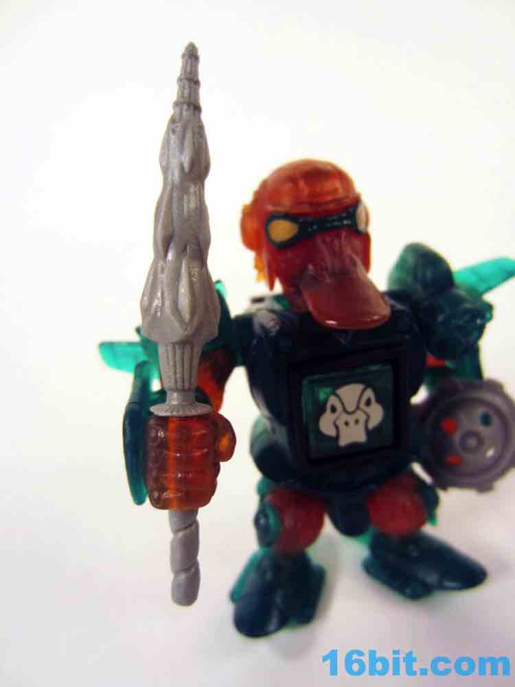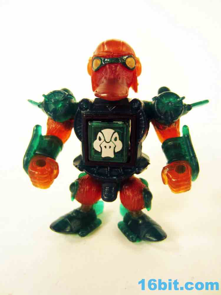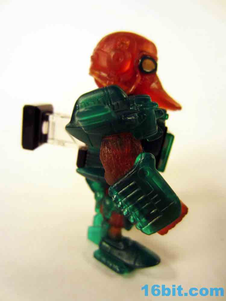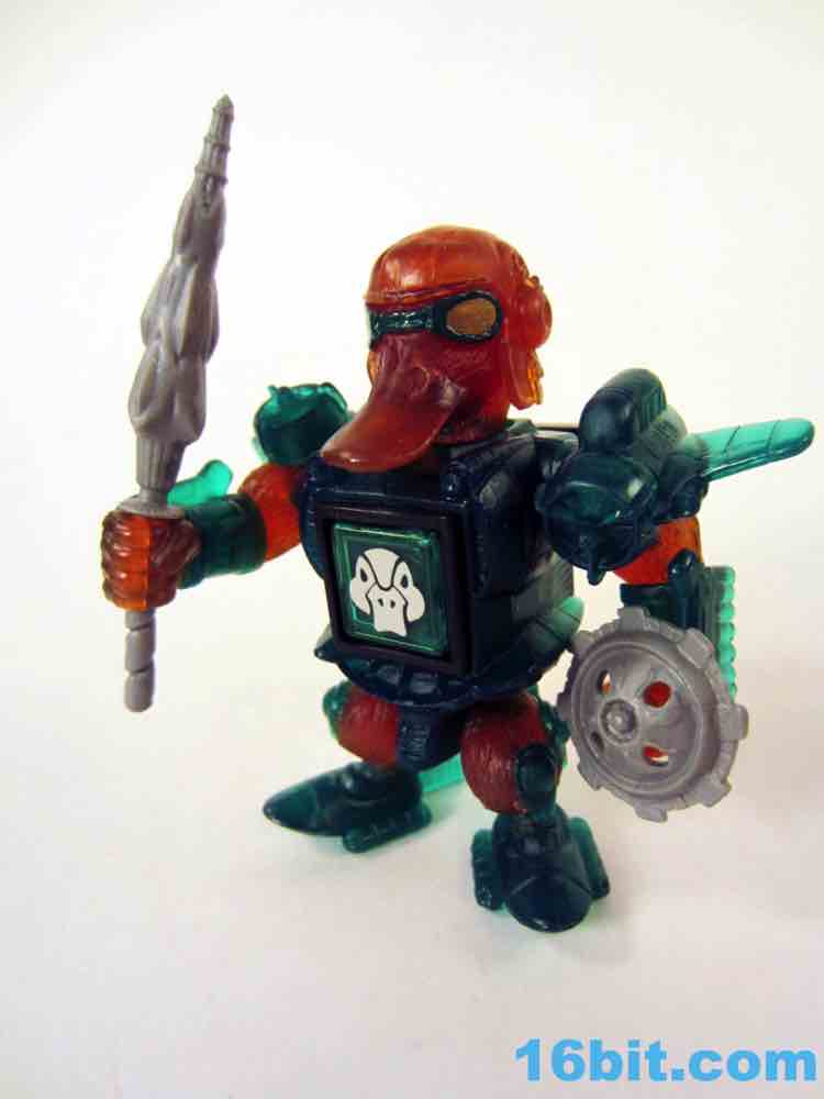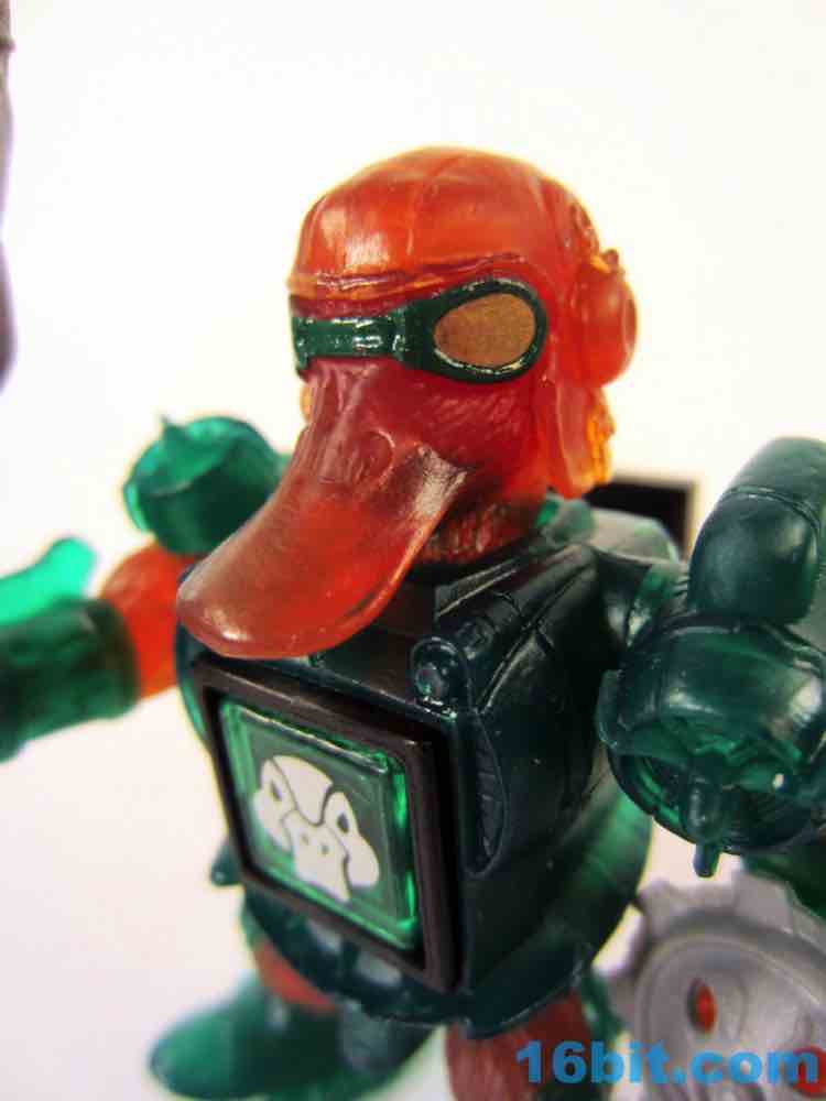 The dark green plastic makes this figure something of a gem. Hold it up to the light and color bursts forth form the murky plastics - the green coming off as a very thick Coke bottle glass, and the brown/orange parts looking more like the beverage inside. While there is considerable sculpted detail on the figure, the clear plastic does a good job of absorbing it. The good news is that it gives the figure a different quality than the painted counterpart, while the bad part is you can't really easily tell if the painted one is any good. It is, it's nicely done with jet engine shoulders, boat-like feet, and a head that was no doubt inspired by one Launchpad McQuack.