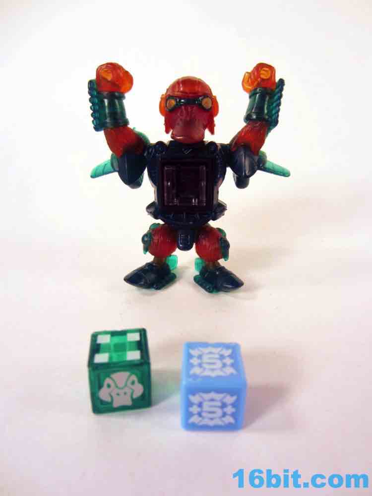 Surprising no one, Dacker Burst has 4 joints and stands 3-inches tall. You can move her shoulders and hips, and each fist can fit roughly 3mm weapons. Molded in color (mostly), the figure is an example of cost-cutting creativity in action. The only paint on the actual figure is the painted goggles - everything else is molded in clear color, printed on a die, or a sticker on the plunger of the dice launcher. It's nothing if not economical, doubly so when you consider that they double-dipped with a Dacker [FOTD #846] too.