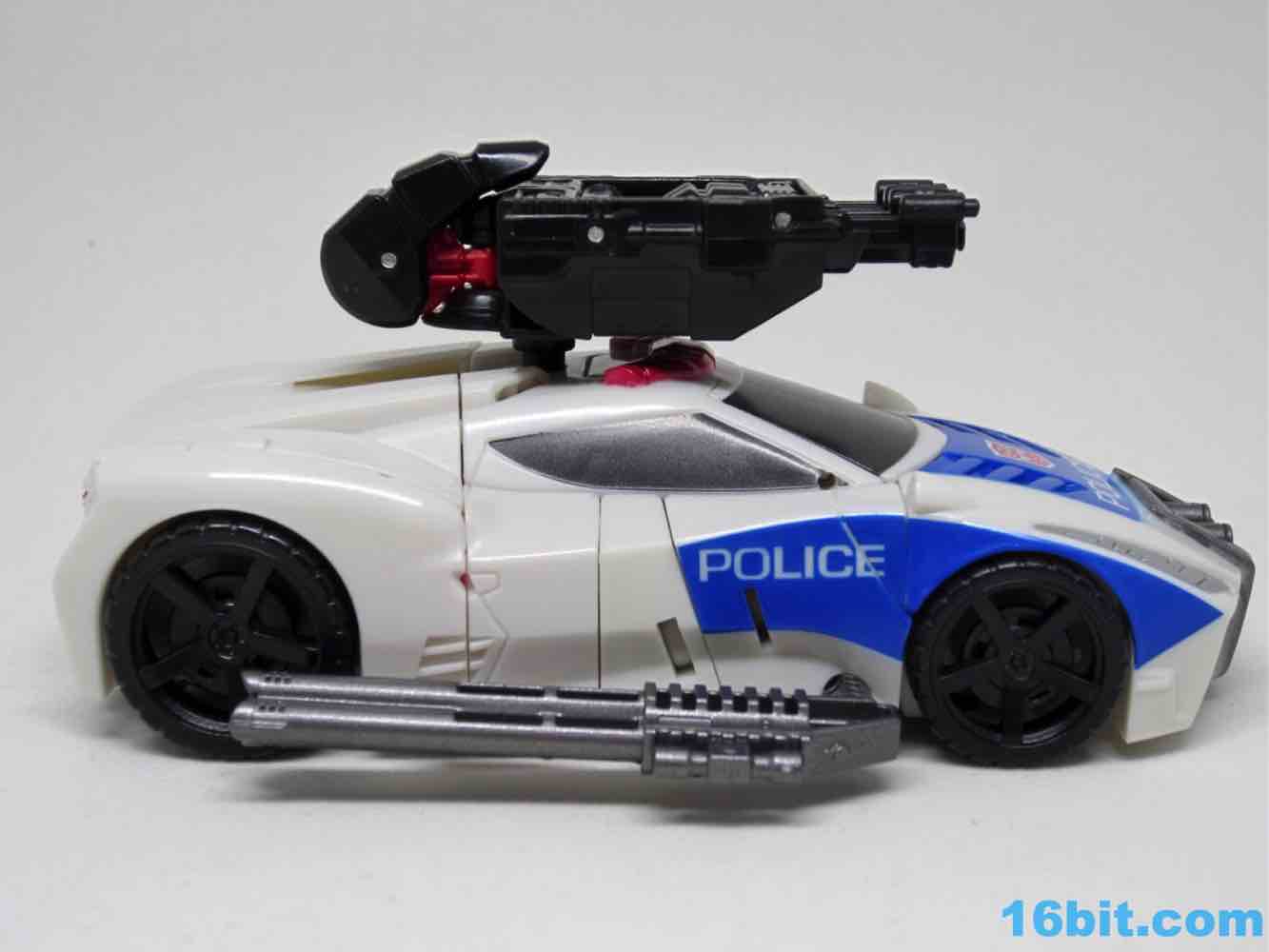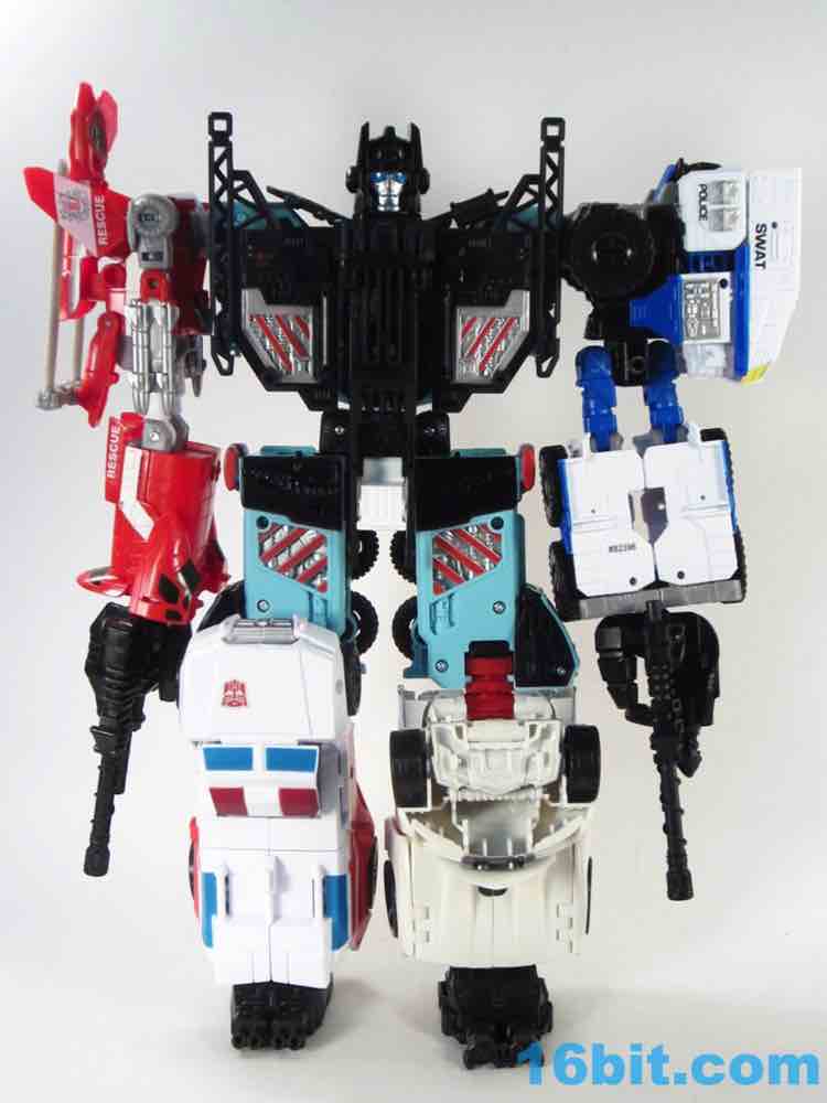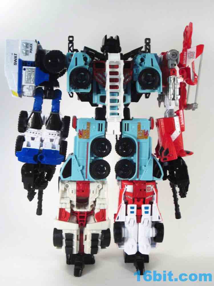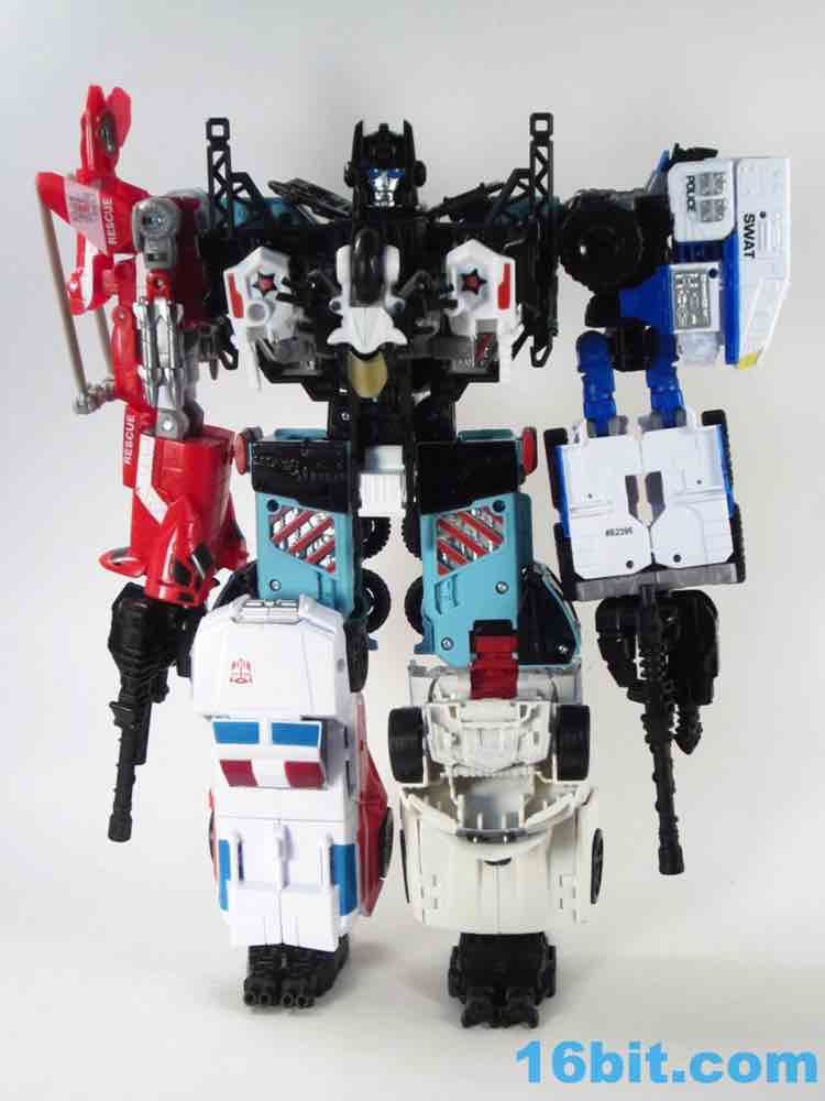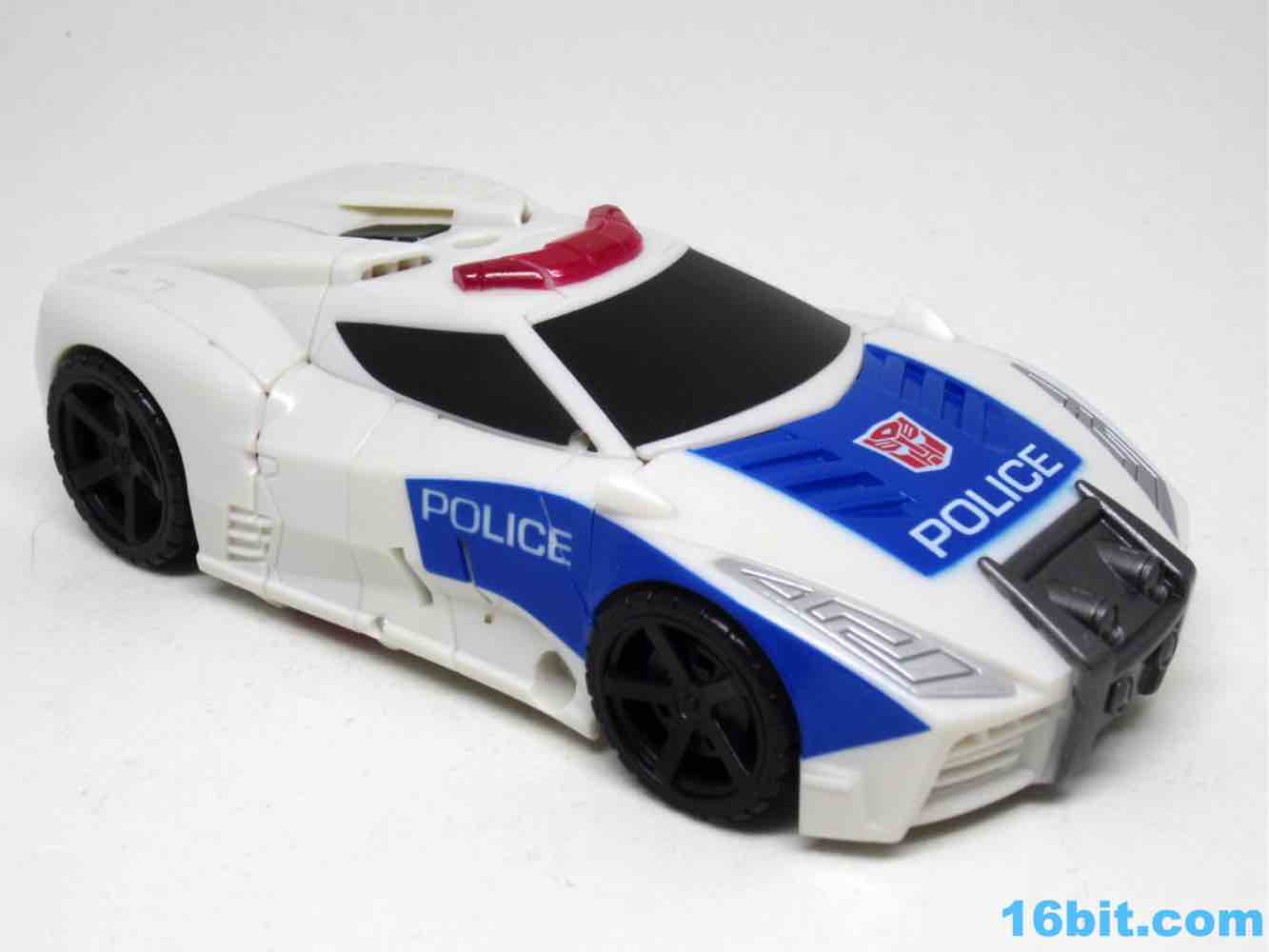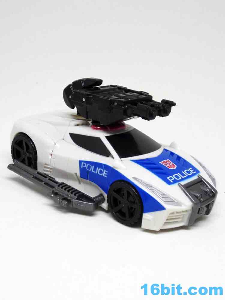 The transformation is nothing new, but the car is - they kept the red lightbar, but lost the big stars. We also saw added "POLICE" markings and some blue bits on the front half of the cruiser, which makes for a nice bit of updating to what could have been a slightly more boring looking toy. Of course, the blue is largely hidden in combined mode, so you'll probably never actually see it long enough to enjoy the extra mile to which Hasbro's deco team went to not bore you.