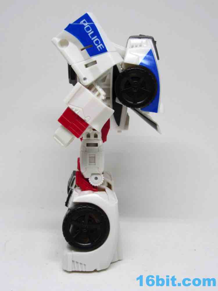 Streetwise' robot mode owes a lot to Prowl, but the paint job takes pains to bring you something colored like the original 1986 toy. A black chest resembles the windshield kibble on the original, and the red accents on the legs are a nice touch too. The robot mode sends the blue bits of the car (which were not on the original) to the back seat, leaving you with a nicely decorated robot. There's a lovely silver face, blue eyes, and a red-striped helmet to make this more than just another white robot toy. Each hand can easily hold his weapons, although the left elbow on my sample does not seem to agree with gravity enough to hold up the handfootgun easily. Streetwise has all the articulation you've seen on other toys based on this general design - over 14 moving parts, or more if you count some elements like the (arguable) double-shoulders. The white-but-not-bright plastic helps show off some sculpted detailing - you should notice a few of the grooves and techie bits even in less than optimally lit situations.