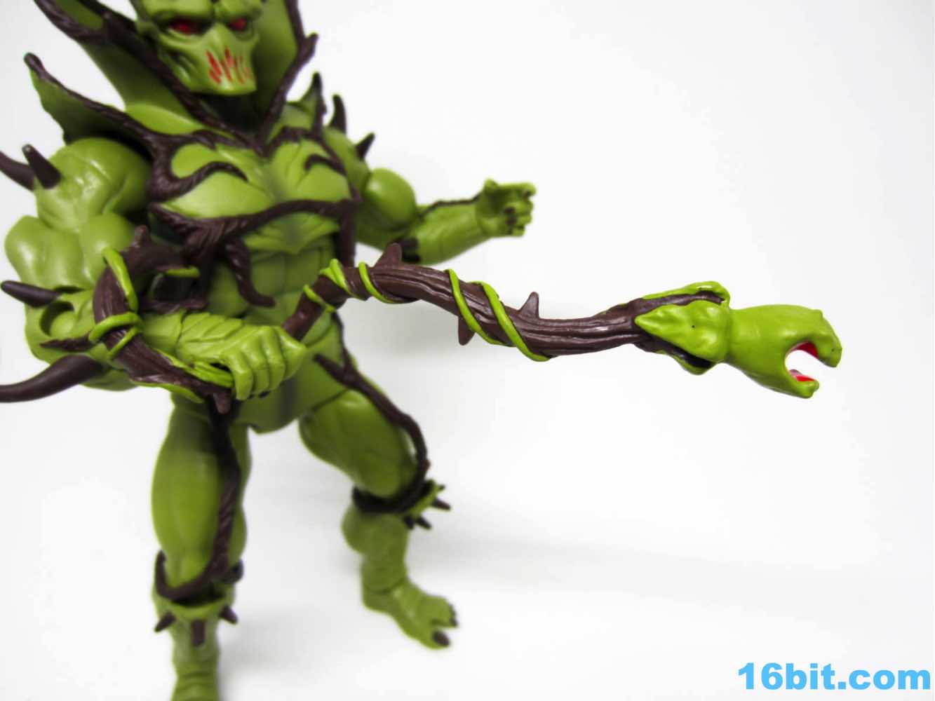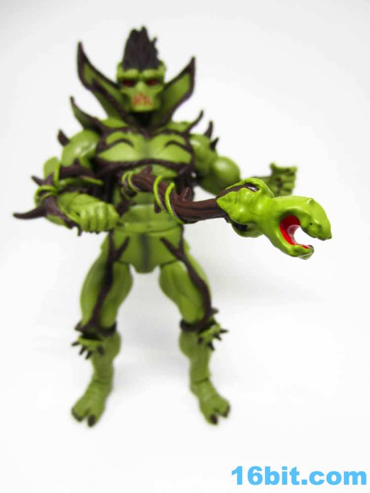 The fun thing about a line like this is some things get better as you go, and Evil Seed gets to benefit from something most figures lacked. The Four Horsemen did a spectacular job of updating the 2002-era design to a figure. Sure, at first glimpse you'll go "Uh, Swamp Thing?" but that's OK. It's a plant guy, and given we already have Moss Man it's reasonable to make a different looking guy. The figure is covered in vines - some are connected to his "armor" vest, while others are actually parts of a "shorts" piece around his waist. The ones on his forearms are sculpted, though, and he has a few thorns on his person as well. You'll notice little veins and cracks all over, giving him a look that could potentially be adapted to some sort of lizard or snake man down the road. His face looks like it's burning from within, complete with a face that looks like Darth Vader and a furnace got together to give you nightmares. A trunk for hair and a huge collar make this guy look severely evil, which works well given his name.