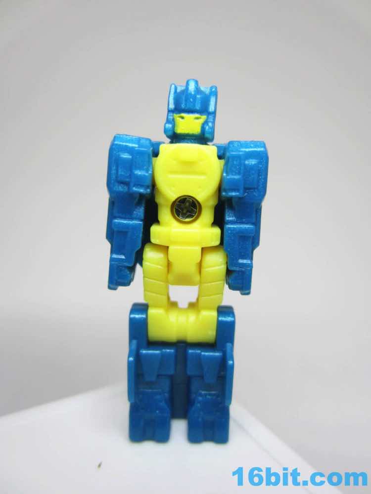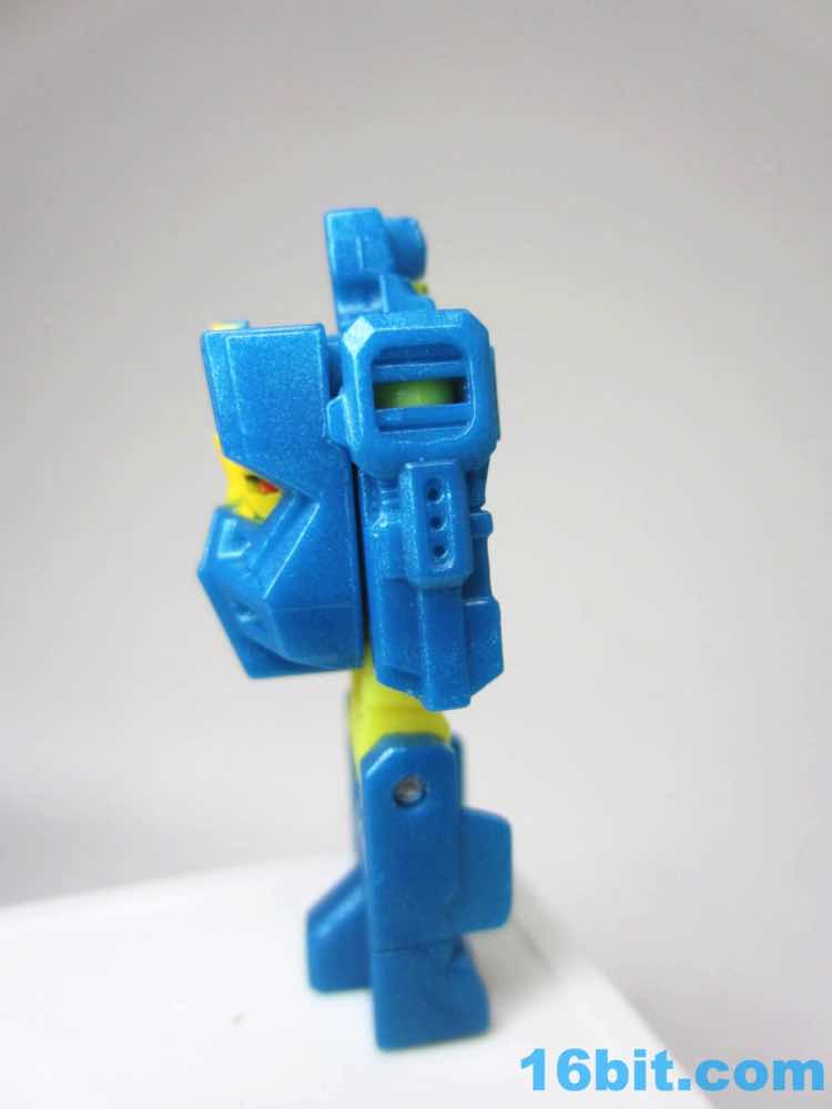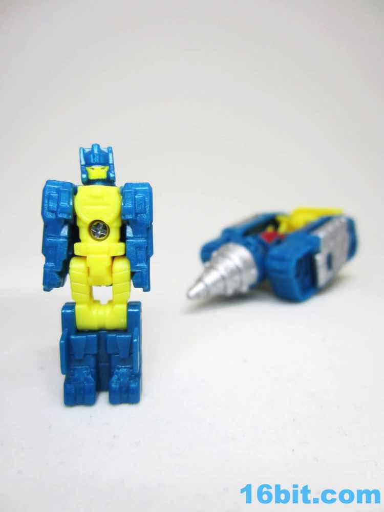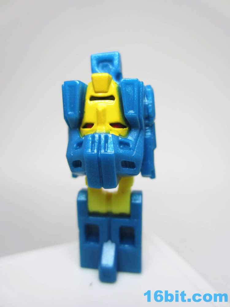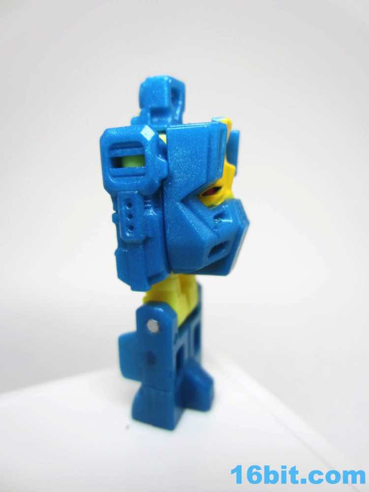 This 1.5-inch robot is sort of similar to Muzzle, the original 1988 Nightbeat head. The coloring doesn't quite match, the sculpting is different, and this one has slightly more articulation - you can move his neck, shoulders, hips, and knees. The figure has enough articulation to ride the jet mode of his vehicle like a hydrofoil, or to be plugged in to the jet mode through the application of Brute Force. He has a face mask, a visor, and the blue and yellow coloring a Nightbeat needs - but it's not quite a perfect match. This Nightbeat is his own man, and doesn't really work well as a match to the original toy in any way other than a passing similarity. It holds together nicely, and if you bend him over he turns into a Nightbeat head.