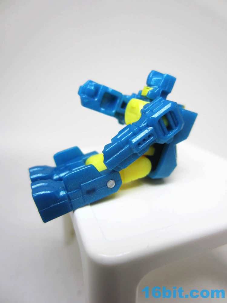 The vehicle mode by default is a little jet - the wings fold down, and the figure basically lays on top of it. There's a nice red canopy, tank treads, and a little bit of yellow to bring it to life. The figure plugs in to two very small pegs near the back, holding on for dear life as you wave it around your desk and make "whoosh" noises. The metallic blue plastic looks great, and the yellow very closely matches the aforementioned recent Nightbeat toy. I should also note, the vehicle seems to be completely plastic - much like recent Mini-Cons, metal pins and screws were seemingly engineered out in the name of efficiency and/or cost reductions.