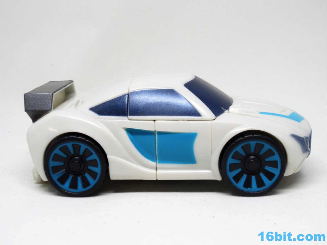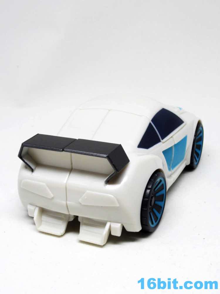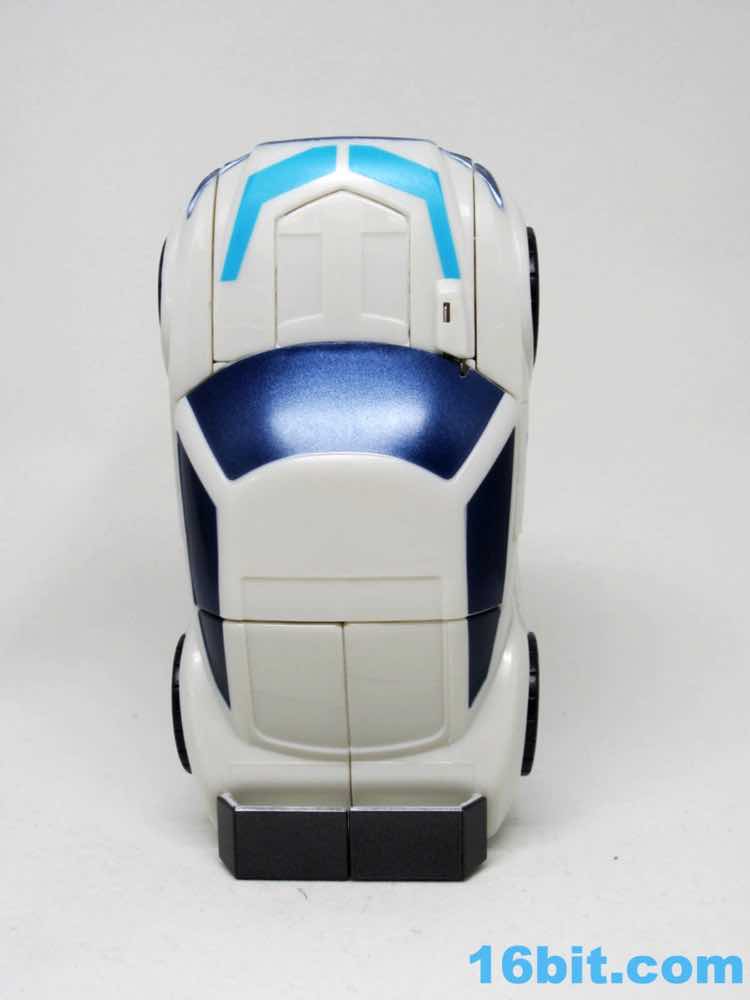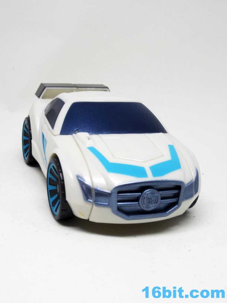 The car is a car - it's white, it has some blue on it, and they painted most of the windows. I'm surprised only the rear window was left undecorated - but not as surprised as I was by the spiffy painted grille, the blue on the doors, the painted spoiler, and of course the aforementioned blue on the wheels. The car mode is very nice, and the wheels roll freely. I realize this is coming off as a book report, but it's always kind of stunning when the toy meant for toddlers turns out above and beyond your expectations. She's neat!