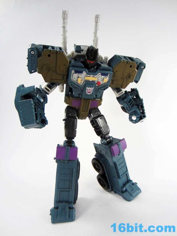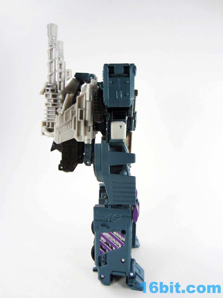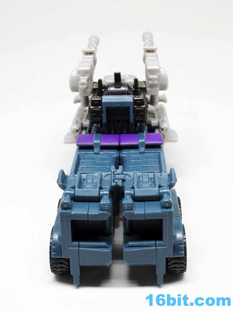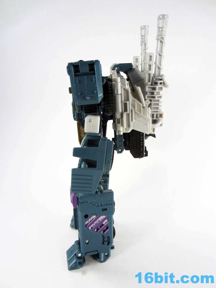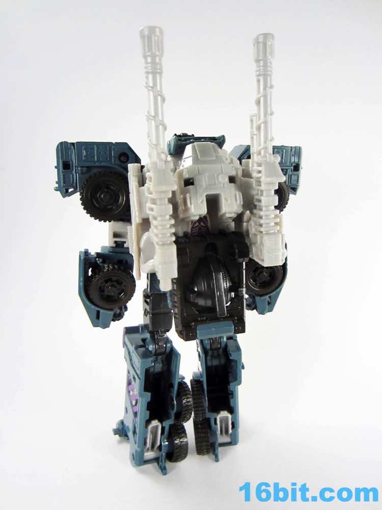 As with the other torsos, Onslaught is a 7-inch tall robot mode with decent articulation if you get the knees formed correctly. Double-jointed elbows are scarce, but are necessary for the figure to really do what it needs to do. The deco is a pretty impressive piece of work, replicating labels from the original toy while also downplaying the fact that just a few months ago we all bought this as a blue fire engine. The robot has new shoulders, a new head, and a new chest which do a bang-up job making you forget his original identity. Granted, the knees with the purple emergency lights are something of a dead giveaway. Of all the modes, this one works out to be the best - everything fits, including the two cannons as the classic over-the-shoulder weapons.