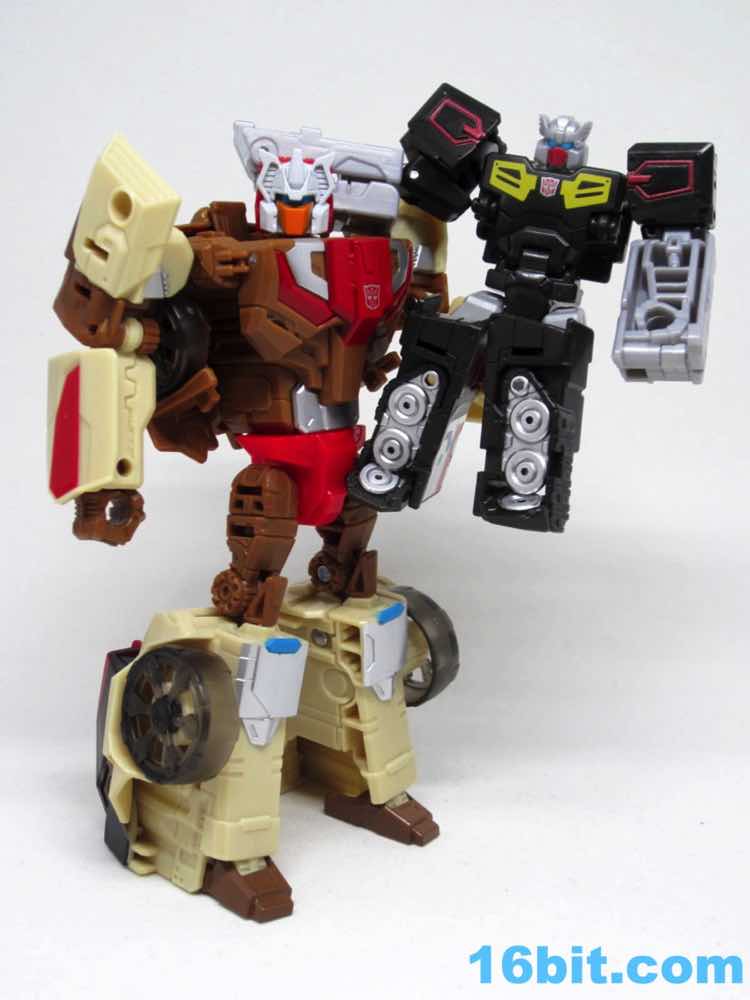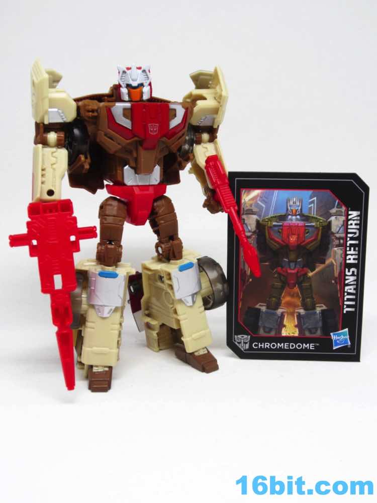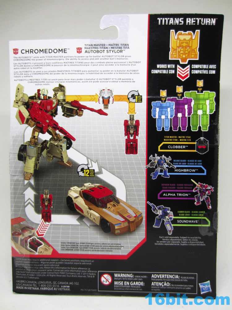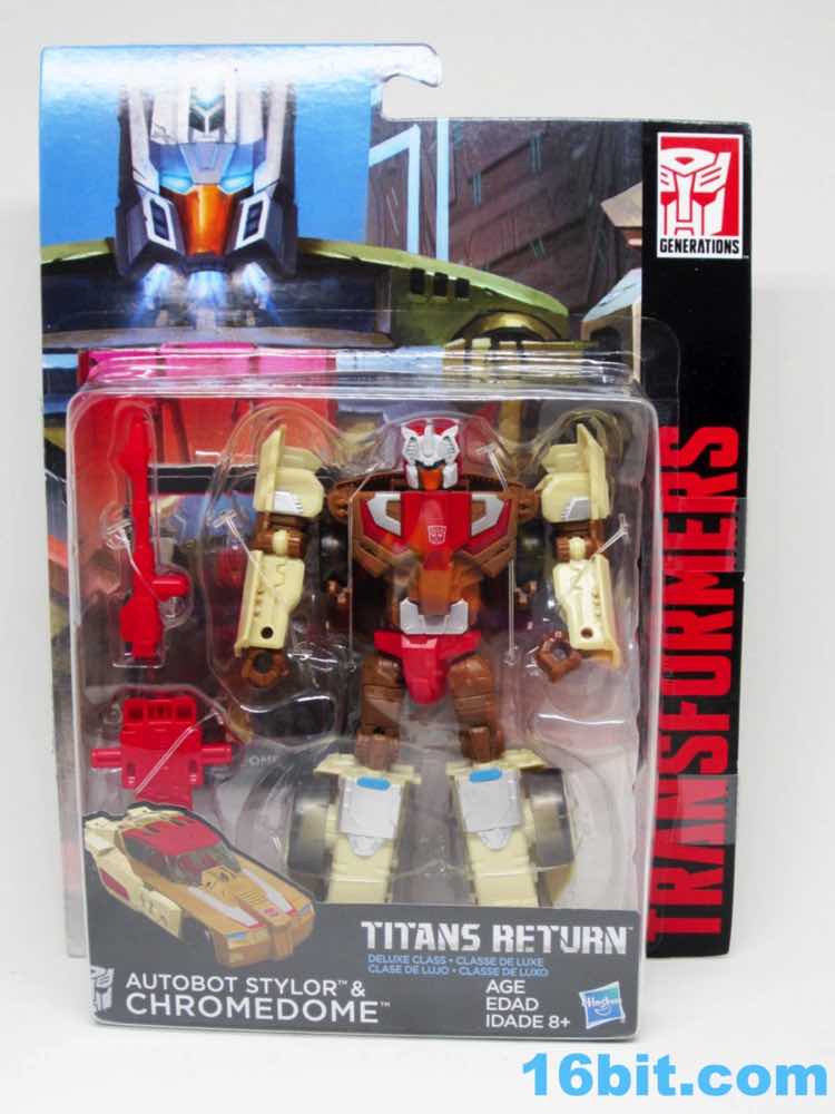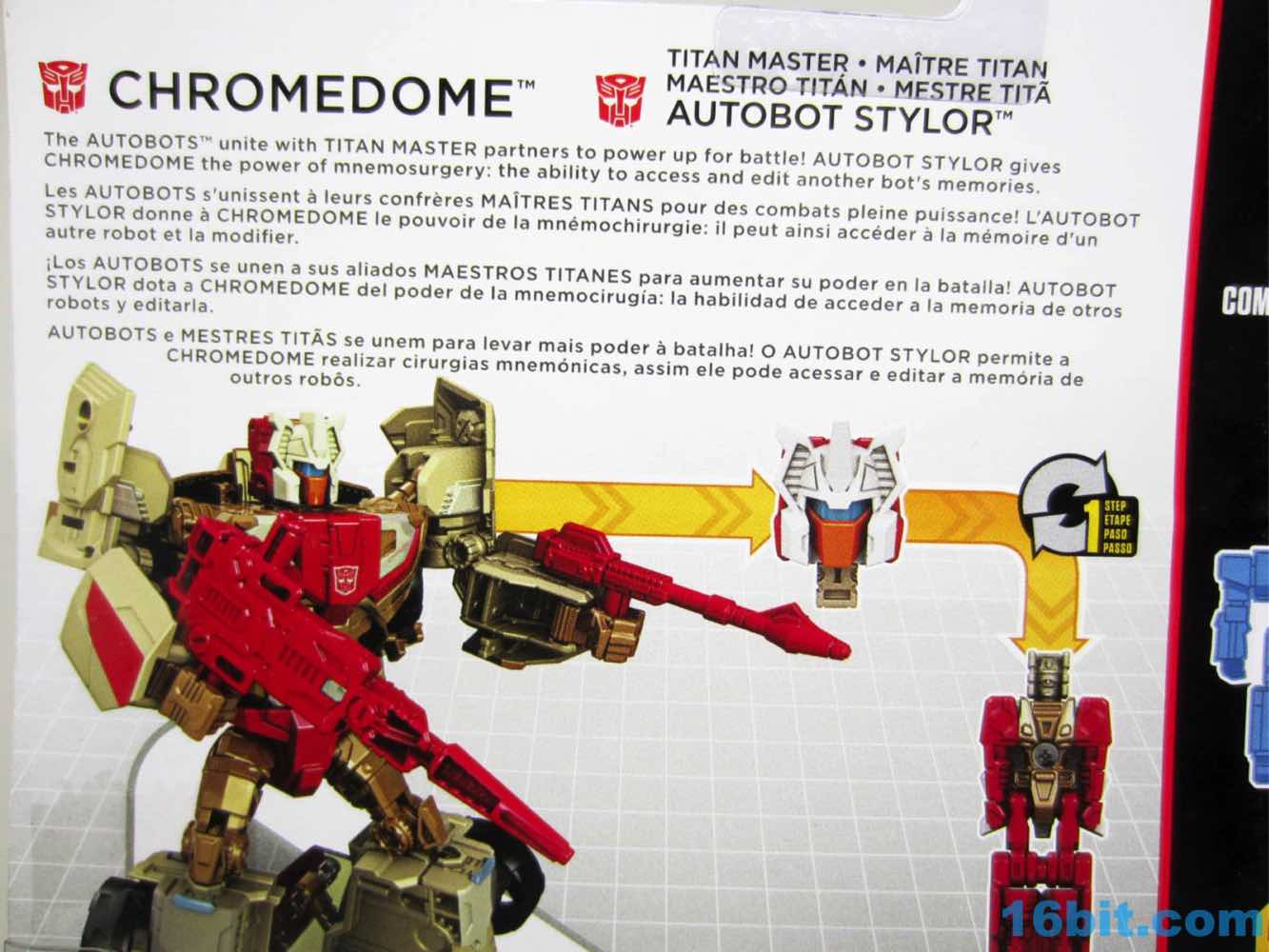 The amazing thing about comic books is that they can make a nobody character a hero. In the 1980s US Transformers cartoon, you had a bunch of characters get introduced and disappear. In Japan, some would get massive cartoon series focusing on them to whatever end they saw fit. With Titans Return we get a take on Chromedome which borrows heavily from the original toy in terms of colors, but the head sculpt comes from the mega-popular More Than Meets the Eye comic book - which has Chromedome and Rewind as a couple. Autobot Stylor has yet to work his way into the story, but the toy colors on the comic model for the head works nicely.
