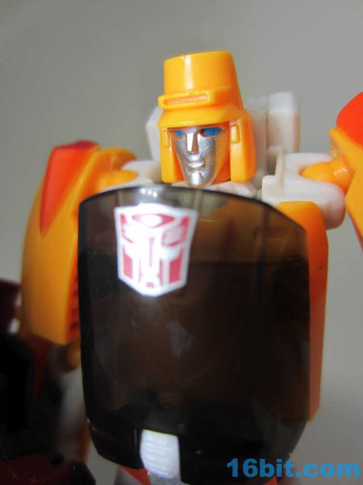 I love how the head sculpt looks a little bit better than the last few, and the coloring is similar to the TV show to the point where I can recognize it as Wheelie. His 5mm fists have no problems holding most weapons, so you're basically going to get your money's worth - just note that the clear glass on his body has pegs which fit in the torso, but don't necessarily hold him together as perfectly as you might like. It's a good guide, but it doesn't clamp it shut.