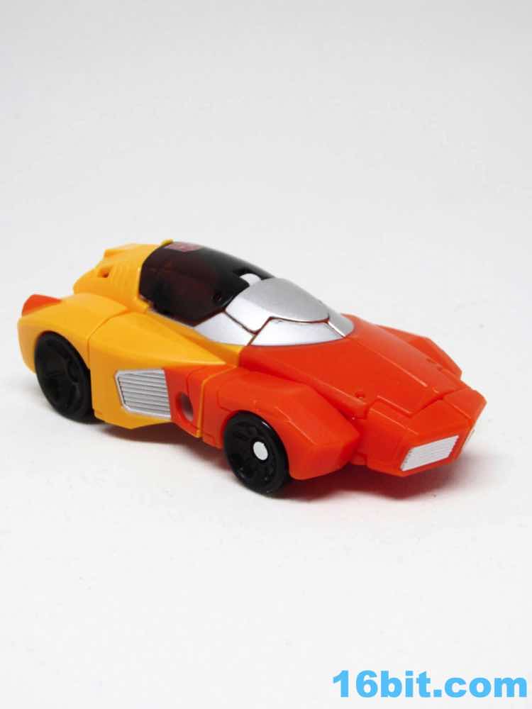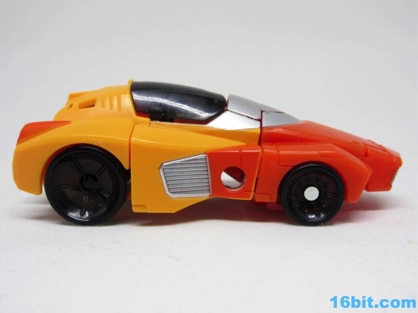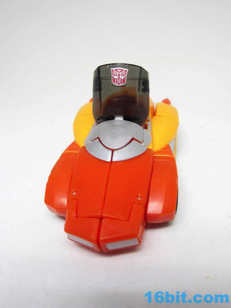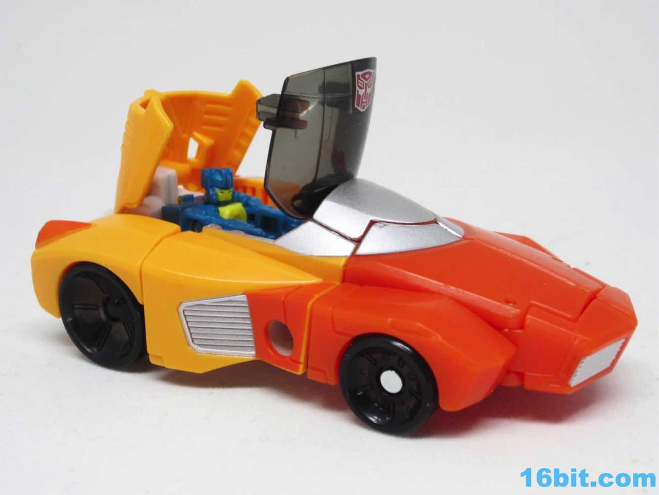 I quite like the futuristic car mode, as it looks a lot like it did on the cartoon as well as in the original toy line. It has a lot of orange, clear smoke wheels, and it can roll on my desk. It's also a little gappy in spots, mostly because of the aforementioned fit issues. As a display piece it's fantastic - I don't know how it will hold up under severe play with the tiny tots, but it sure looks cool. There's a nice Autobot symbol on the roof, and the coloring is pretty much what you would want. There are 5mm holes in the sides where the fists live, so you can mount some gear on the sides if you really want to. (You don't.)
