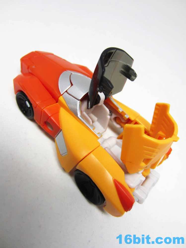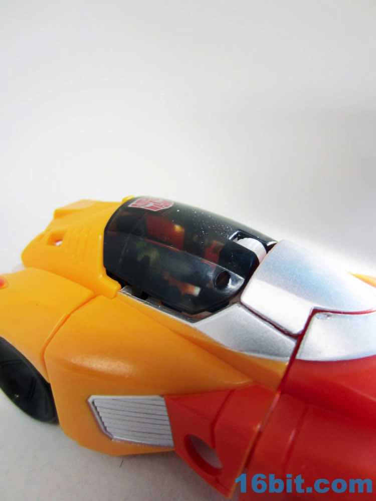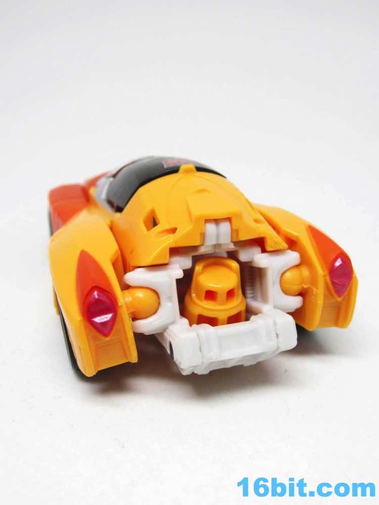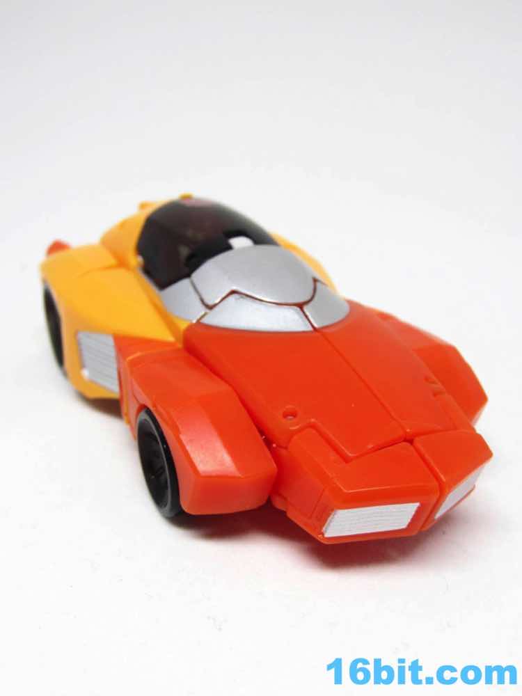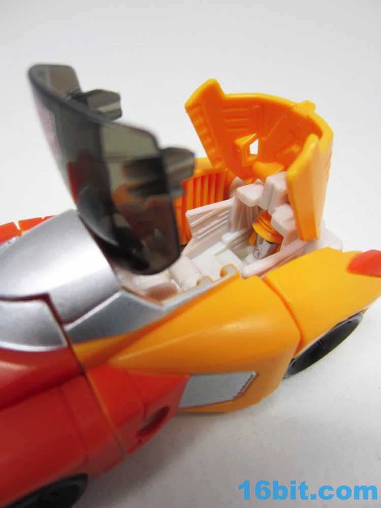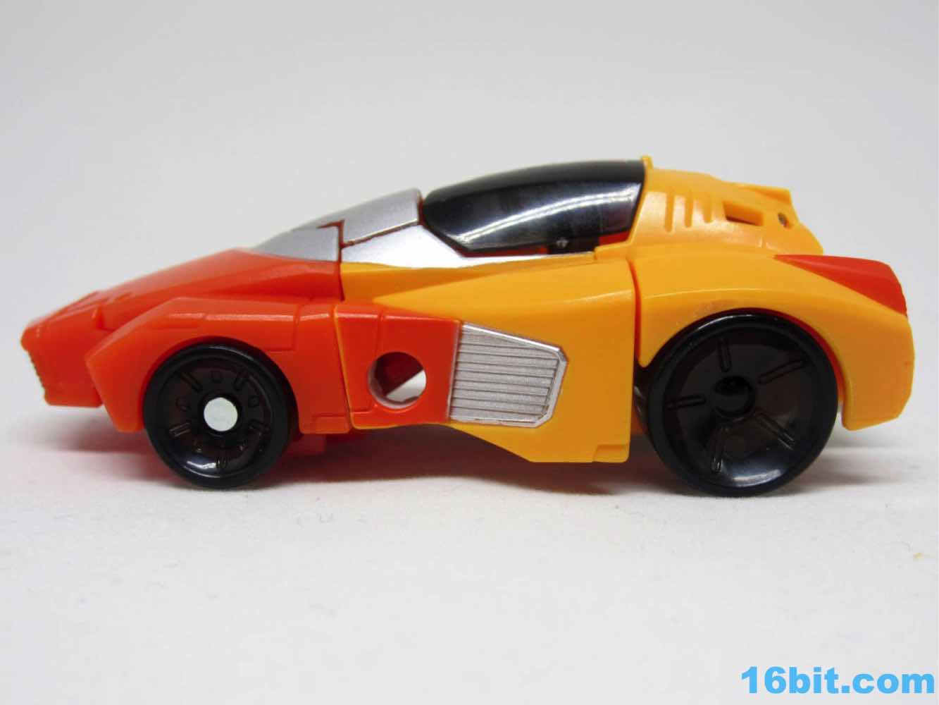 I quite like the futuristic car mode, as it looks a lot like it did on the cartoon as well as in the original toy line. It has a lot of orange, clear smoke wheels, and it can roll on my desk. It's also a little gappy in spots, mostly because of the aforementioned fit issues. As a display piece it's fantastic - I don't know how it will hold up under severe play with the tiny tots, but it sure looks cool. There's a nice Autobot symbol on the roof, and the coloring is pretty much what you would want. There are 5mm holes in the sides where the fists live, so you can mount some gear on the sides if you really want to. (You don't.)