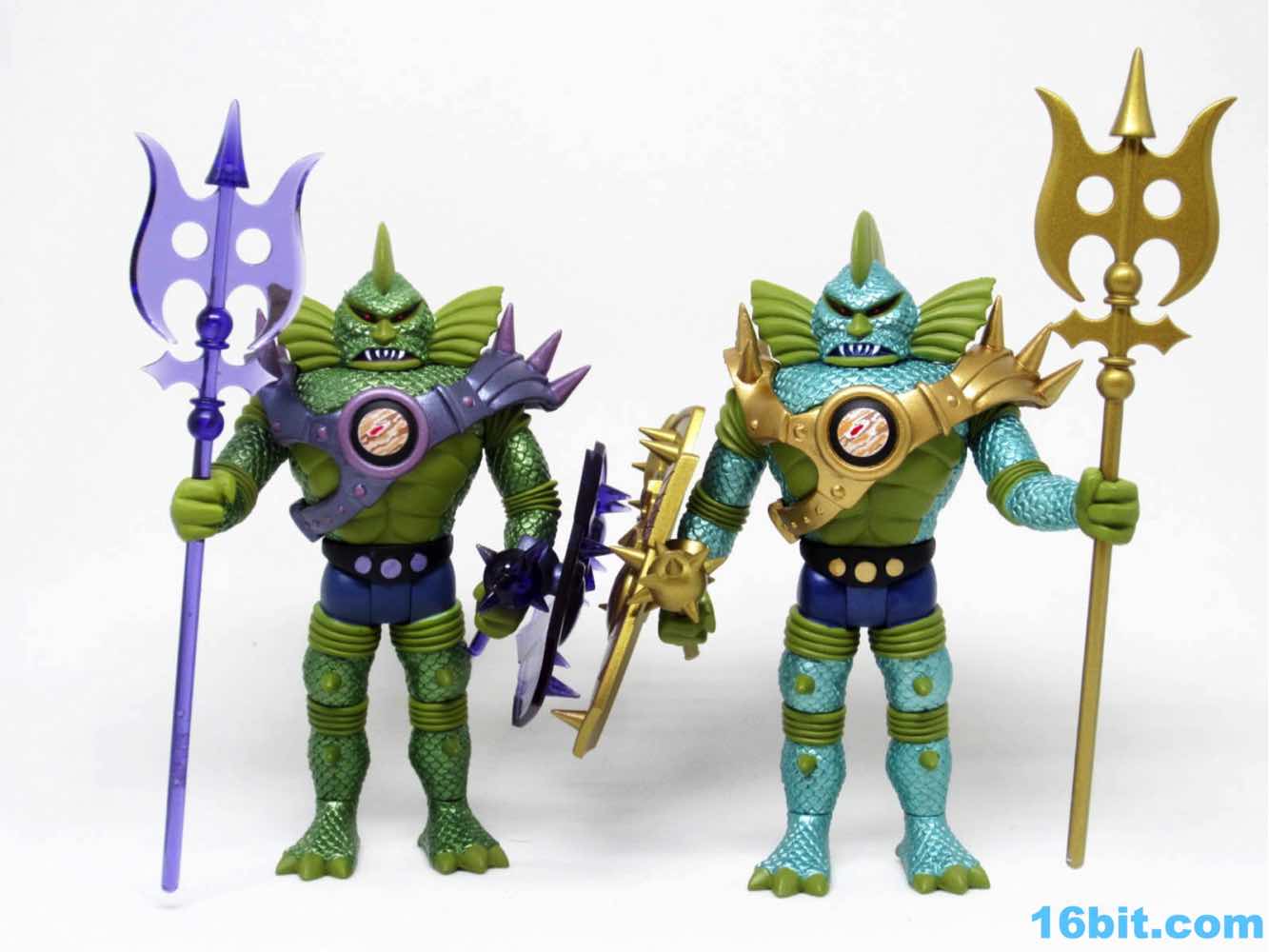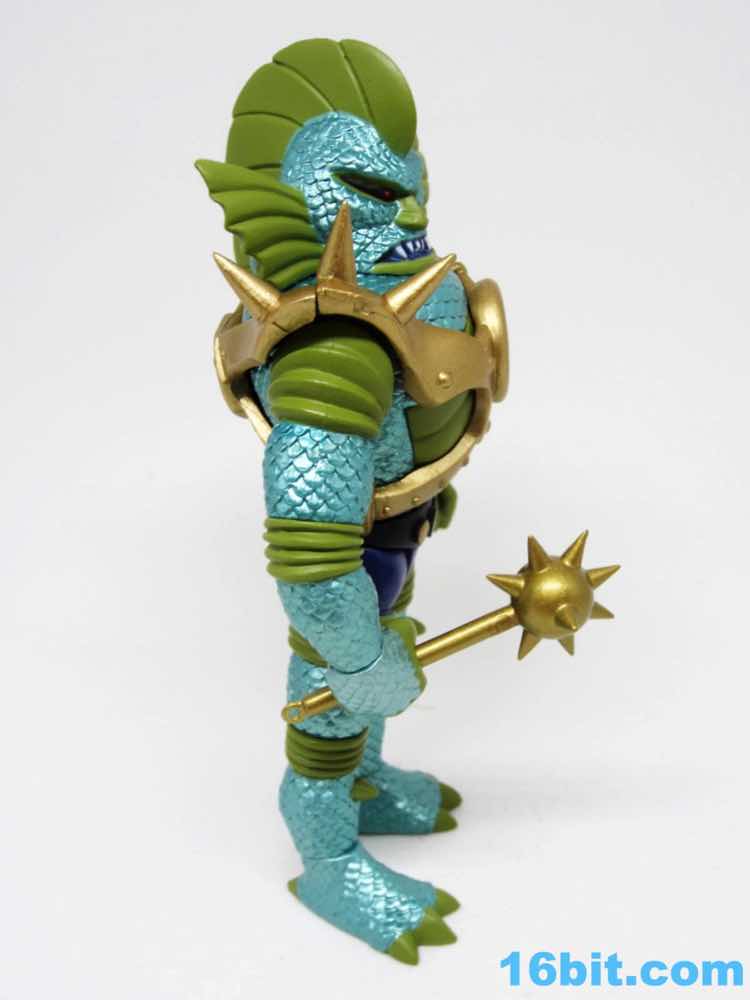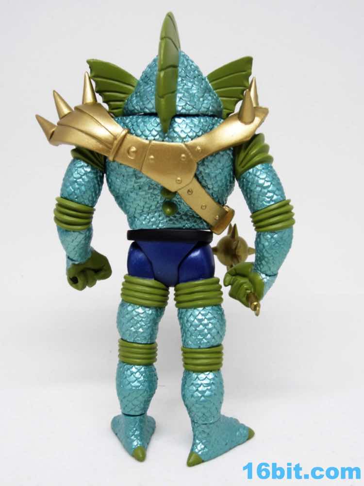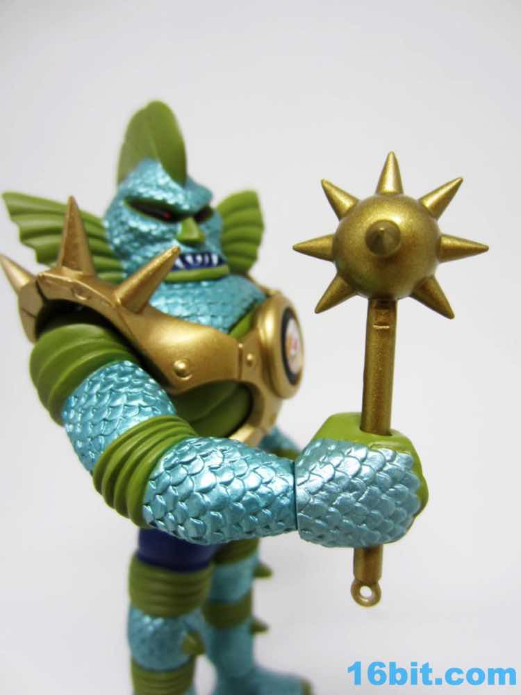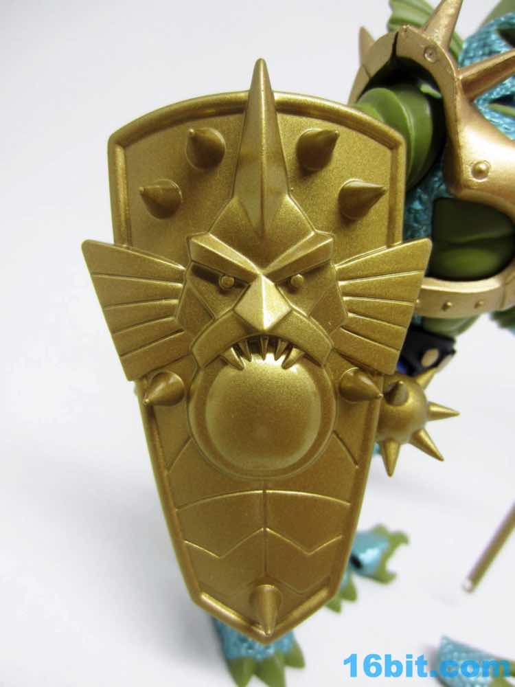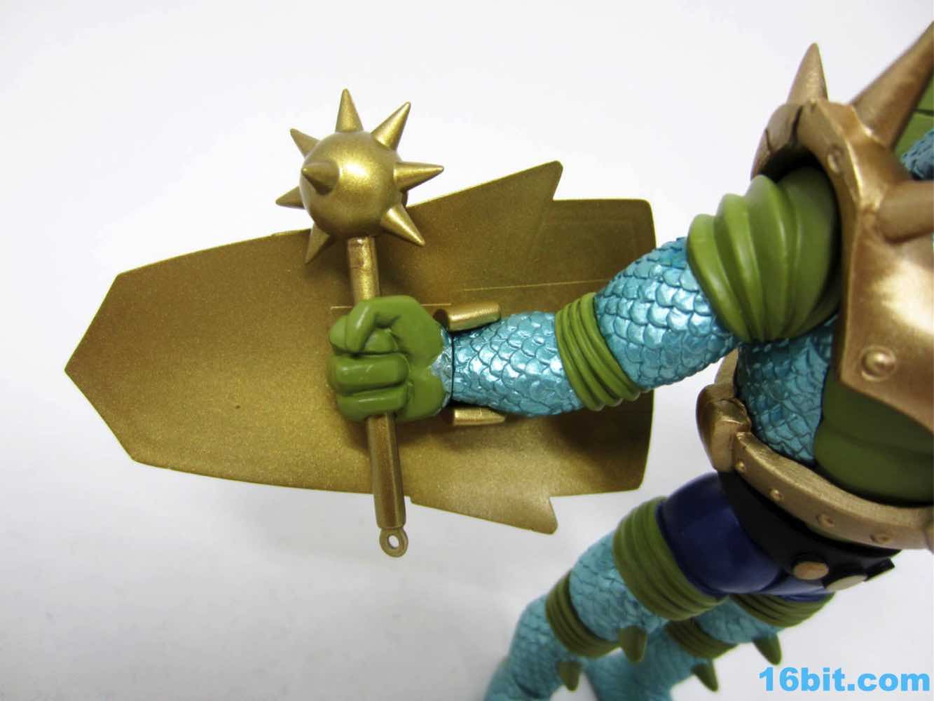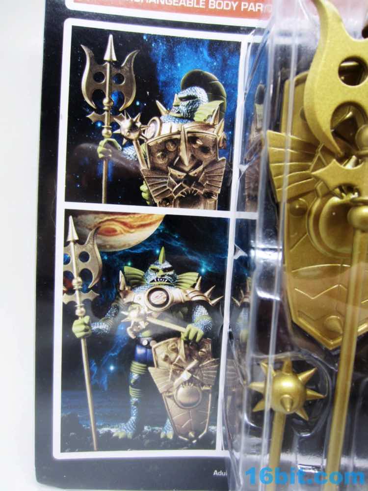 His accessories are where this figure departs from the originals, which is either good news or bad news depending on how you view "collectibility" in toys. Me, I just want you to get your figure - but some people want many visible changes so they feel their original purchase is, somehow or another, preserved. As such, the accessories are also altered with the clear and metallic purple tints being swapped out for gold armor, a gold shield, a gold axe, and a gold mace. They do look more imposing than the originals, which were all inspired by the Colorforms' bendy figure's candy-like purple mace. It sort of looks like a magic wand, but it seemed appropriate given that he's a big alien gladiator and gold looks a bit more menacing than purple.