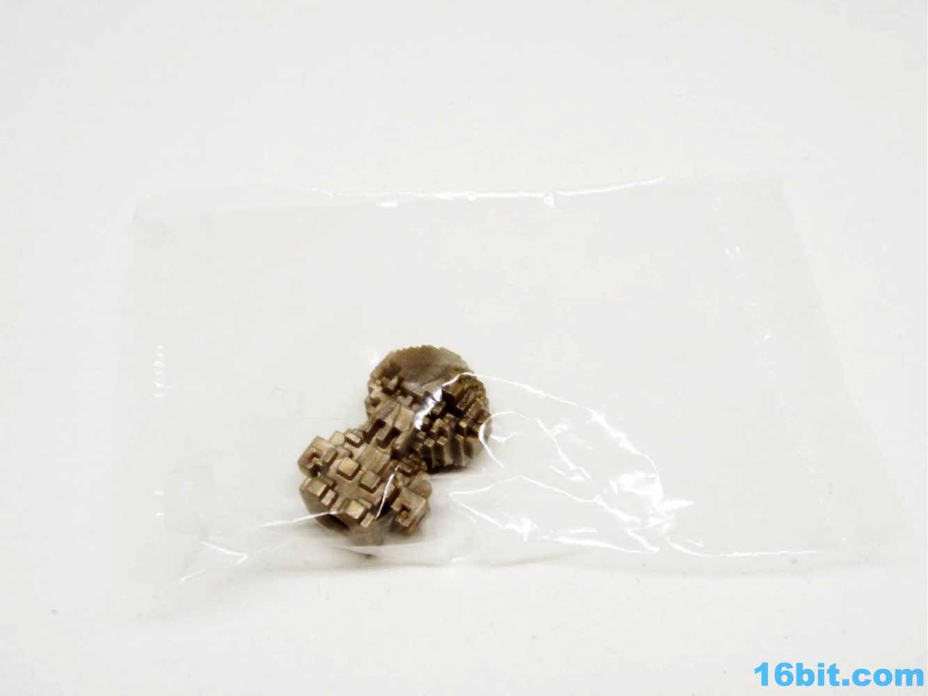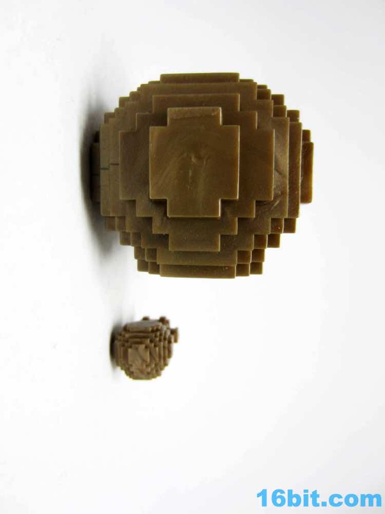 Big Pheyden and small Pheyden were cut from the same cloth, but not the same exact models. The tiny 1-inch figure has slightly different pixel counts in the hand area, plus the legs aren't visibly separated by a groove like on the larger figure. This is, no doubt, to make room for the Glyos socket on the bottom of the feet. Bit Figs Pheyden is notable in how he differs from the normal Bit Figs underneath, as he lacks any Glyos markings or a year - the farm animals and ninjas are all labeled "GLYOS 2016." Tiny Pheyden looks just like the icons you've seen on the Onell Design site for years, but he's in 3D and has physical form. Each pixel is blocky without being incredibly sharp, and he has a feel not unlike vintage M.U.S.C.L.E. figures. He's vaguely rubbery, but not too rubbery.
