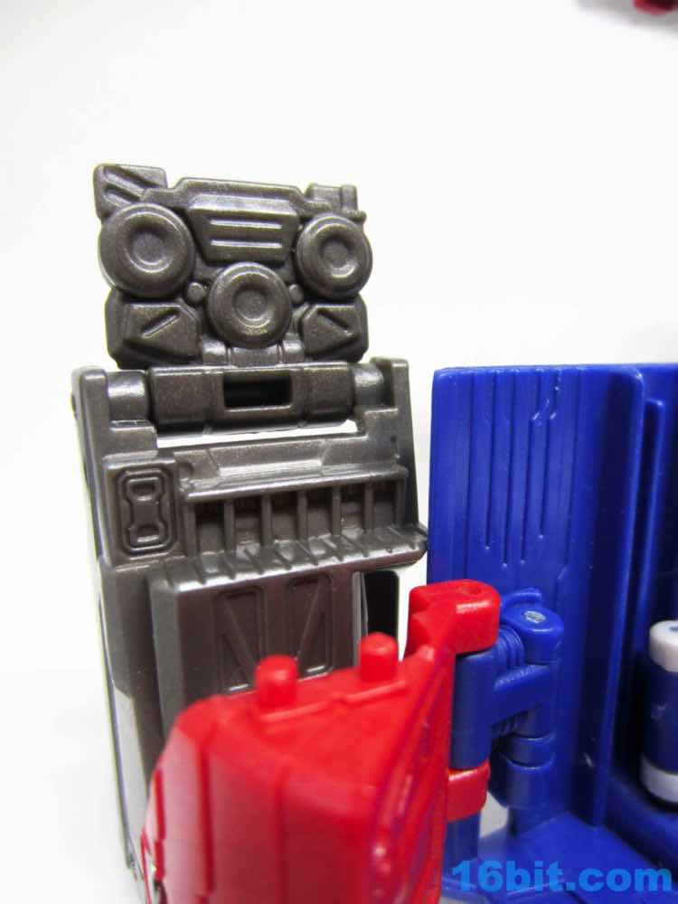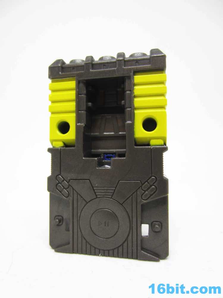 The iPod/MP3/tablet slug - it's the same size as Blaster's, except it has been cast in grey and now has yellow highlights painted on it. It certainly makes it feel distinctive, and takes away from the iPod illusion. It's a tight fit when it comes to getting Soundblaster stored in there or riding inside, but you can cram his tiny noggin in the slot if you really want. It's just tight. Too tight.