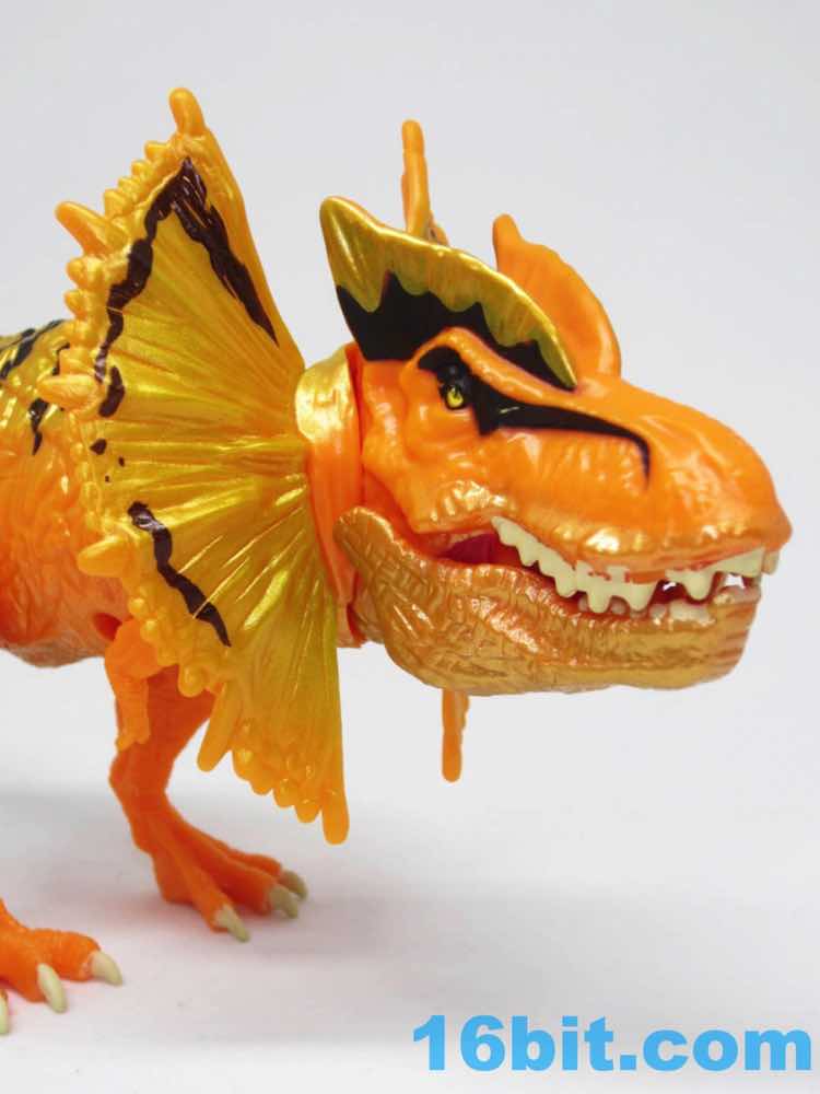 The classic spitter dinosaur may not have actually had a frill, or spit, but it's a good image. Adding this flourish to the T-Rex works nicely, as the head is very similar to the regular Bashers & Biters Tyrannosaurus Rex [FOTD #1,228] with a few changes. Actually, it seems to be entirely new - the neck piece has the added frill, the jaw is completely new, and the main head piece has the added enhanced brow on it. The construction of the head is quite different, so it's nice to see they made those changes - it might not be necessary, but it's better than just slapping a removable collar on the existing toy.