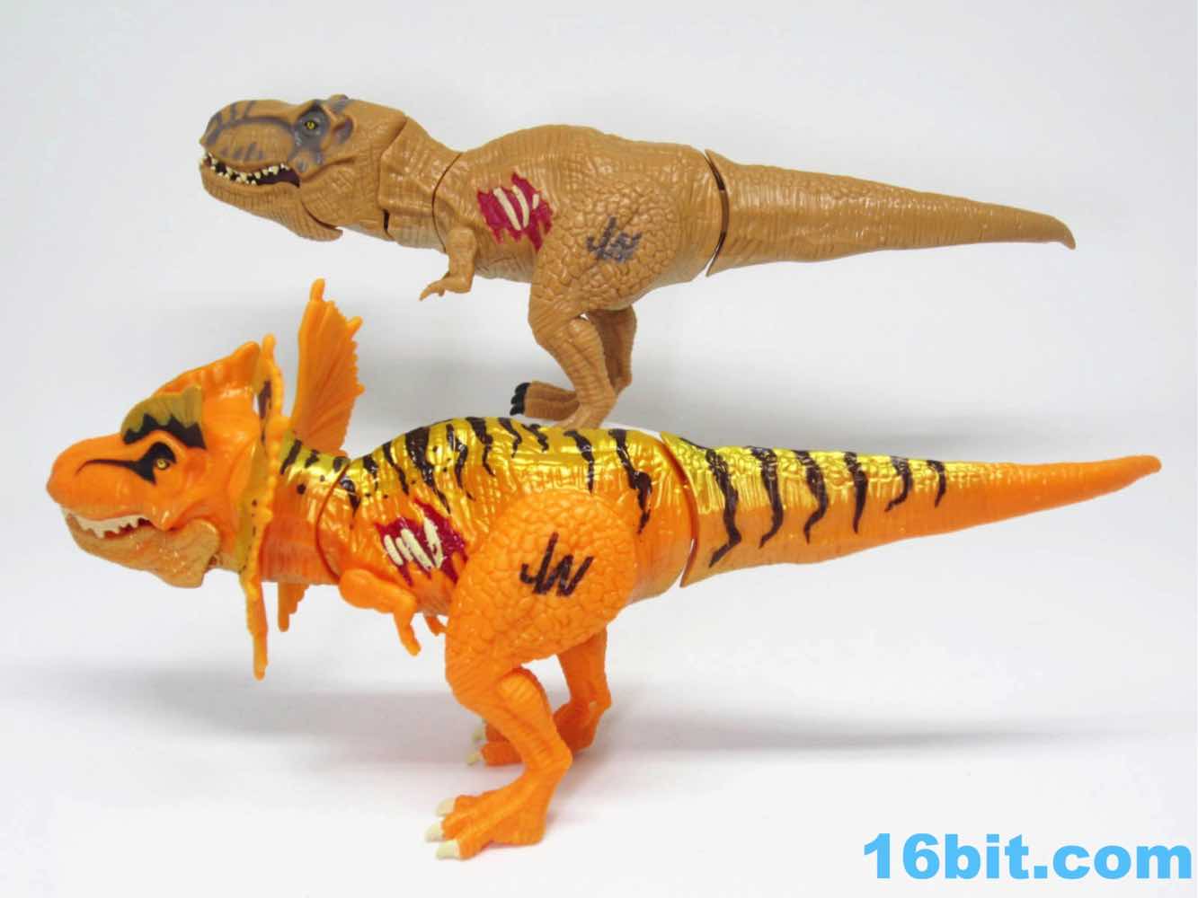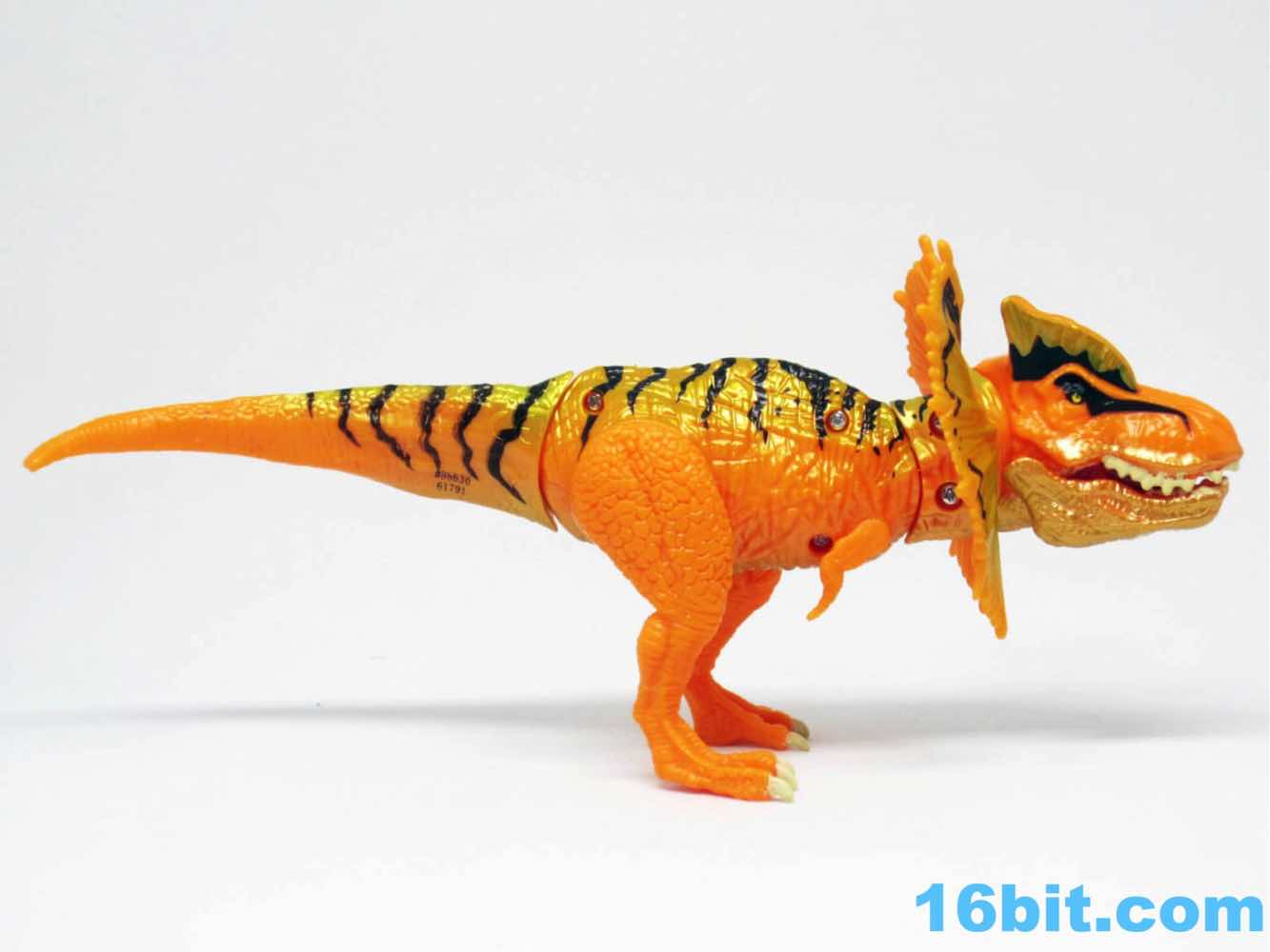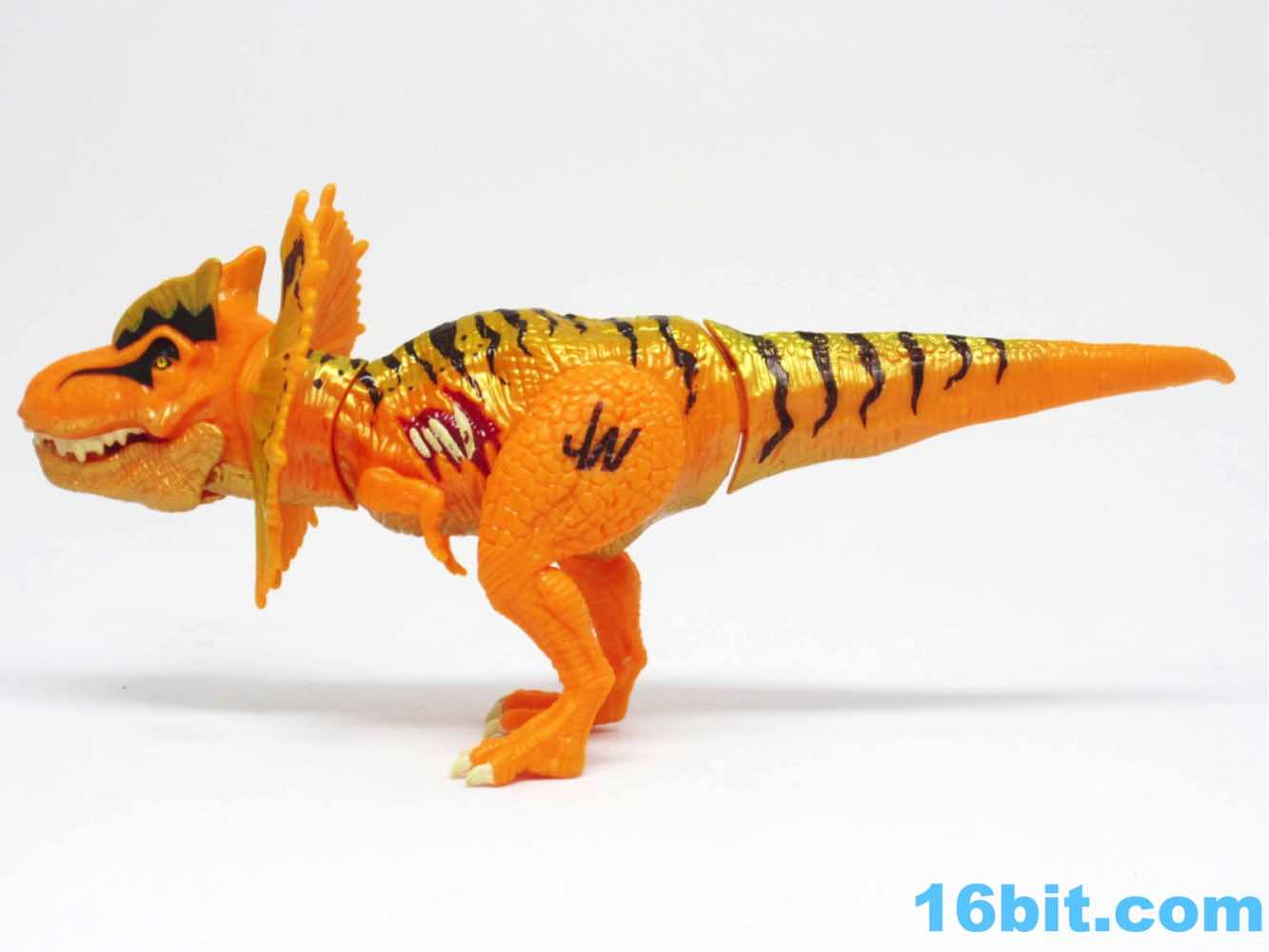 If you see the Dilophosaurus Rex, it's probably worth getting for whatever retail (or closeout) price at which you see it. Ten bucks or less, it's a weird little toy that I assume you won't see again. The last big push for bizarre mutant dinosaurs was in the late 1990s, so next time most of us will be dead. Well, maybe not, but it'll certainly be a while before this kind of weirdness shows up again - especially since this might be one of the last waves, if not the last wave, of this size class to come out of Hasbro. Because it looks like a weird designer toy shoved through the lens of a kid's toy, I have to love it - there's not much else like it, so I got my money's worth. If nothing else, the paint job is above and beyond what the normal toy had, given its unpainted back and lack of metallic bits. The new one even still has the wound!