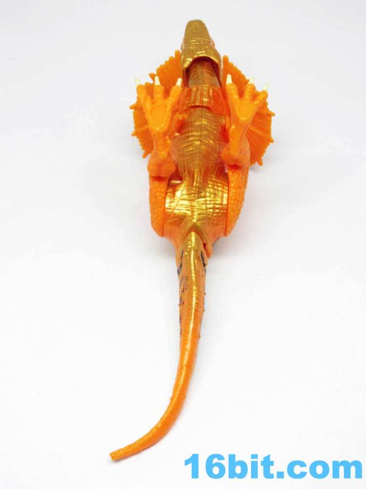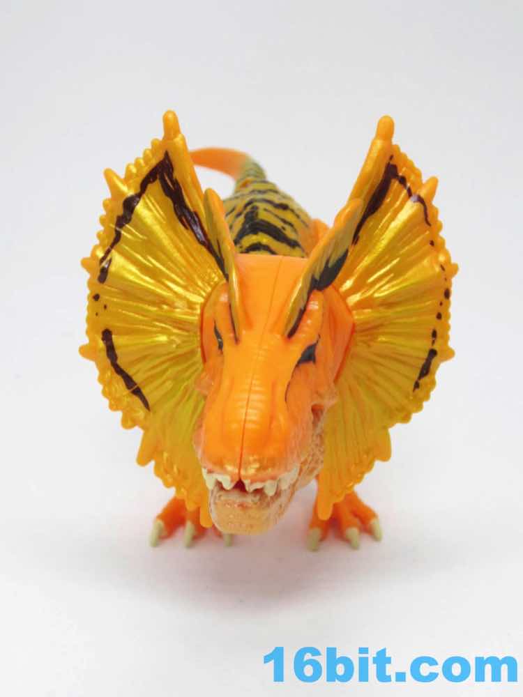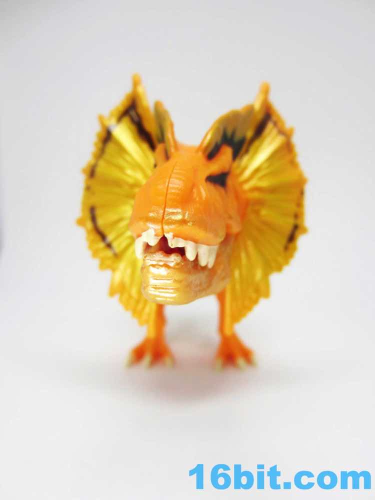 The JW tramp stamp is black, rather than gold like on the original prototype. She has a lot of paint including massive amounts of gold on the back, belly, brow, jaw, and frill. Black tiger stripes run down the body, plus you've got more detailing on the head and frill - plus teeth, the mouth, the eyes, and even the toe claws. They didn't skimp on this one. It pops at retail, especially after so many muted and drab colors from the movie year. Realism, shmealism - gimme the gold and orange one. It's 9-inches long from nose to tail, with the frill giving it a more interesting profile that looks less like a fried chicken drumstick with feet. My sample has no problems standing - heck, the original T-Rex didn't either - but I will say the tiny arms are rendered almost invisible by being hidden behind the frill. I could say it's ridiculous to not have the visible arms, but really, is that where I need to pick apart the day-glo orange dinosaur with metallic gold on its neck? No.