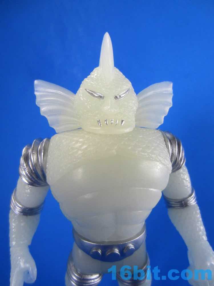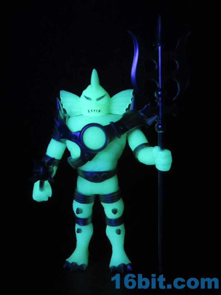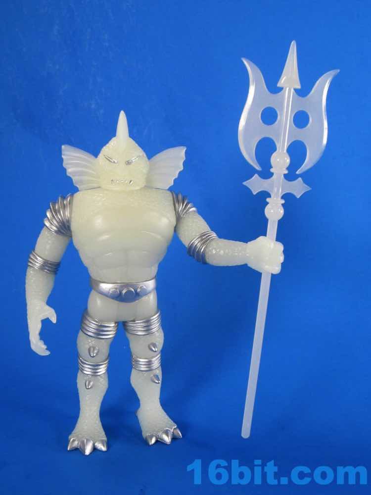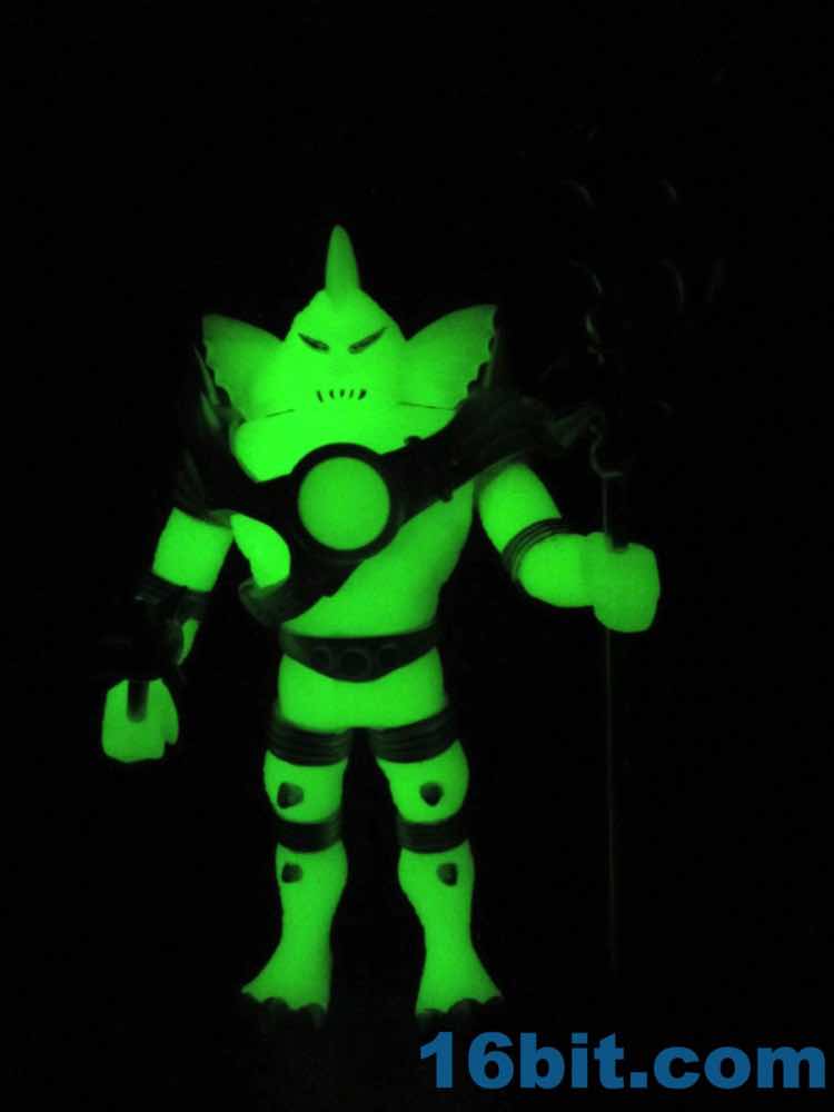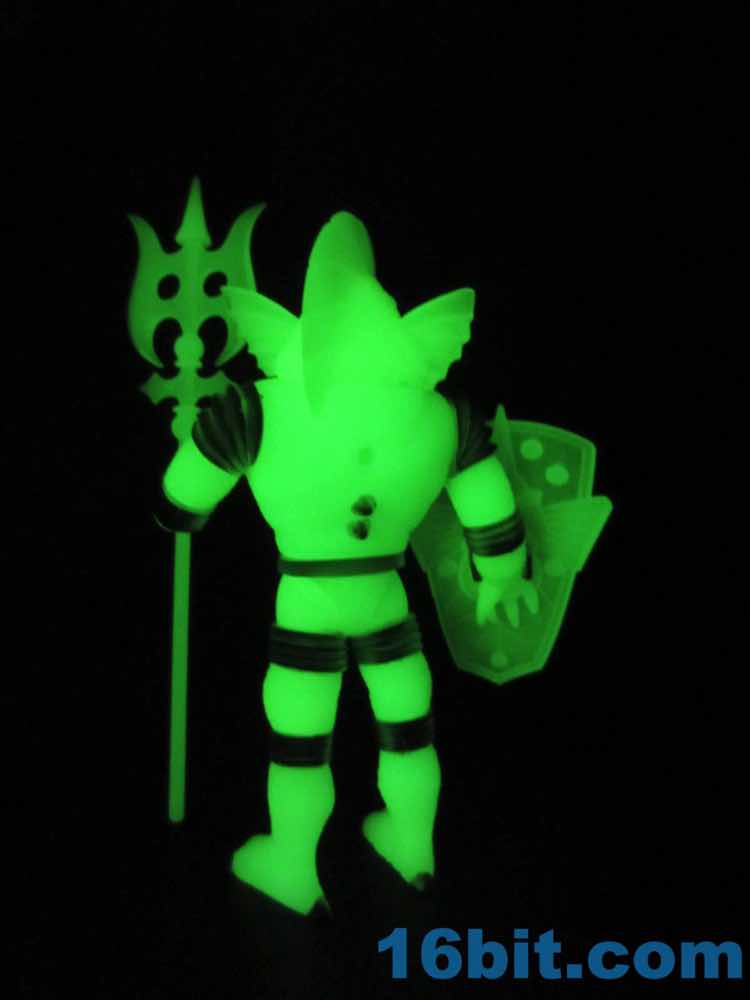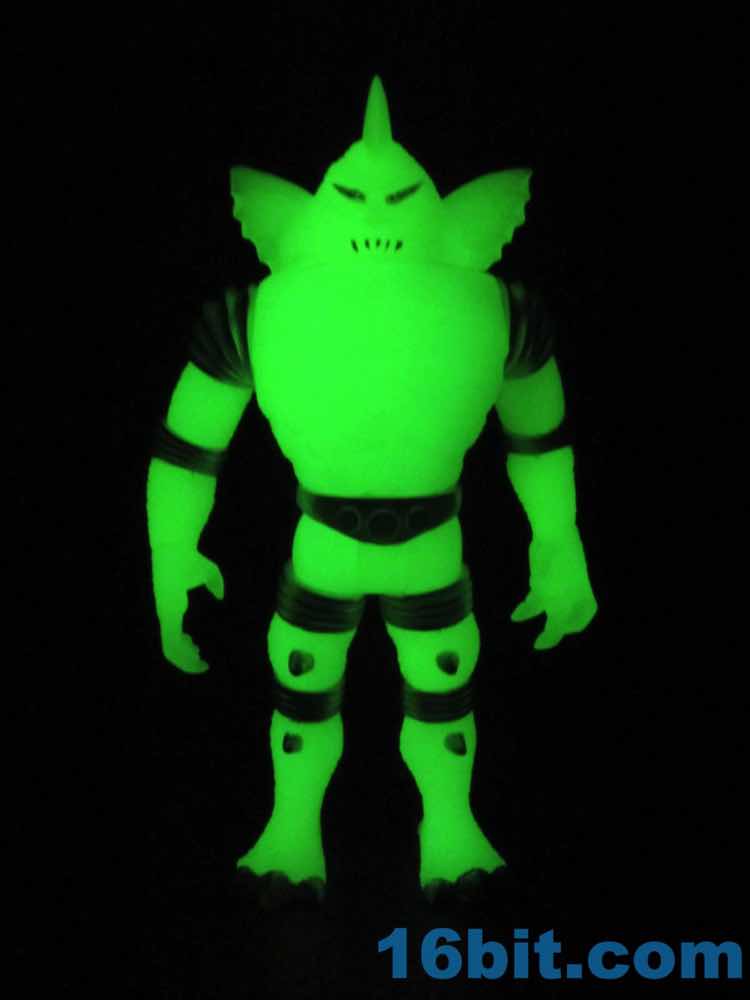 The figure seems to have the same sculpted detail as his siblings, with an astonishing quantity of sculpted scales that undoubtedly took days if not weeks of work to accomplish. On the recent Colossus Rex 2.0, the light metallic paint makes each scale pop to life even in a dark basement office. Glow in the dark paint is much crueler - it absorbs light in so many ways, meaning it's a bit tougher to see all the work that the The Outer Space Men, LLC put in to these sculpts from a few years ago. It's a lovely figure with amazing glowing power, and pigment changes everything. The most recent painted figure looked like a fish man jungle gladiator thanks to the shine, while this one looks like a ghostly monster. Fishman Junglegladiator, of course, was also Nick's aborted attempt to make an edgy cable show in the wake of Spongebob's fame. (This is a lie.)