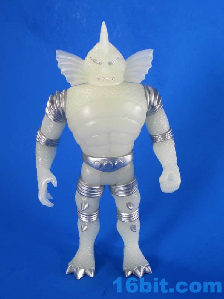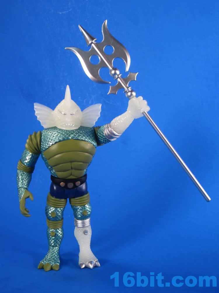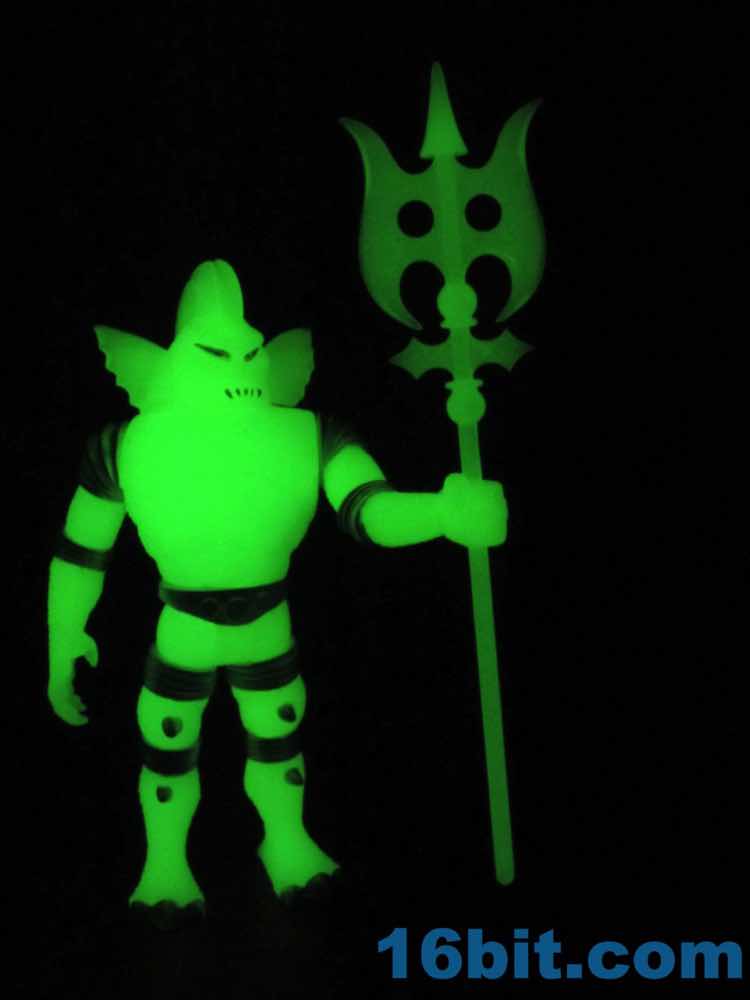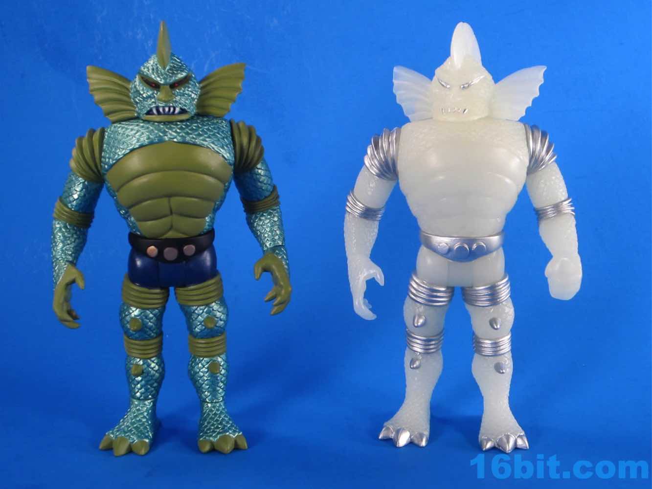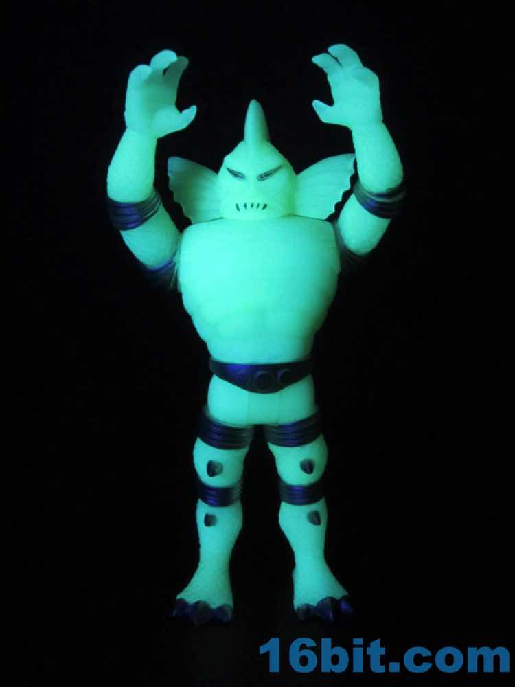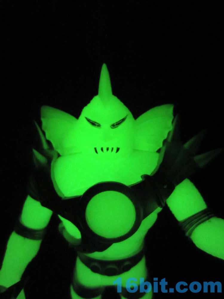 The figure seems to have the same sculpted detail as his siblings, with an astonishing quantity of sculpted scales that undoubtedly took days if not weeks of work to accomplish. On the recent Colossus Rex 2.0, the light metallic paint makes each scale pop to life even in a dark basement office. Glow in the dark paint is much crueler - it absorbs light in so many ways, meaning it's a bit tougher to see all the work that the The Outer Space Men, LLC put in to these sculpts from a few years ago. It's a lovely figure with amazing glowing power, and pigment changes everything. The most recent painted figure looked like a fish man jungle gladiator thanks to the shine, while this one looks like a ghostly monster. Fishman Junglegladiator, of course, was also Nick's aborted attempt to make an edgy cable show in the wake of Spongebob's fame. (This is a lie.)