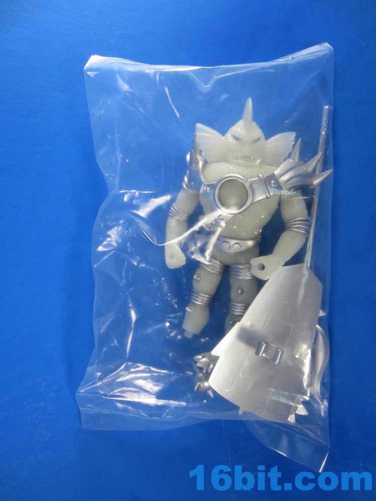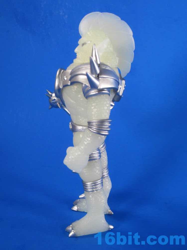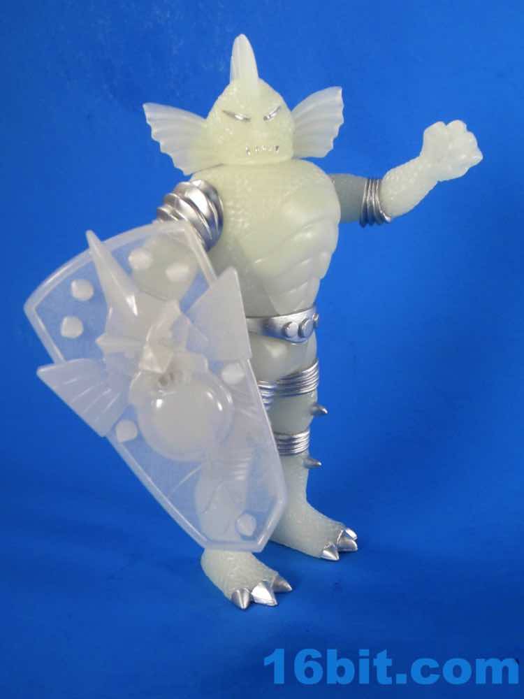 Matt Doughty of Onell Design shared with me their internal development nickname Colossus X, which came as a result of being Colossus Rex in the new Gamma-X colors. Sensible! Mel Birnkrant painted the original master, and it's a perfect sibling to the recent glowing Gamma-X figure. The entire figure and his armor is cast in glow plastic, while the shield, mace, and axe are cast in clear colorless plastic painted silver. Do not scrape them - it's clear underneath. The shield's wrist clamp is cast in glow plastic, but has been completely dunked in silver to match the weapon.